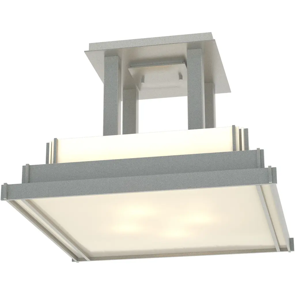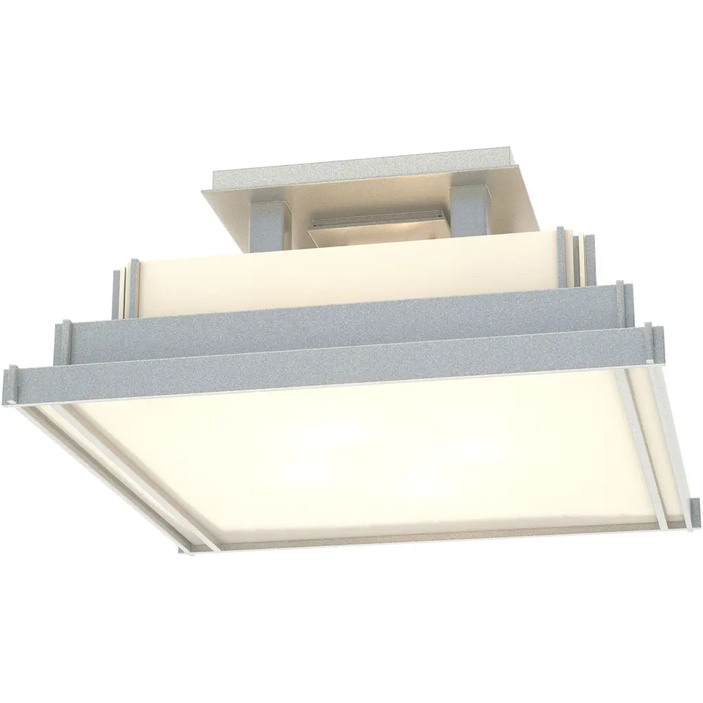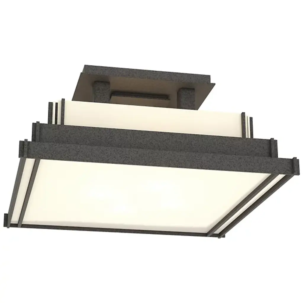 Our square ceiling light has a shape suggestive of the steppes of Asia and southeastern Europe with each steppe made of hand-forged, textured steel. Thin bands of steel border the art glass tying it to the design aspects of the Far East.