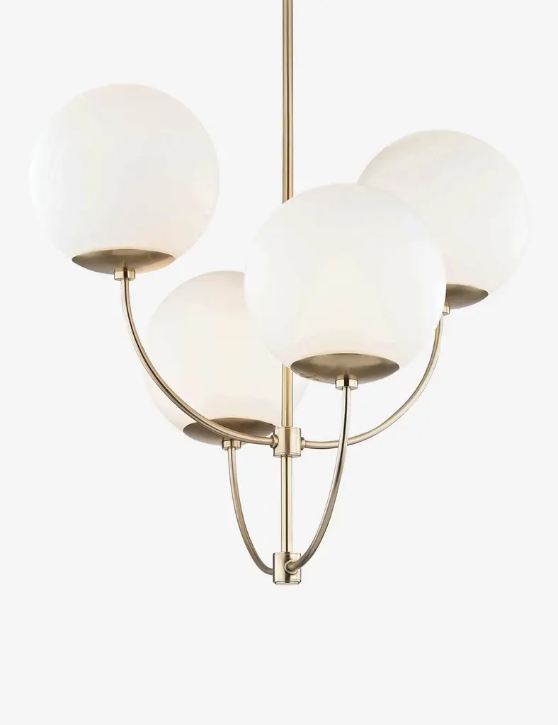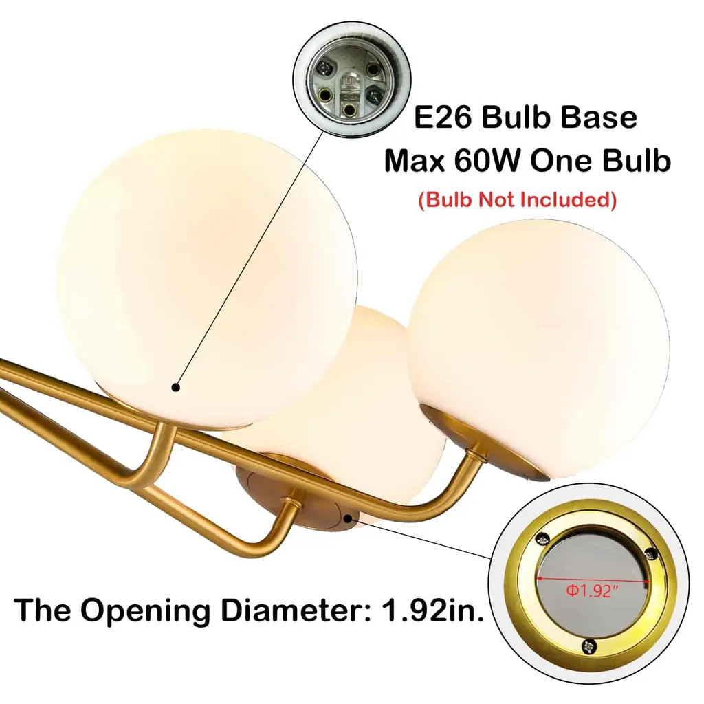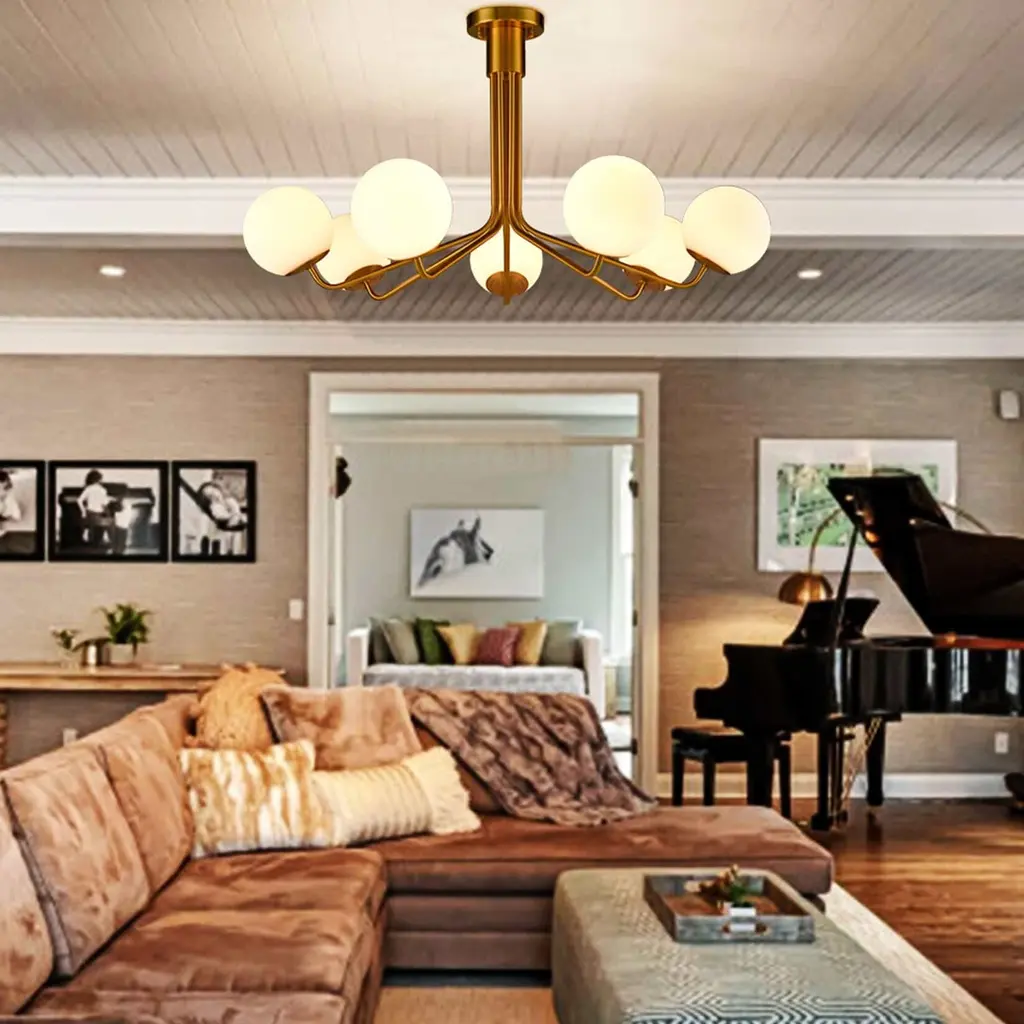 Flaunting a rustproof electrophoretic gold finish, the globe ceiling chandelier light spruces up your living space with a touch of sparkle. Crafted from impurity-free hand-blown opaque opal glass, it provides the perfect blend of mid-century classic and contemporary elements. Five glass shades are supported by gracefully curved arms, conveying a refined touch. Its globe shades contrast the gold finish and add alluring visual interest to the living area.