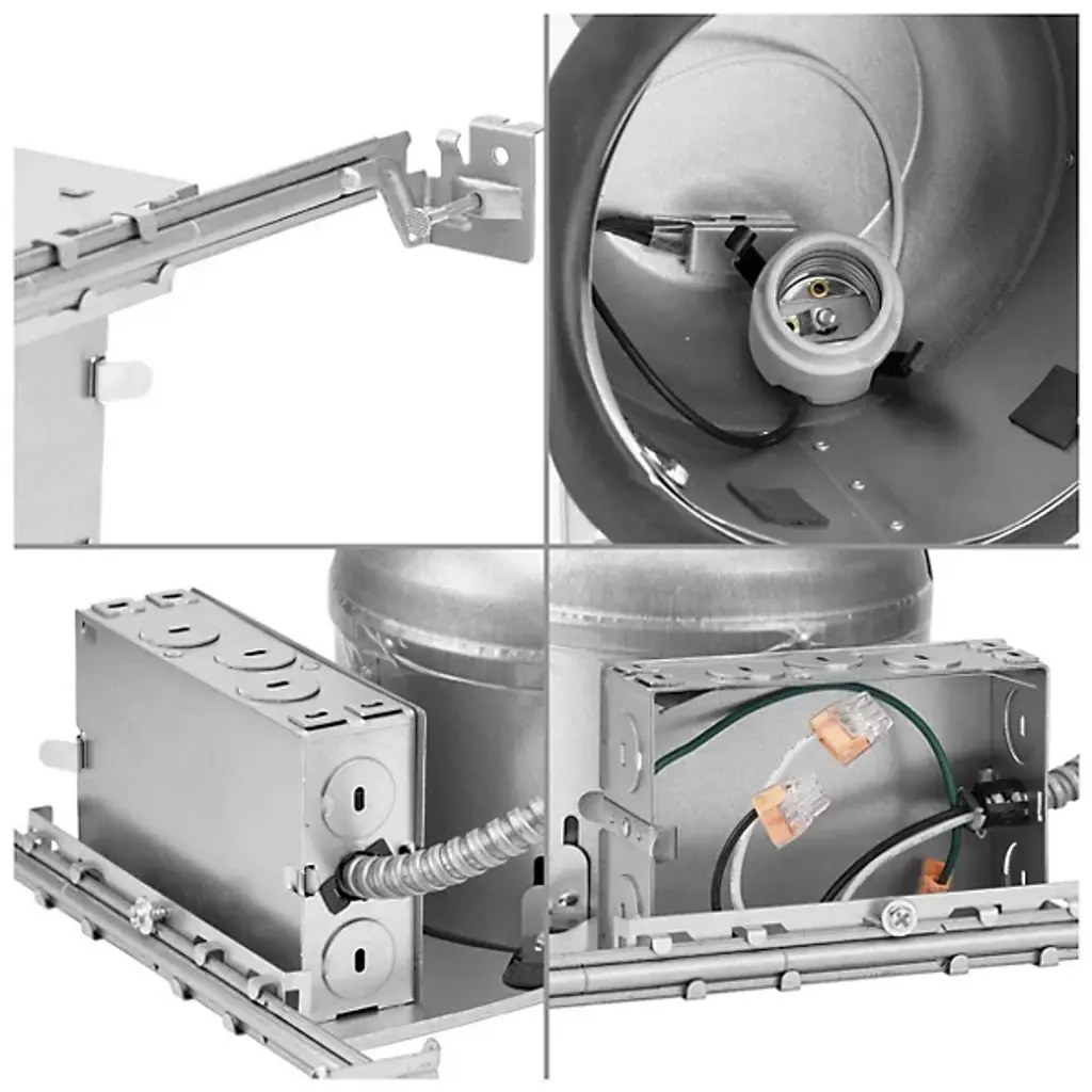 Huxe presents the Teagan 6" Recessed New Construction Shallow Airtight IC Housing. Sporting a Quick Link Connector, the shallow design is ideal for 2x6 construction applications. It is ideal for IC and non-IC new construction applications. Its gasketed Air-Tight housing restricts airflow from conditioned spaces into unconditioned attic space, preventing unnecessary HVAC costs and improving the overall home energy efficiency. The housing and frame are constructed from die-formed corrosion-resistant galvanized steel. The lamp housing compartment can be adjusted to fit ceiling thicknesses from ½ in. to 1 ¼ in. The bar hangers have a maximum span of 24 in. It is UL and CUL listed for damp locations and is thermally protected against improper use of lamps.