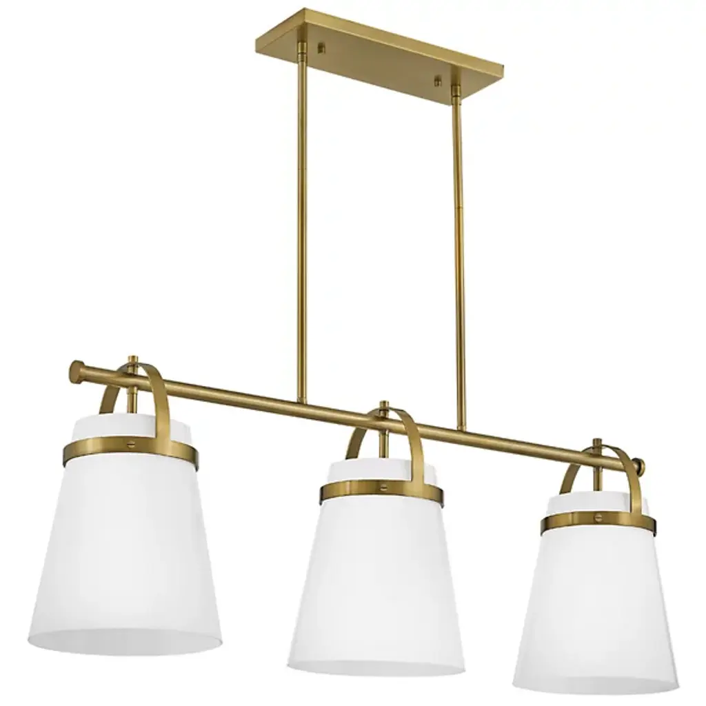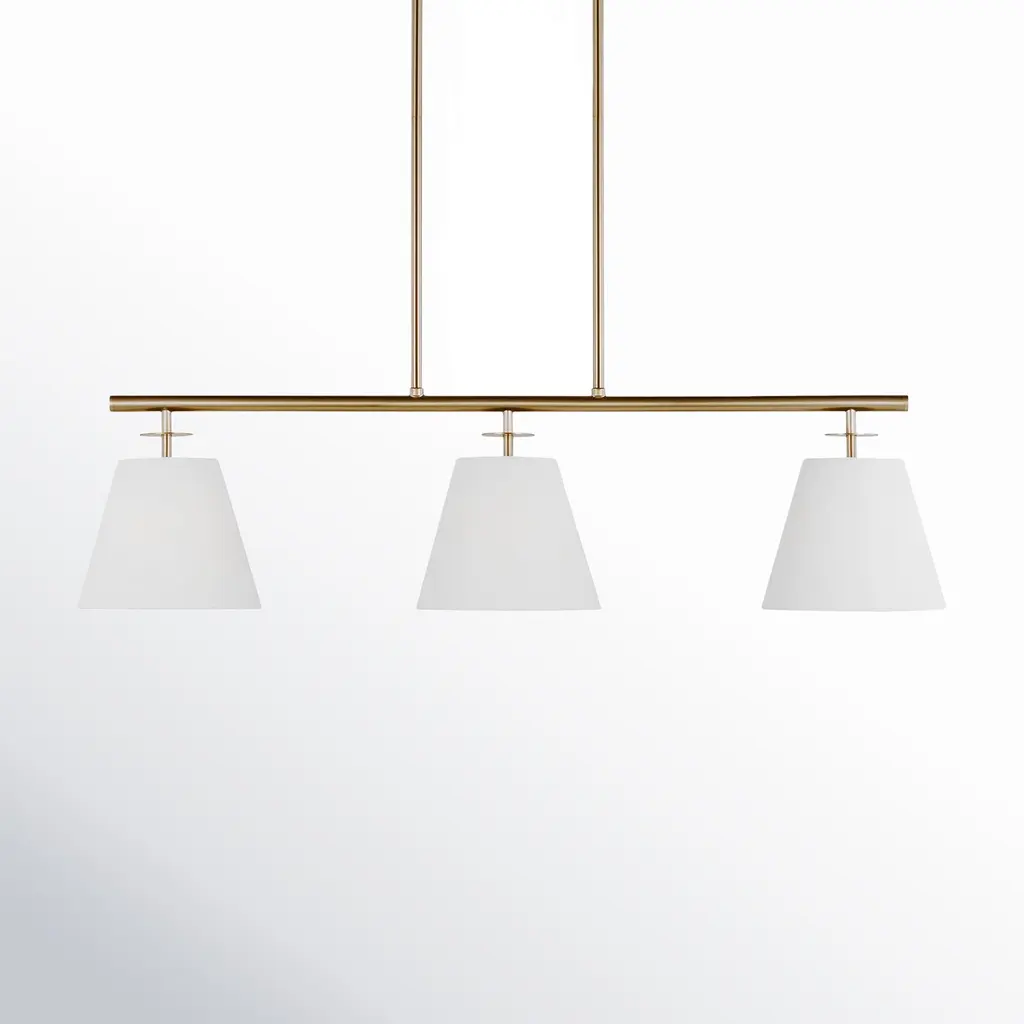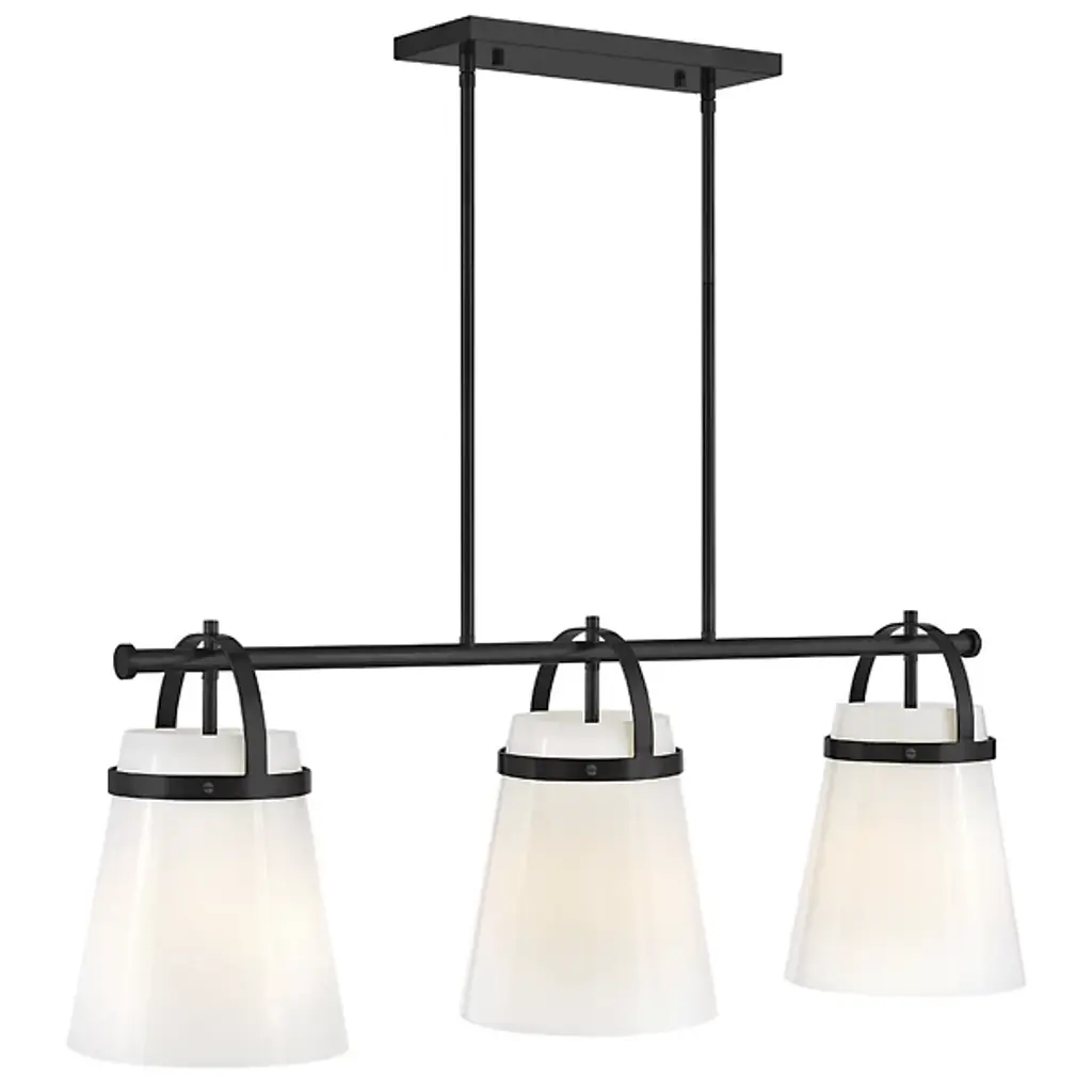 The Tori Linear Suspension presents one’s kitchen or dining spaces with delightful containers brimming with cozy illumination. This transitional piece looks sharp in the room as it hangs with a series of tidy rods. The arching hardware of the shades top the crossbar in lovely accents. These accents catch the eyes against the pristine white hue of the shades. The tapered drum shades display a soft warmth on their surfaces. They filter and rain down an even stream of illumination.