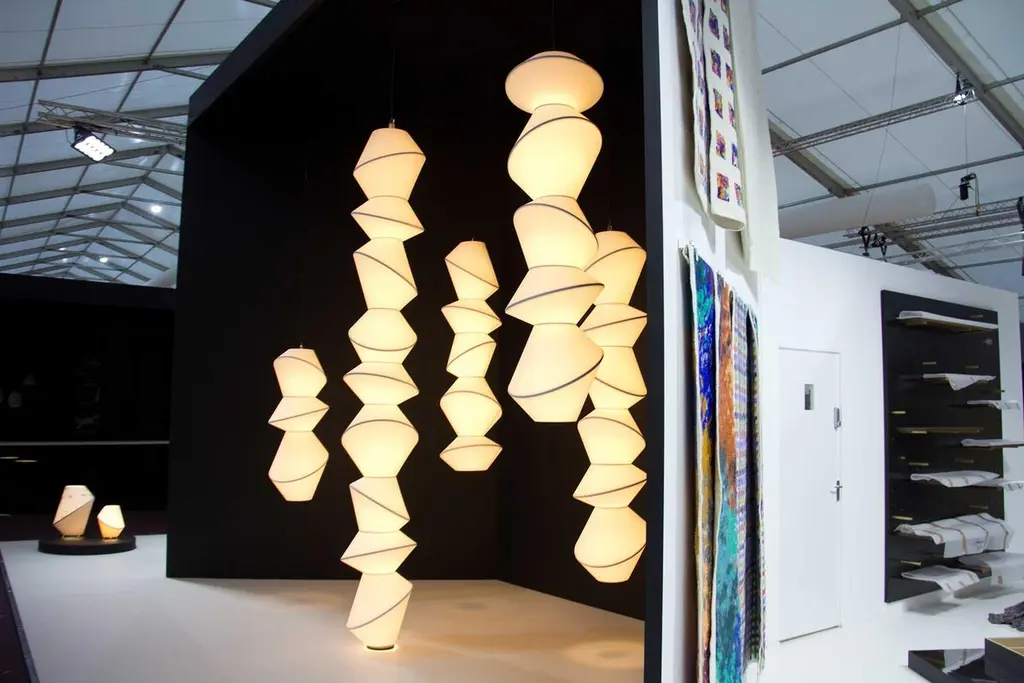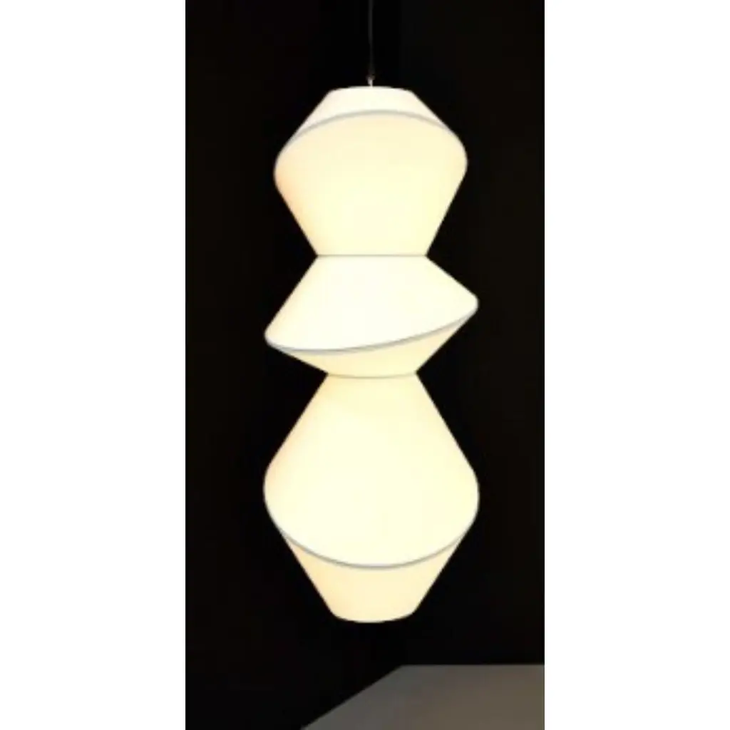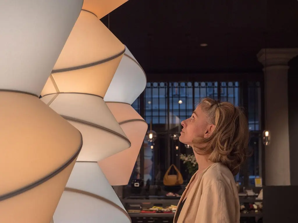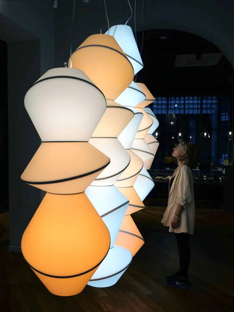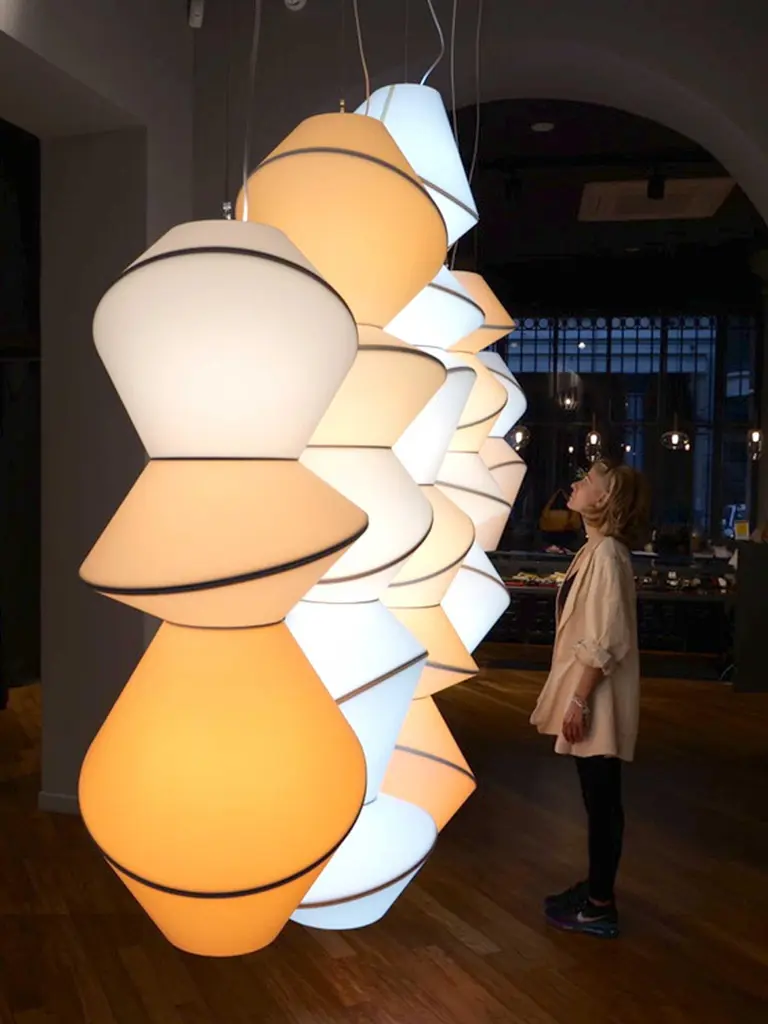Totem 3 pieces ceiling lamp by Merel Karhof and Marc Trotereau.Dimensions: D50 x H110 cm.Materials: Cotton laminated on pvc, powdercoated steel rings.ShadeVolume - The Forest‘ShadeVolume: The Totem’. A slowly rotating light installation made with the ShadeVolume collection. 18 lampshades connected together create a 3m50 tall totem. This enlightened sculpture revolves slowly in the space revealing the diversity of shapes. All our lamps can be wired according to each country. If sold to the USA it will be wired for the USA for instance.Merel Karhof (Netherlands, 1978) is a designer of objects and installations, whose practice bridges the fields of design, sustainability and storytelling. She is a graduate of the Royal College of Art, (Design Products MA) and the Design Academy Eindhoven (Man and Leisure BA).Her work process blends a scientific approach with storytelling to develop poetic designs for the living environment. Karhof’s objects make for example the potential of wind energy and energy harvesting tangible. At the core of her oeuvre we find a series of wind made objects from upholstered furniture to knitted scarves, created with the ‘Wind Knitting Factory’, a wind-powered knitting machine. But as well we see a windmill brooch, which is not just a piece of jewellery, but also a producer of energy and a green striped scarf that reveals the daily changing colour of the water in Venice.Karhof has presented her work in exhibitions in London, Milan, Venice and China. In 2011, the Kentucky Museum of Art and Craft, purchased her work and recently the Zuiderzeemuseum bought her ‘Tanning-Laboratory’ for their permanent collection. She is also co-founder of lighting design label ‘ShadeVolume’ and currently she teaches at the London College of Fashion.