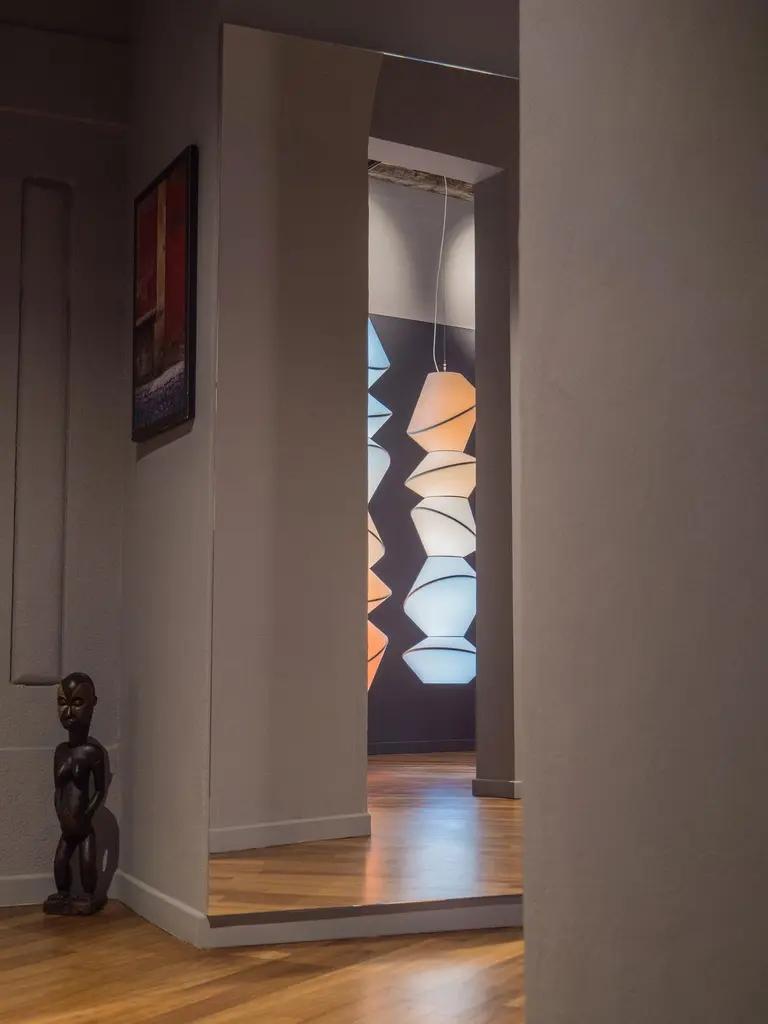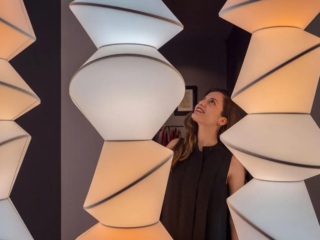 Totem 4 pieces ceiling lamp by Merel Karhof and Marc TrotereauDimensions: D50 x H138 cmMaterials: Cotton laminated on pvc, powdercoated steel rings.ShadeVolume 'The Kelvin Series'‘The Kelvin Series’, five enlightened Totems in a gradient from red to blue. The gradient on the Totems reproduces the kelvin colour chart, which is obtained using ordinary light bulbs with various colour temperatures. It results in a surprising variety of colours that celebrate the daily natural and artificial lights surrounding us.All our lamps can be wired according to each country. If sold to the USA it will be wired for the USA for instance.Merel Karhof (Netherlands, 1978) is a designer of objects and installations, whose practice bridges the fields of design, sustainability and storytelling. She is a graduate of the Royal College of Art, (Design Products MA) and the Design Academy Eindhoven (Man and Leisure BA).Her work process blends a scientific approach with storytelling to develop poetic designs for the living environment. Karhof’s objects make for example the potential of wind energy and energy harvesting tangible. At the core of her oeuvre we find a series of wind made objects from upholstered furniture to knitted scarves, created with the ‘Wind Knitting Factory’, a wind-powered knitting machine. But as well we see a windmill brooch, which is not just a piece of jewellery, but also a producer of energy and a green striped scarf that reveals the daily changing colour of the water in Venice.Karhof has presented her work in exhibitions in London, Milan, Venice and China. In 2011, the Kentucky Museum of Art and Craft, purchased her work and recently the Zuiderzeemuseum bought her ‘Tanning-Laboratory’ for their permanent collection. She is also co-founder of lighting design label ‘ShadeVolume’ and currently she teaches at the London College of Fashion.