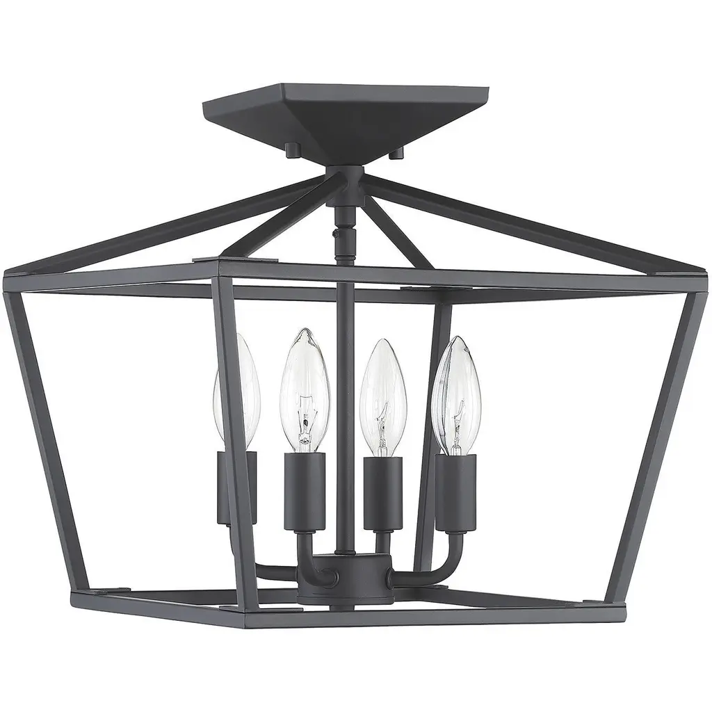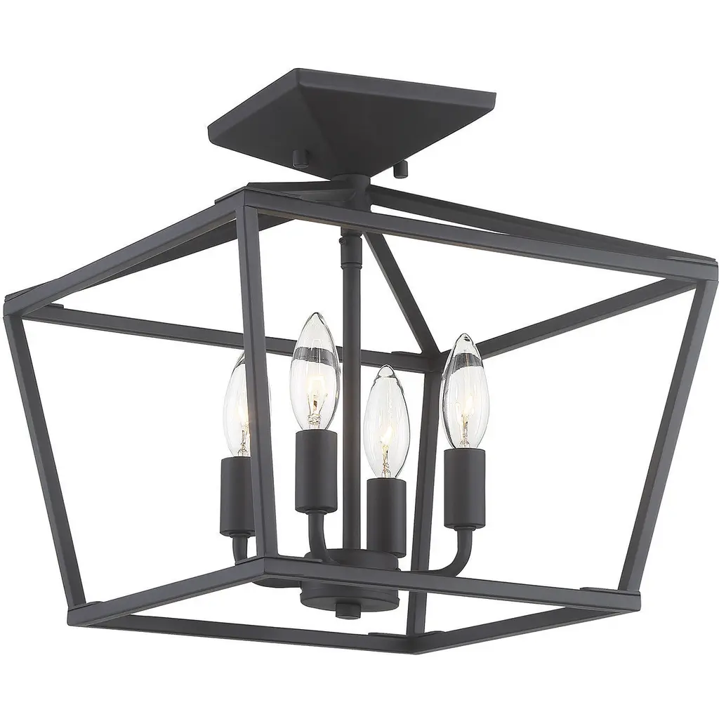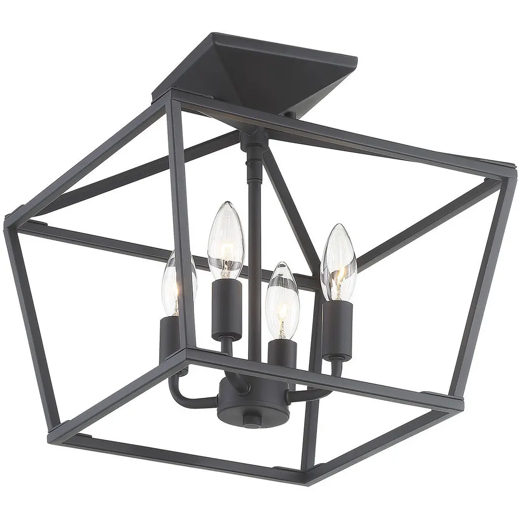 When you have a traditional aesthetic and want to inject a sense of modernism, choose this Townsend ceiling fixture. Its a classic lantern style with the familiar vintage appeal of colonial or old English candle fixtures, but the open geometric frame and matte black finish create a delightful contemporary twist. This timeless quality blends very well with your traditional, transitional, bohemian, contemporary or modern farmhouse decor. Four lights within the open framework have metal candle covers and hold 60W candelabra size bulbs. The fixture is 13" wide and 13" high with a semi-flush mounting, making a superb fit for your dining room, kitchen, living room, entryway, bedroom, closet, family room, office, stairway or great room.