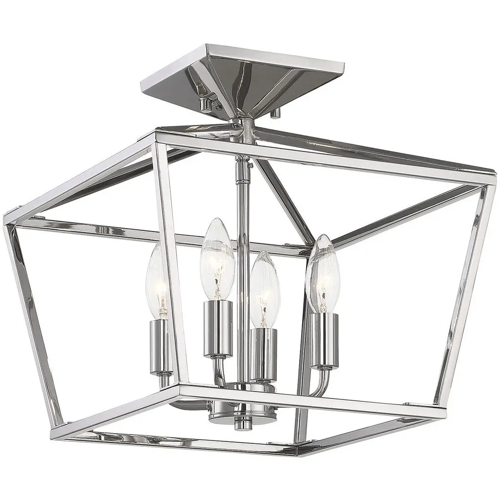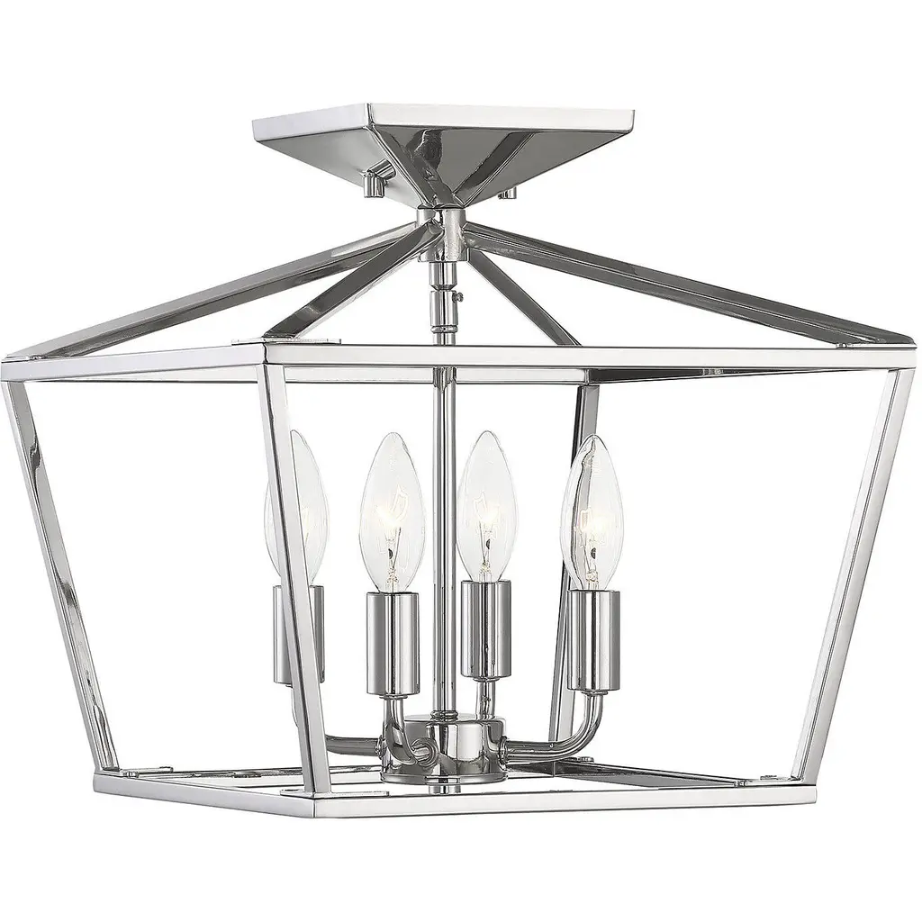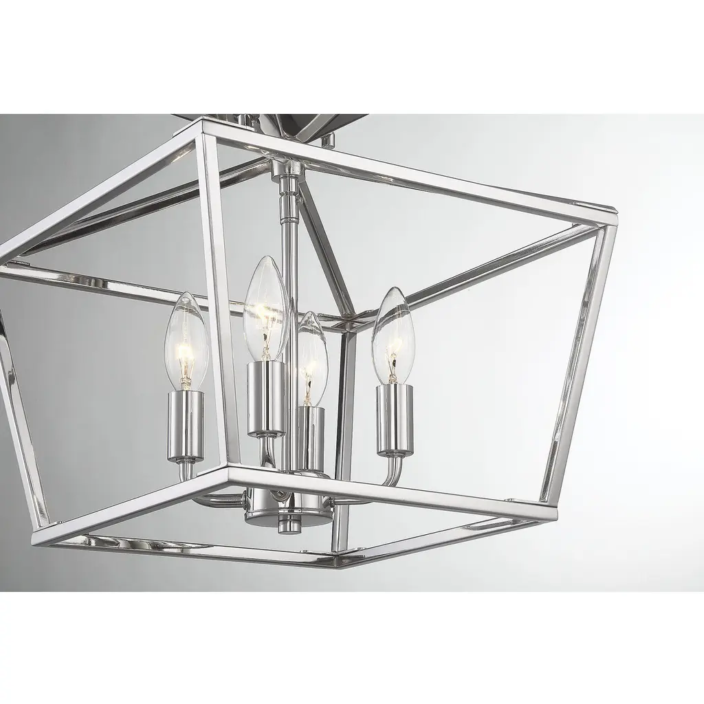 When you have a traditional aesthetic and want to inject a sense of modernism, choose this Townsend ceiling fixture. Its a classic lantern style with the familiar vintage appeal of colonial or old English candle fixtures, but the open geometric frame and polished nickel finish create a delightful contemporary twist. This timeless quality blends very well with your traditional, transitional, bohemian, contemporary or modern farmhouse decor. Four lights within the open framework have metal candle covers and hold 60W candelabra size bulbs. The fixture is 13" wide and 13" high with a semi-flush mounting, making a superb fit for your dining room, kitchen, living room, entryway, bedroom, closet, family room, office, stairway or great room.