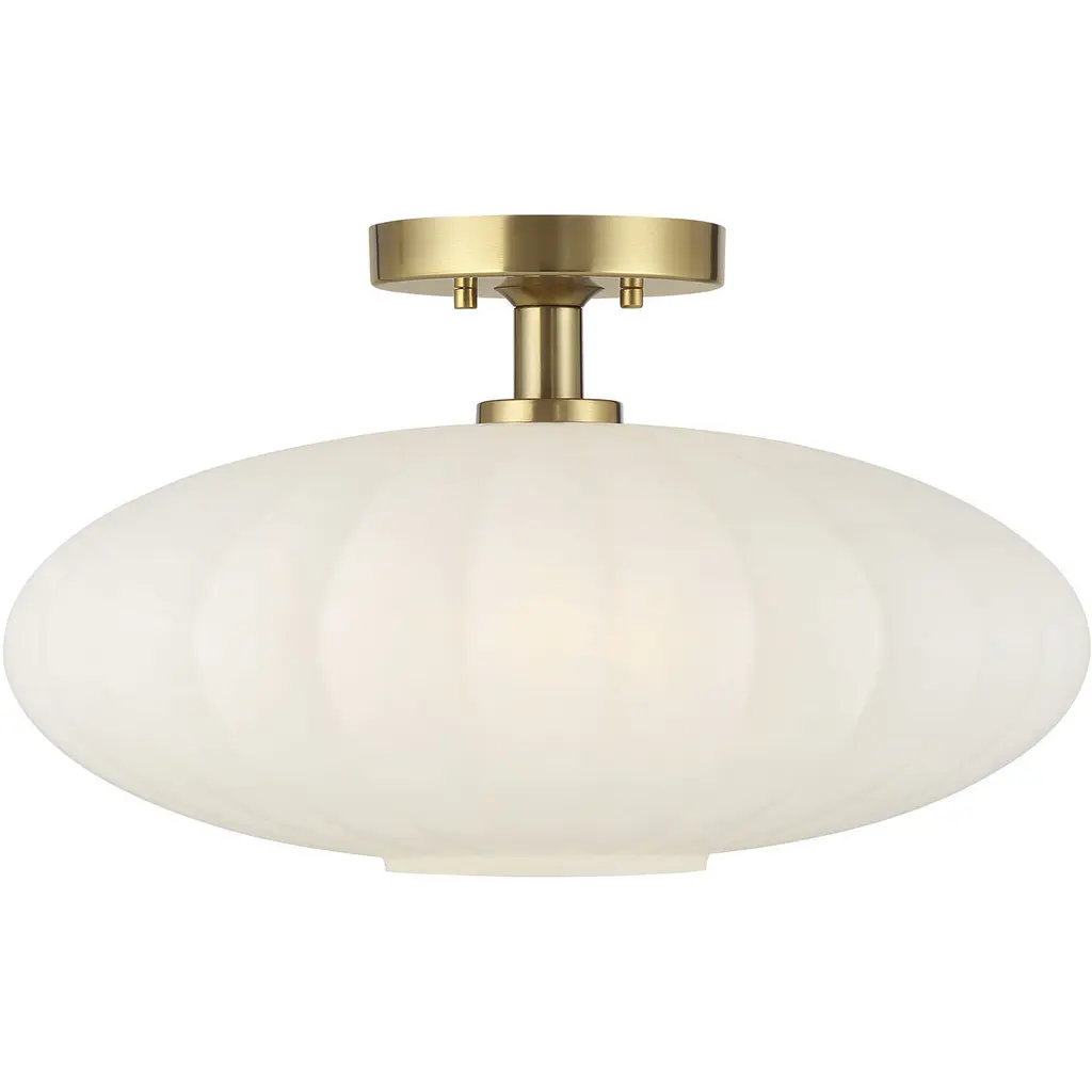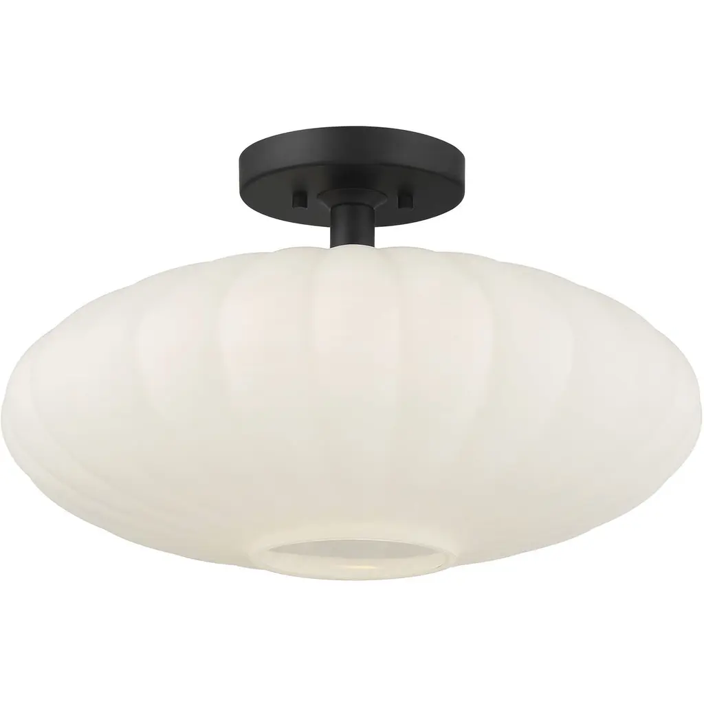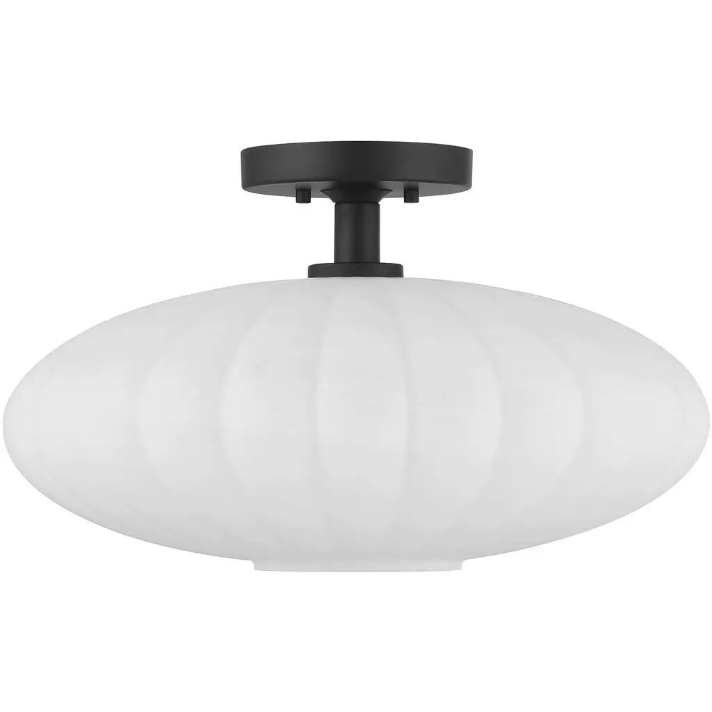 This 1-light ceiling semi-flush mount is an excellent way to boost the illumination in any room. Its ribbed white strie glass shade has a look inspired by the beauty of paper lanterns. The strie glass features dazzling swirls that draw the eye, soften the glow and work beautifully with the Matte Black finish. This ceiling light is 11" in height and 18" in width. Uses 1 standard size bulb of up to 60 watts. Bulb not included.