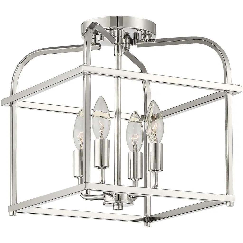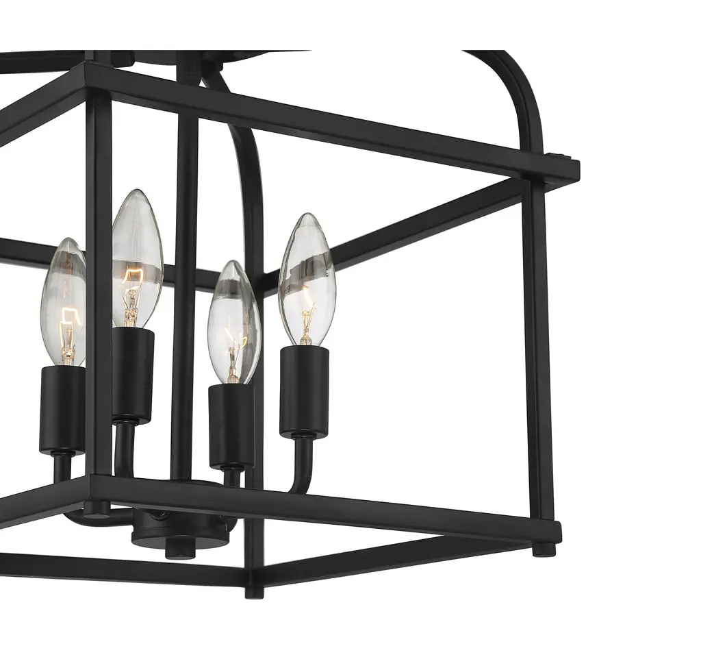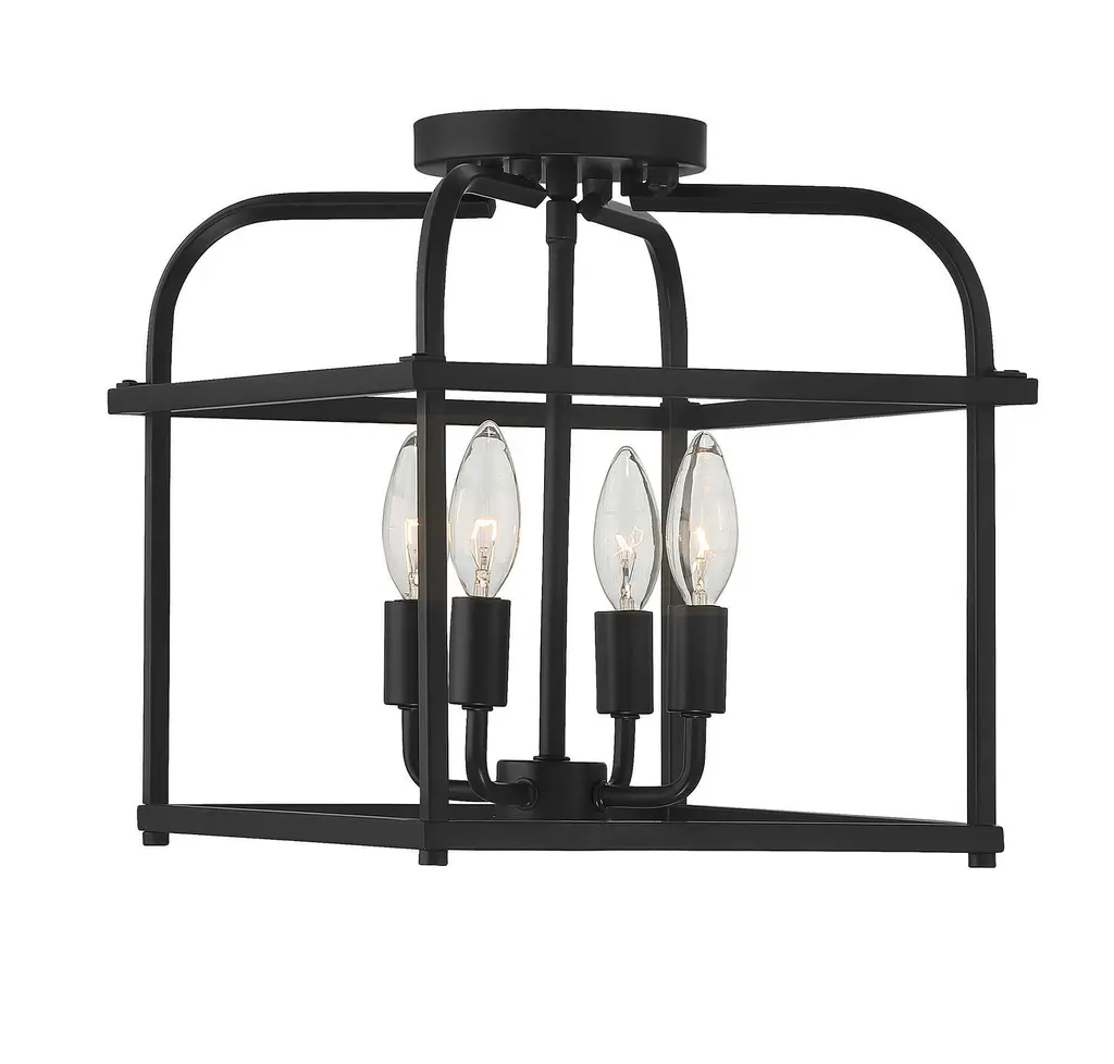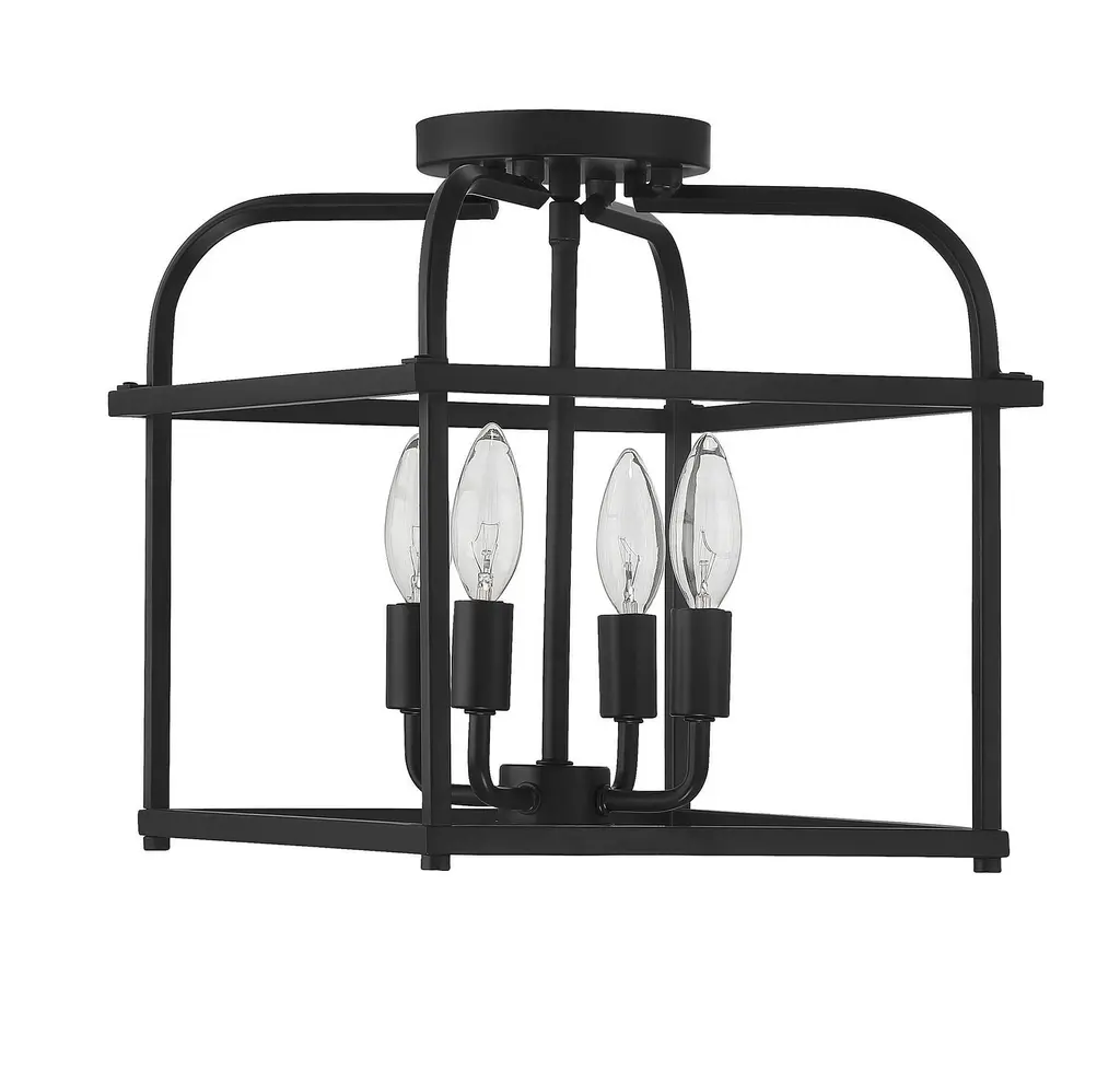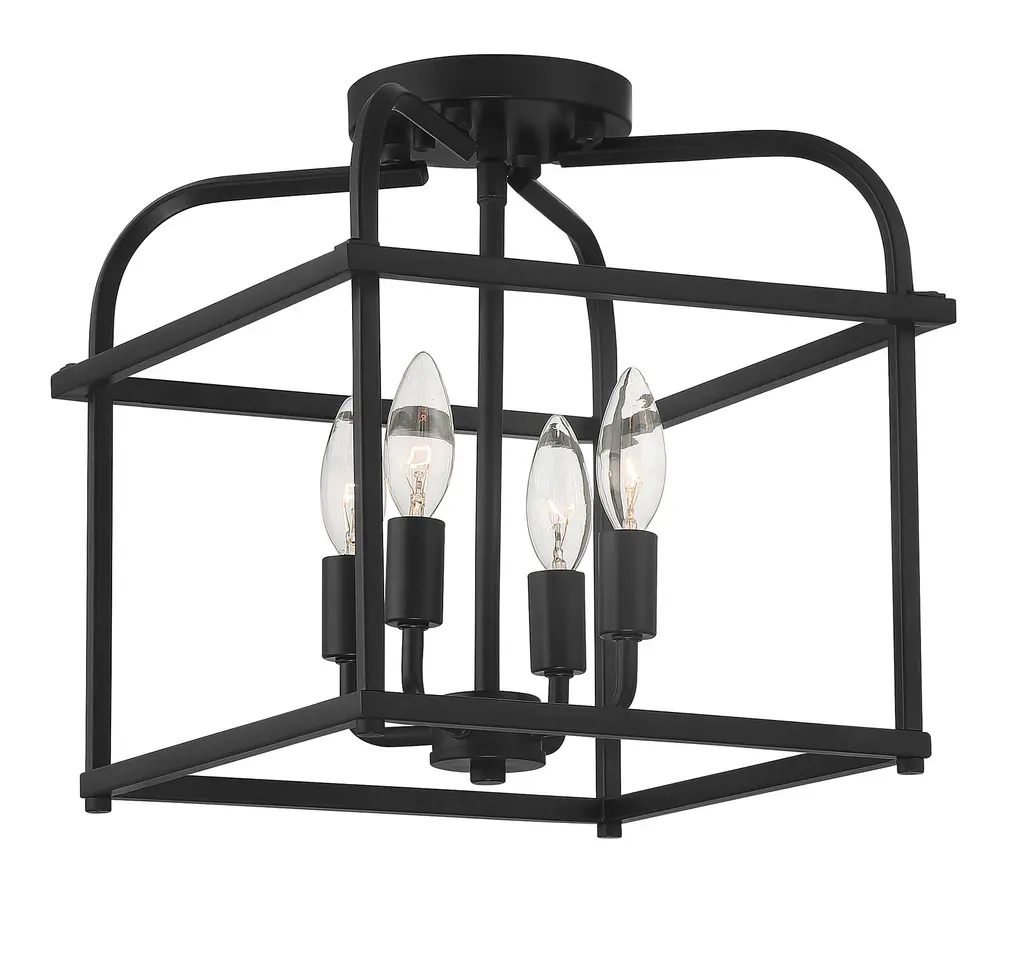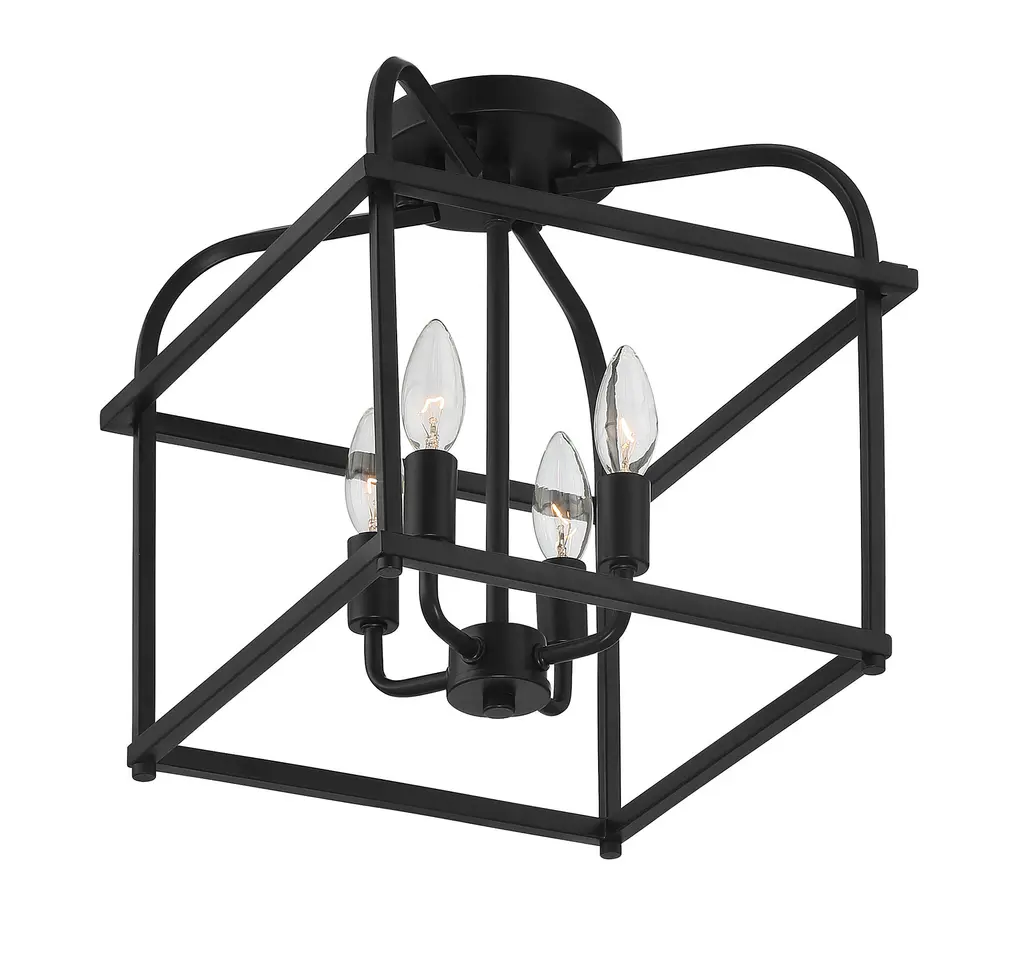 Go geometric in any room, even smaller spaces, with this 4-light ceiling semi-flush mount from Meridian Its cubic structure with curving upper arms allows for the lights within to shine brightly and create lighting beauty in rooms with transitional, contemporary or farmhouse decor styles. Finished in matte black. This ceiling light is 12.5" in height and 12" in width. This ceiling mount uses 4 candelabra size bulbs of up to 60 watts each, is LED compatible and is dimmable.