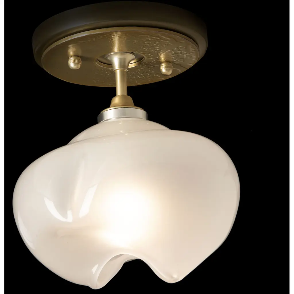 The Ume Semi-Flush features a single, exquisite glass shade that has the distinction of being glossy on the outside, yet frosted on the inside, creating a unique appearance, combined with its botanical shape. The Ume frosted glass, like its namesake Japanese plum blossom, has an elegant and sophisticated aesthetic and extends from the straight arm of this semi-flush mount. Available in all standard finishes.