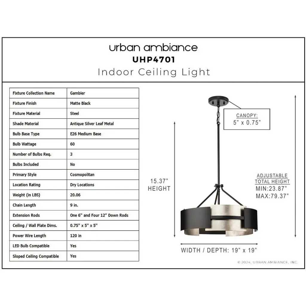 Urban Ambiance Luxury Cosmopolitan Indoor Ceiling Light, 15-3/8''h X 19"w X 19''d, Matte Black Finish, Uhp4701
