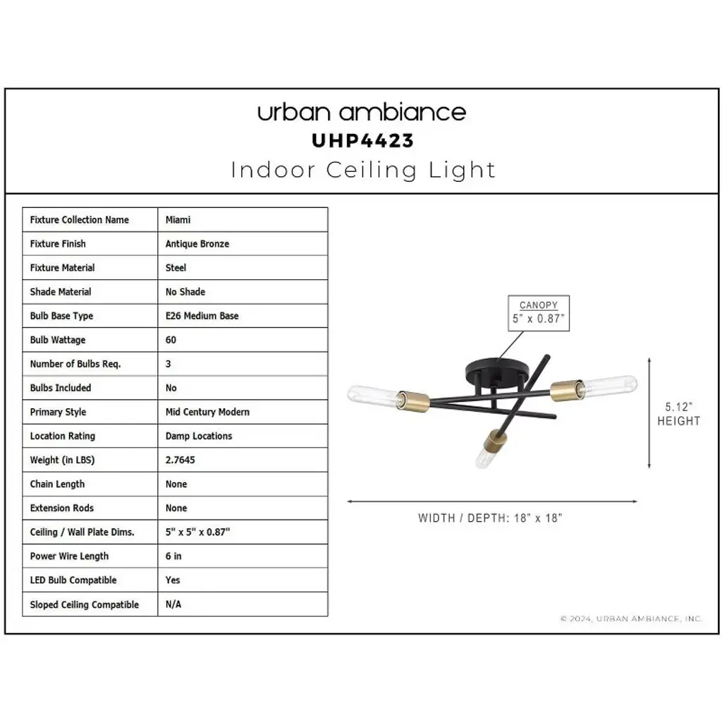 Urban Ambiance Luxury Mid-century Modern Indoor Ceiling Light, 5-1/8''h X 18"w X 18''d, Antique Bronze Finish, Uhp4423
