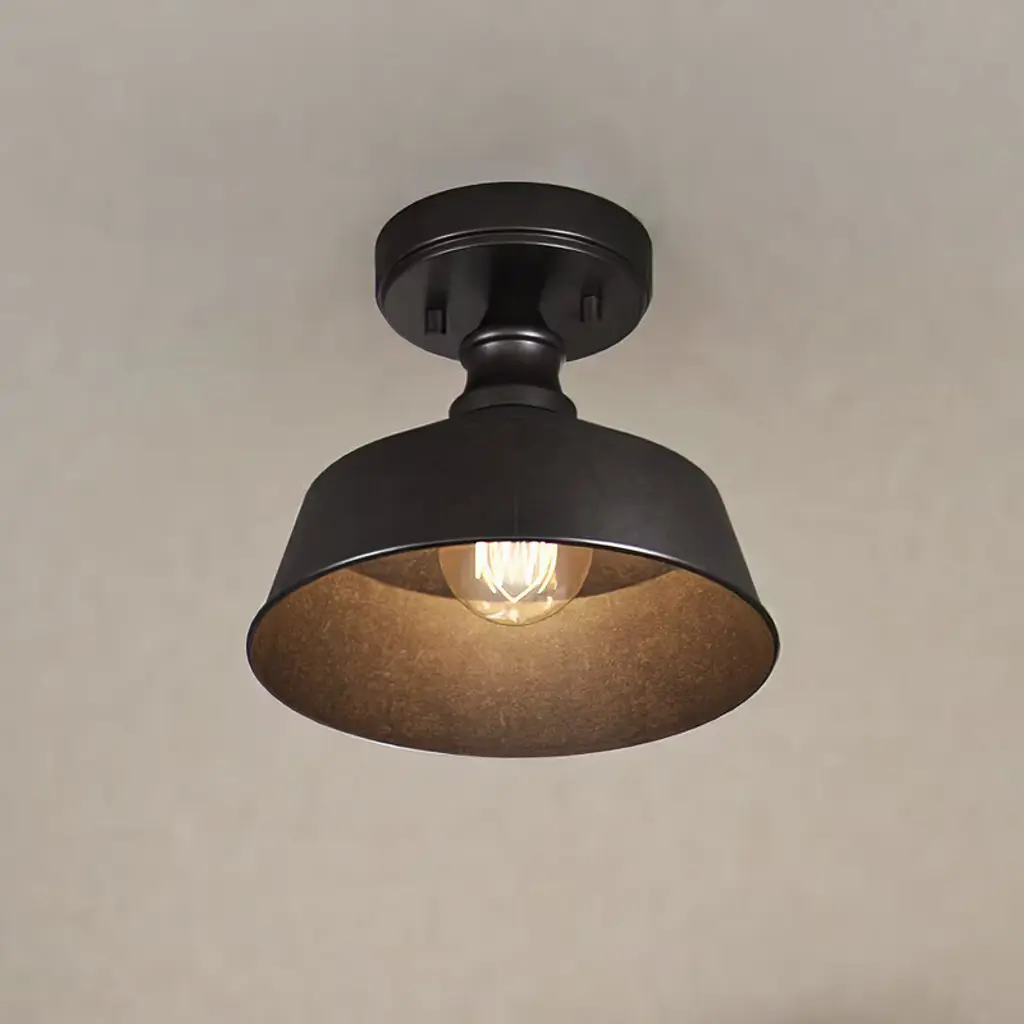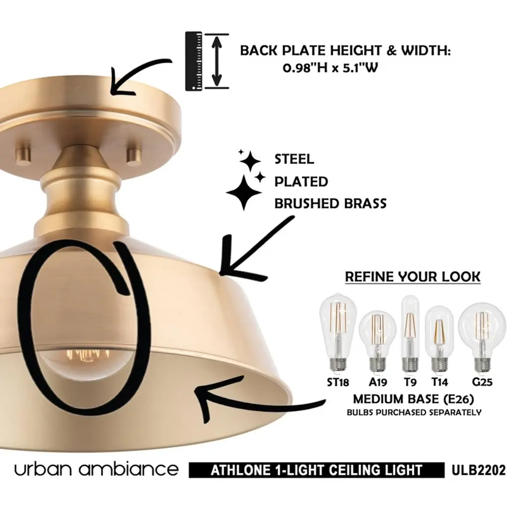 Embrace the Athlone 10-inch ceiling light, an easy choice for those seeking some rustic charm. These exceptional fixtures, available in brushed brass, brushed nickel, or dark bronze, exude a timelessness that effortlessly enhances any space. Their simple yet striking design showcases a single light semi-flush mount, boasting a farmhouse style creating comfort and character. A minimalistic design that offers a perfect balance of presence and subtlety makes the Athlone ceiling light a versatile option for various rooms. Whether adorning a bedroom, hallway, or even a cozy bathroom retreat, this ceiling light will be a focal point that casts a gentle and inviting glow. Built to mimic the bell-shaped lighting of yesteryear, these fixtures appear to suspend from a traditional bulb holder with its open shade facing downwards. The bowl-shaped shade leaves the bulb slightly exposed to deliver plenty of illumination.