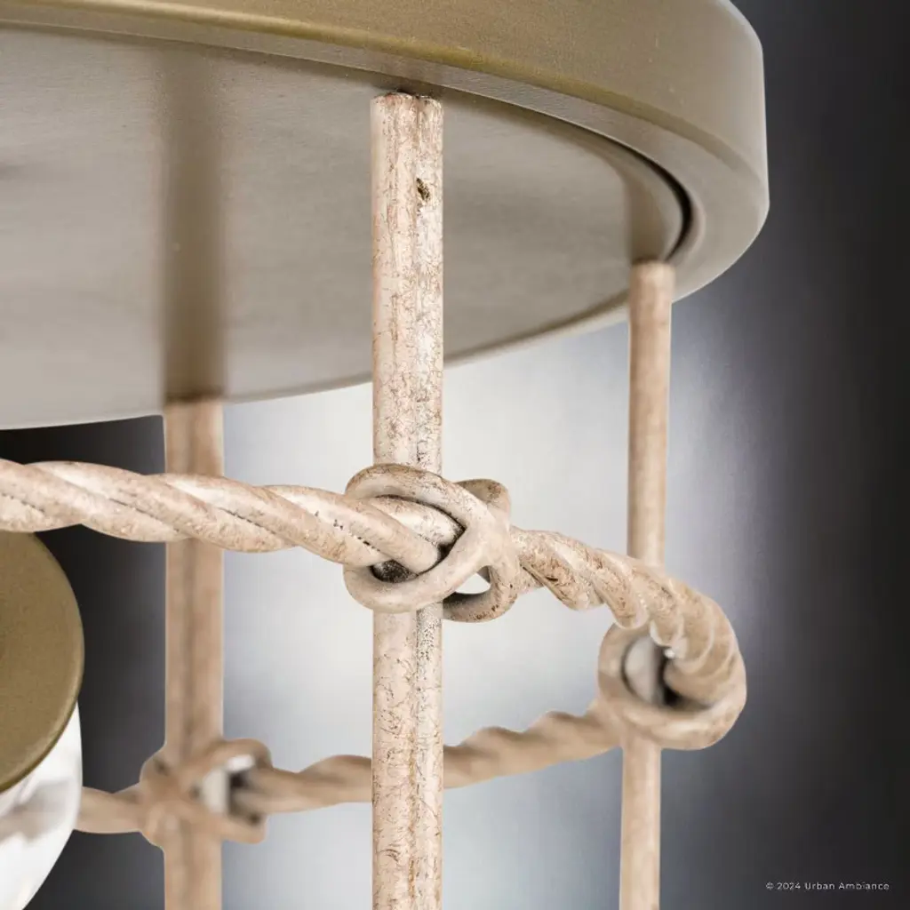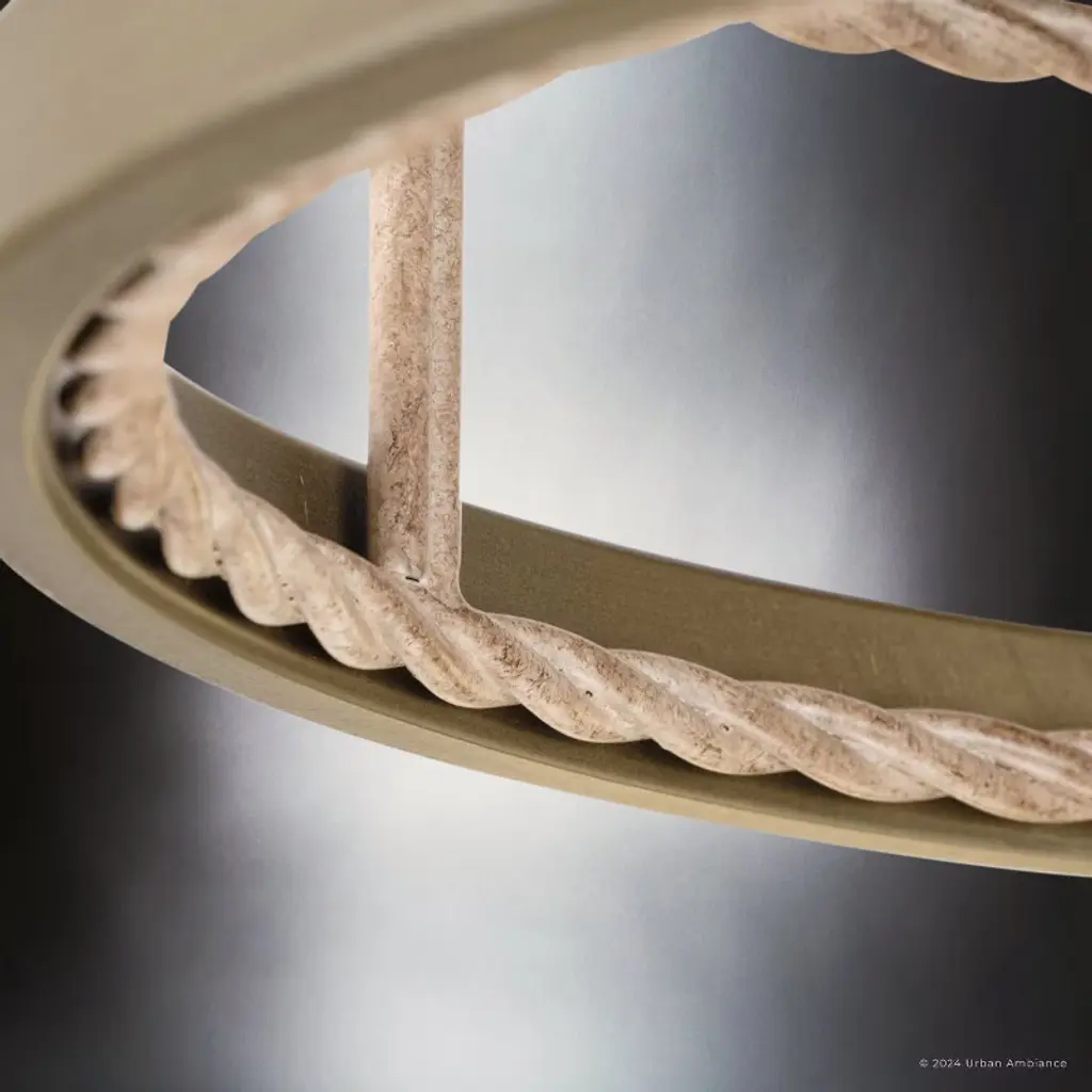 The Prague collection of light fixtures is characterized by its artistically crafted framework. Hand-forged metal rods make up a circular frame that comes finished in aged brass, offering a sophisticated detail to its style. Available as indoor chandeliers, ceiling lights, and pendant lights, the collection’s unique design works well with global, coastal, and transitional settings while providing diffused lighting to breakfast nooks, bedrooms, kitchens, halls, foyers and dining rooms. The indoor chandelier from the Prague collection is a sophisticated and modern light fixture with a distinctive design. It features either a cylindrical frame or a drum-shaped frame with vertical bars that encase the light bulbs, creating an open, cage-like structure. The chandelier is constructed with a metal frame finished in aged brass, providing a refined and elegant appearance. The vertical supports of the fixture are complemented with light-colored, rope-like detailing that adds a touch of texture and contrast. Inside the frame, multiple candelabra-style light bulbs are arranged in a circular formation, ensuring even distribution of light. The chandelier is suspended from the ceiling by a metal chain, which can be adjusted to the desired height. The Prague indoor pendant light and ceiling light, like the chandelier, are modern and elegant fixtures with a distinctive cylindrical design. They are designed to hold a single light bulb, which is prominently displayed through the open cage design. The pendant light is suspended from the ceiling by a metal chain, which can be adjusted to the desired height.