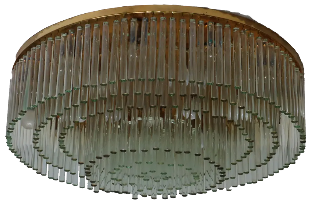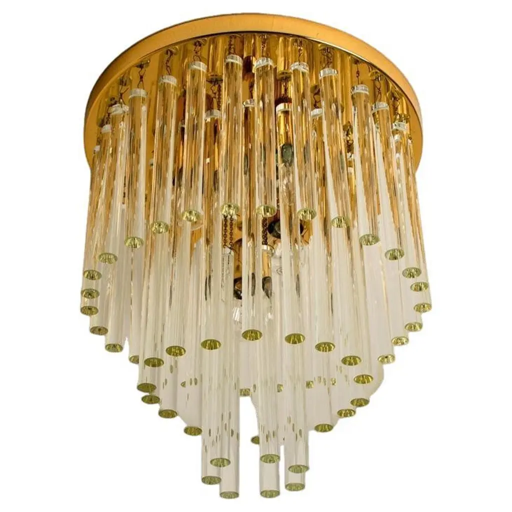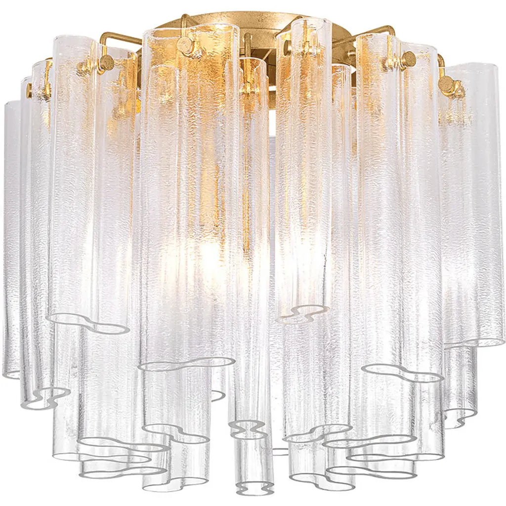 Mesmerizing Piastra glass tubes are layered in tiers to create the grand vision of Varenna. A soft, organic reimagining of an Art Deco silhouette, this flush mount comes in three sizes to create focal points in different-sized spaces. The sculpted waves in the specialty glass evoke an ethereal sense of movement while allowing for a more dynamic light diffusion. The close-to-ceiling canopy frames the fixture like a halo, finished in Vintage Gold Leaf.