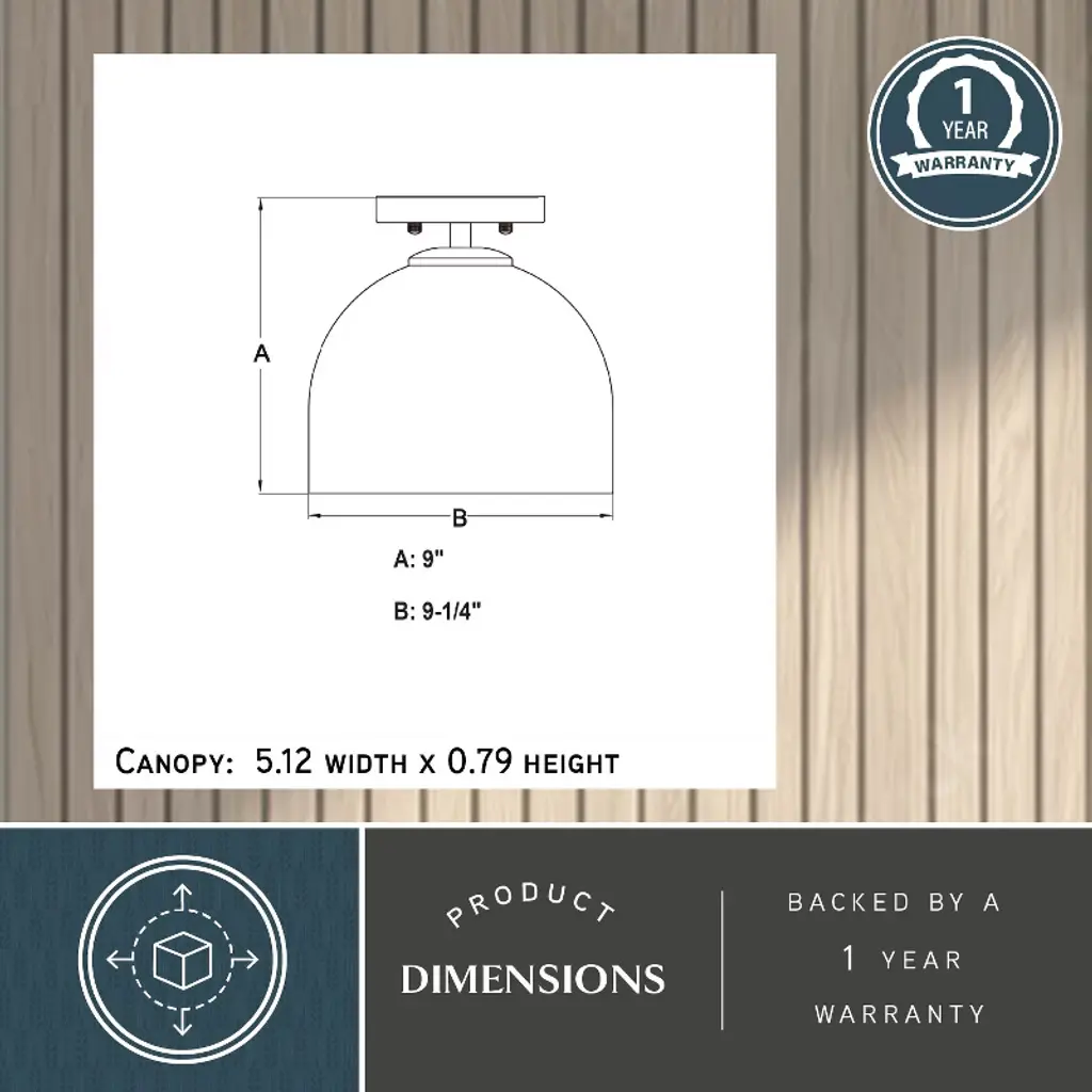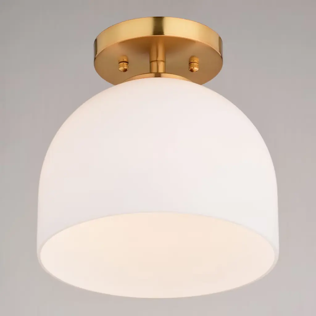 Illuminate your bedroom, bathroom, entryway, or hallway with the Shelby 1 Light Semi-Flush Mount. Its classic design and natural brass finish add a touch of timeless sophistication for both transitional and contemporary spaces. The elongated white dome-shaped glass shade emits a soft, diffused light, creating a warm and inviting atmosphere in any space.