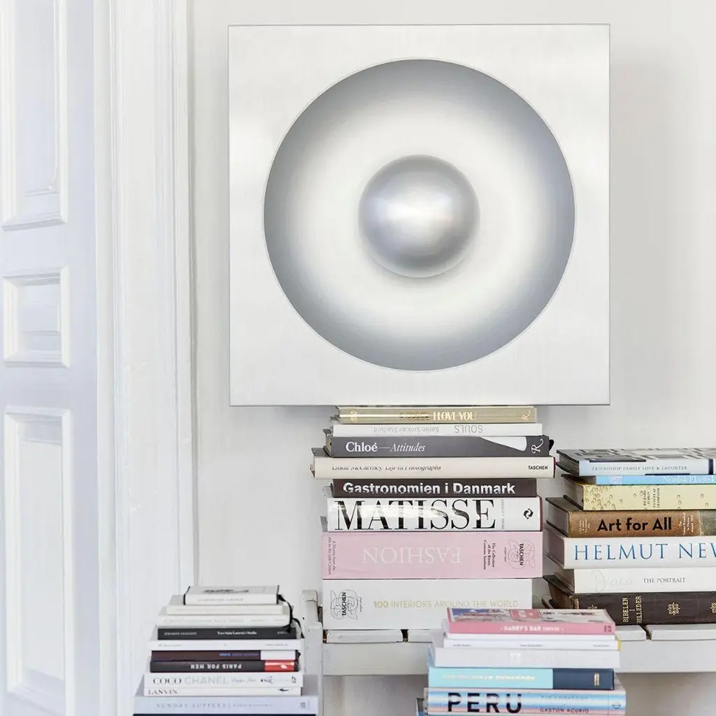 Verner Panton 'Spiegel' wall or ceiling lamp in brushed aluminum for VerpanVerner Panton was one of Denmark's most legendary modern furniture and interior designers. His innovative experimentation with new materials, bold shapes and vibrant colors shines through in his most iconic pieces, faithfully and sustainably re-editioned by Verpan since 2003. The 'Spiegel' lamp presents as an ideal avant-garde statement piece from Panton, fit for your modern contemporary space. Whether mounted on a wall, ceiling or grouped as a system the 'Spiegel' remains a beautiful architectural sculptural art piece that doubles as a lamp providing a soft ambient light. Featuring a centered hemispheric shade that conceals the bulb, the entire lamp is executed in brushed aluminum to the exacting standards of Verpan using the finest materials available.Price per item. Available in unlimited quantities.In stock lead time 2-4 weeks. Out of stock can add an additional 8 weeks or more. Please note that lead times, cost and inventory availability are subject to change without notice. Please contact us for current lead times prior to placing time sensitive orders.Accommodates single candelabra base E12 bulb (bulb not included). Max 60 watt, lower with incandescent. Can either be hardwired or plugged in via the 8.2' black fabric cord with integrated switch. This lamp is UL listed.Made to order. All sales are final.
