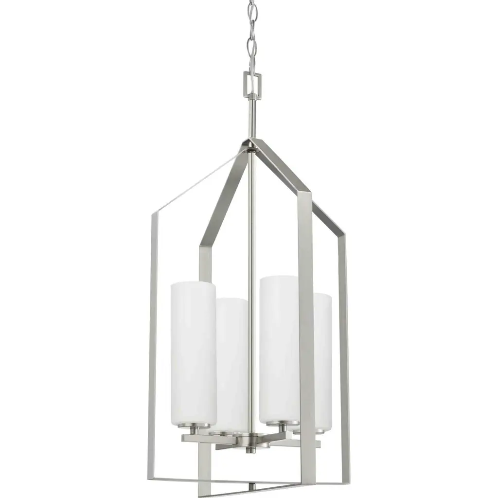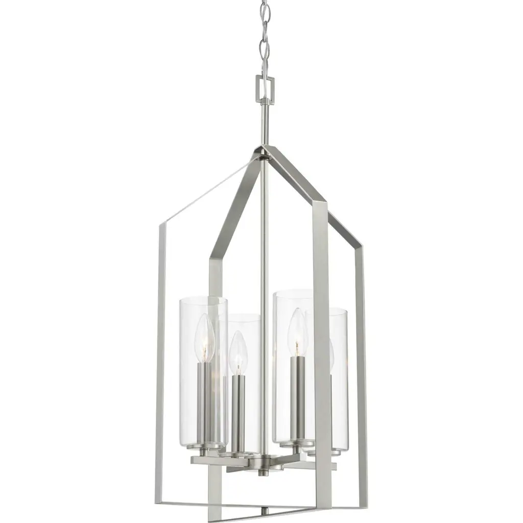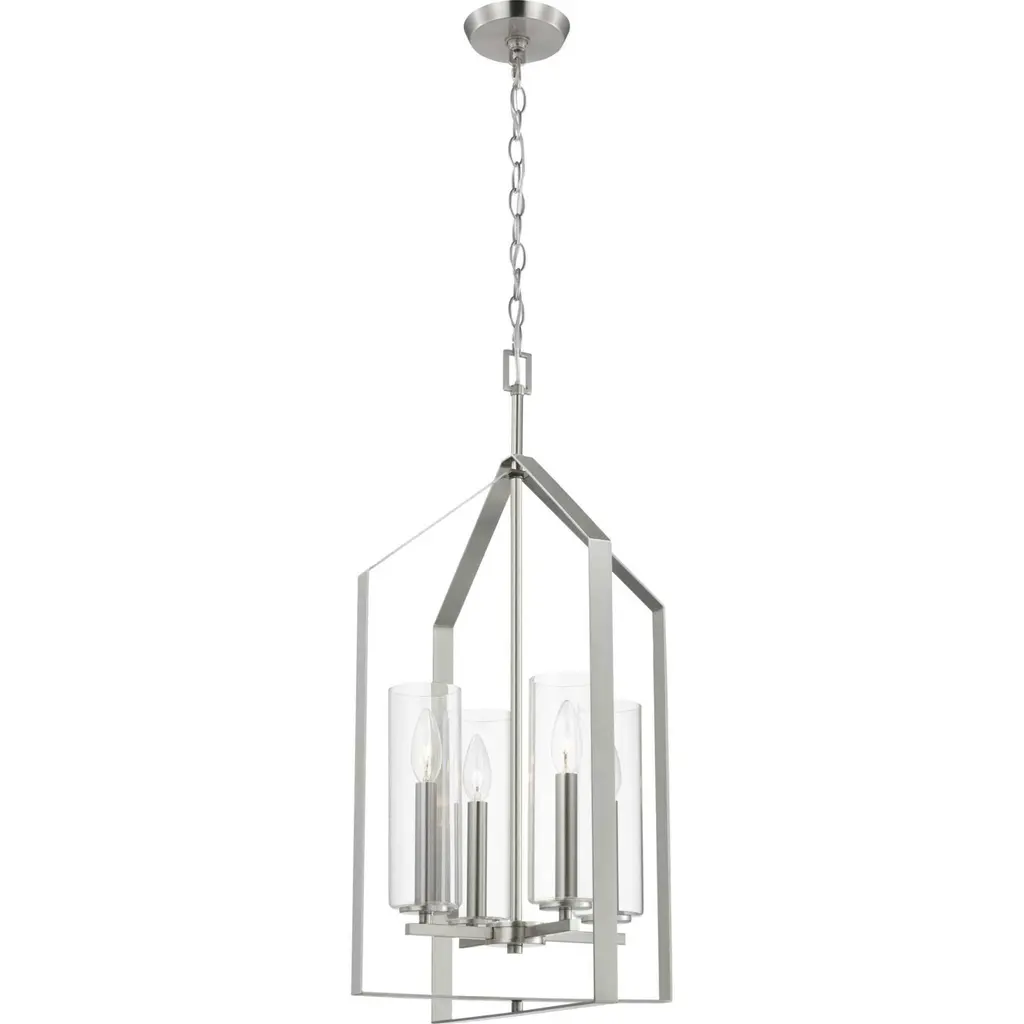 Elegantly extended, the Vertex foyer light is composed of angular forms to create a bold design that perfectly complements halls, foyers and kitchens in modern interiors. Its distinctive silhouette is coated in a brushed nickel finish. A clear glass shade offers bright illumination to spaces below. Customize the light's hanging height to your ceiling using the Included 48 in. of chain for a variety of ceiling heights and sloped ceilings.