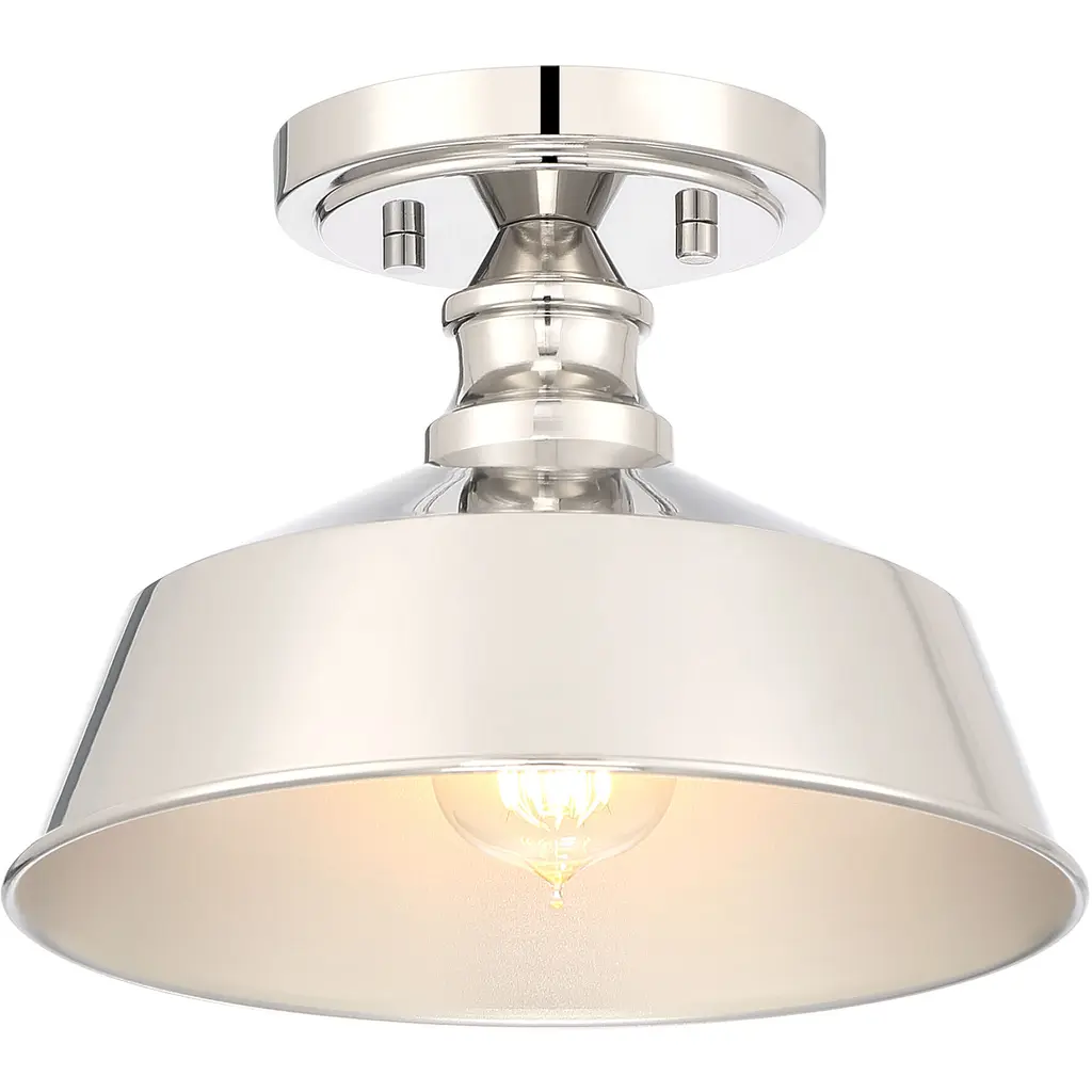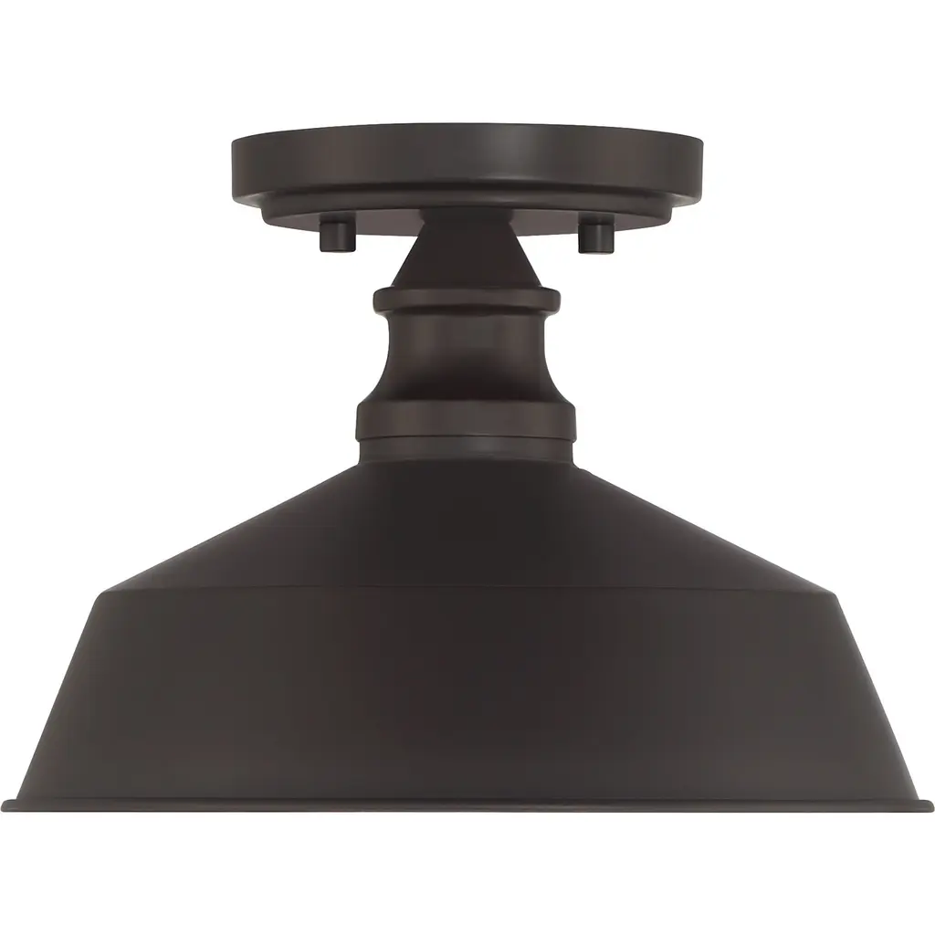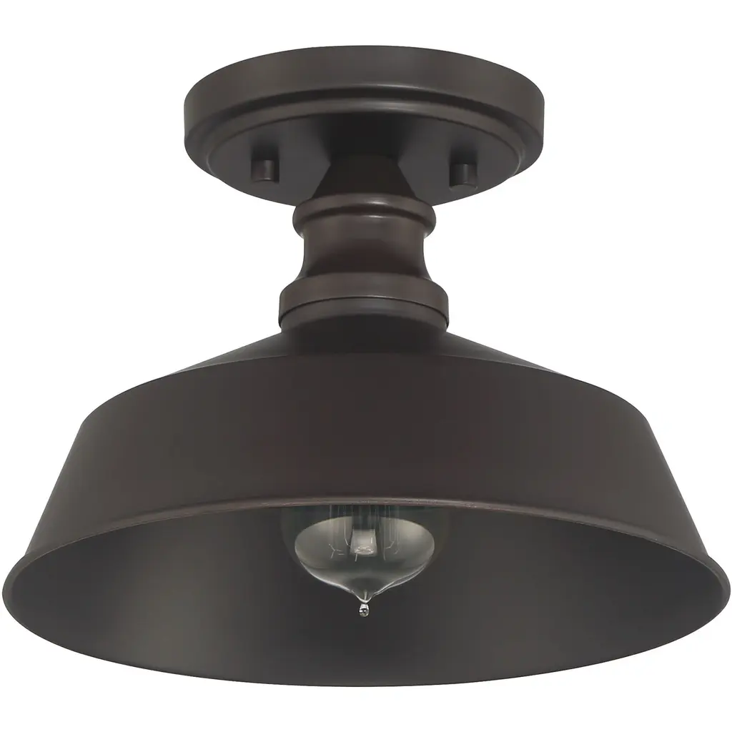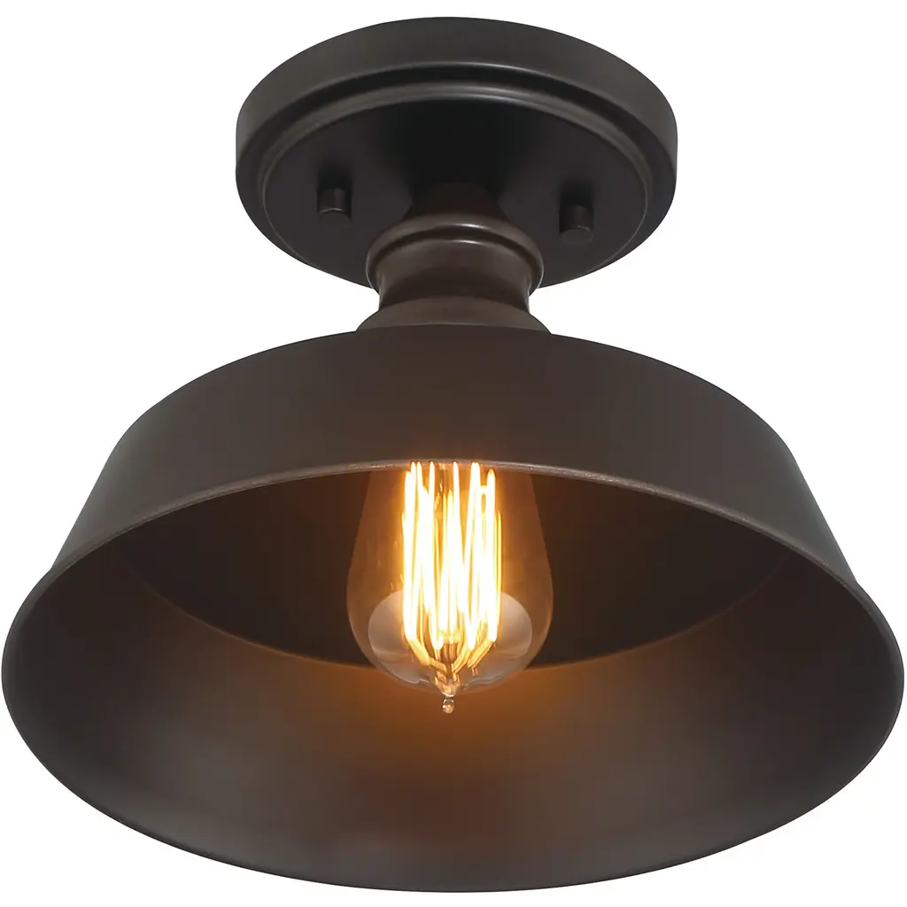 Bring a bold touch of vintage industrial style to any space with this 1-light ceiling light. It features a solid metal shade, eye-catching detailing and an oil rubbed bronze finish. 7.75" height, 10" width. Uses standard size bulb, max 60 watts. LED bulb compatible.