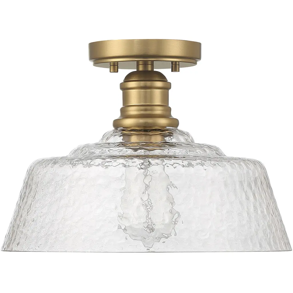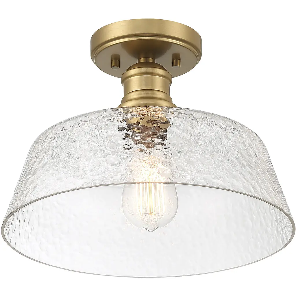 Bring a bold touch of vintage industrial style to any space with this 1-light ceiling light. It features a highly textured shade of glass, eye-catching detailing and a natural brass finish. 9.19" height, 13" width. Uses standard size bulb, max 60 watts. LED bulb compatible.
