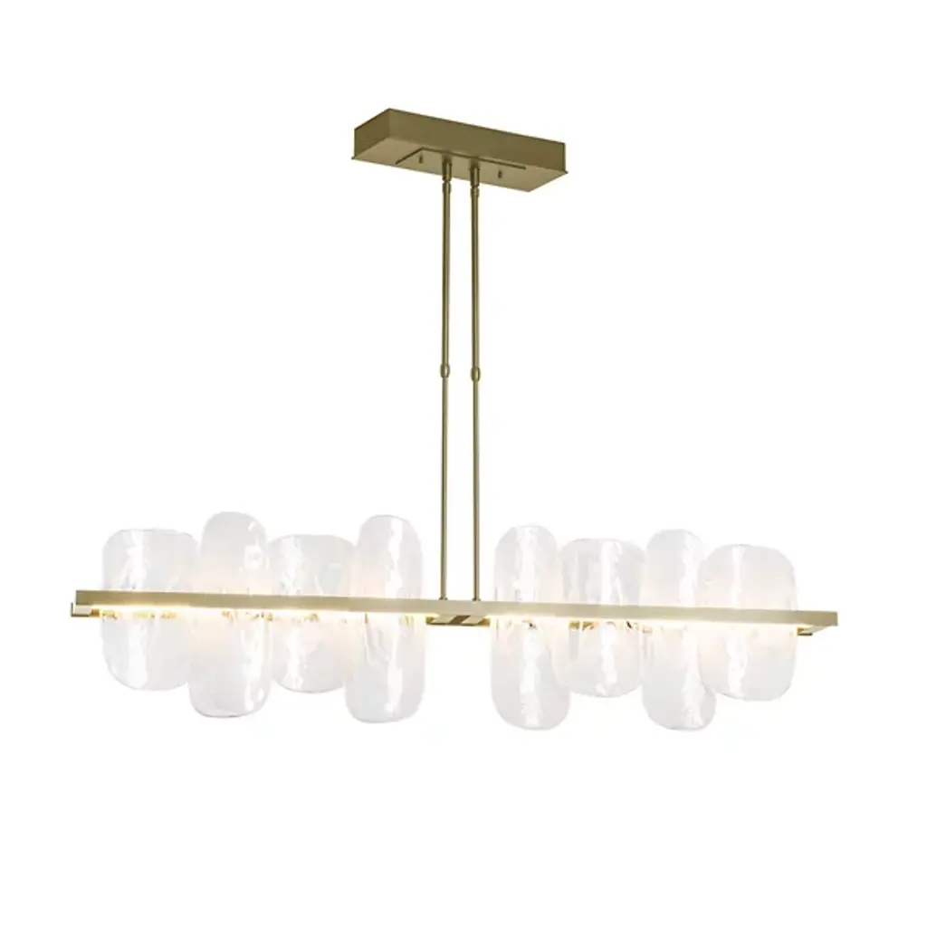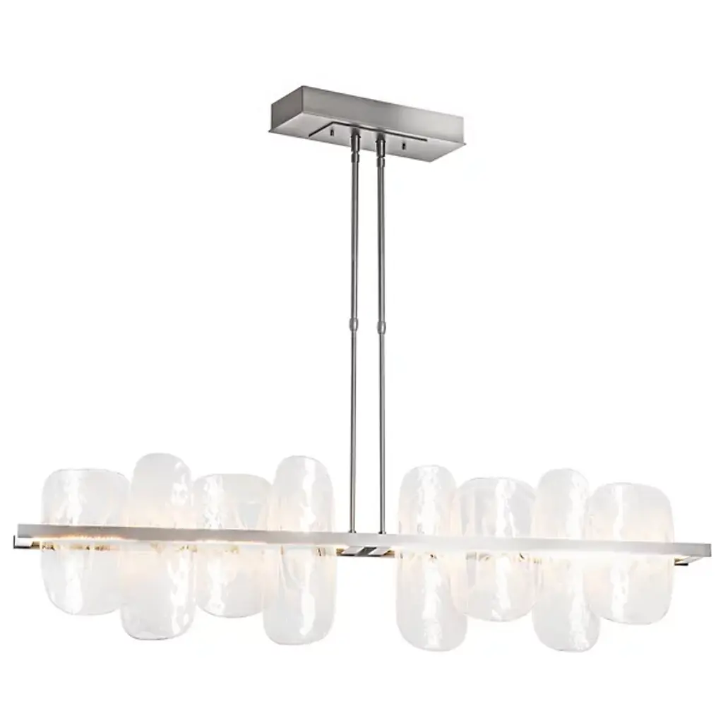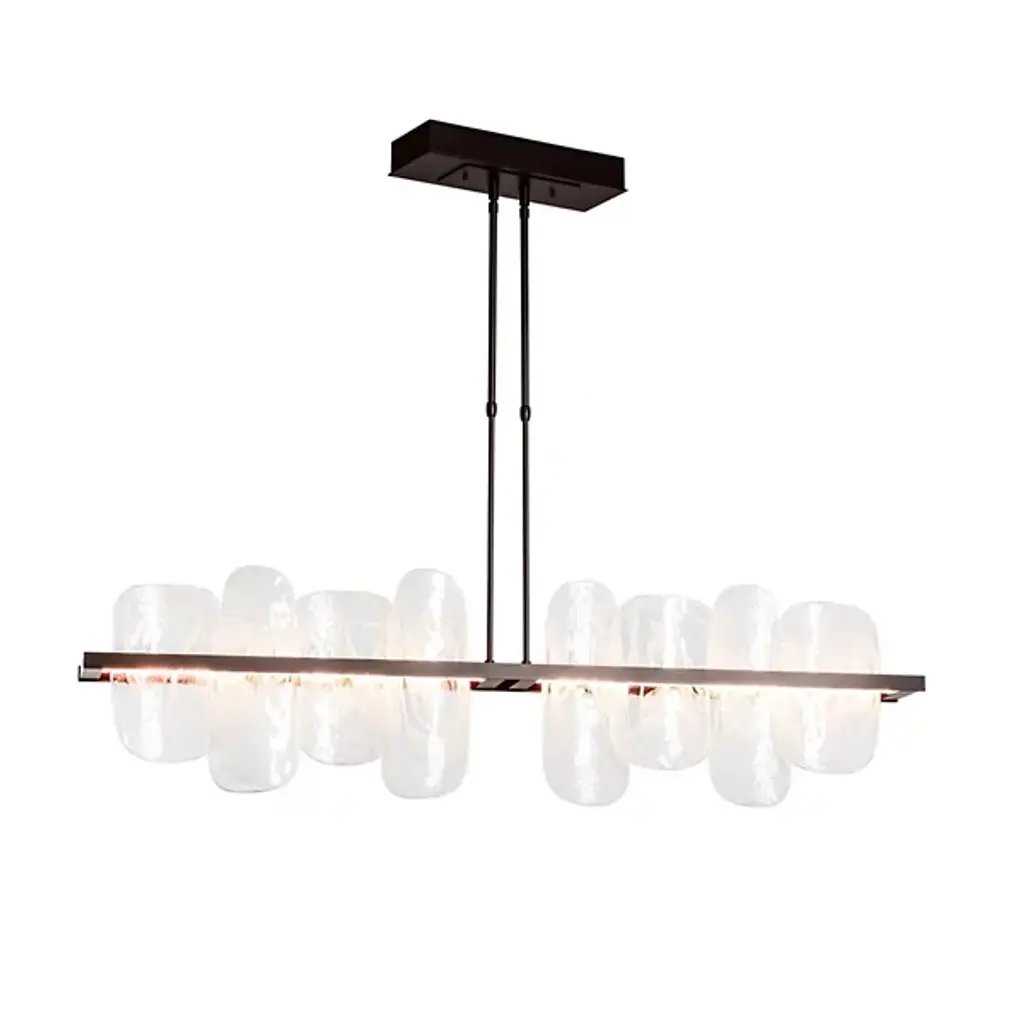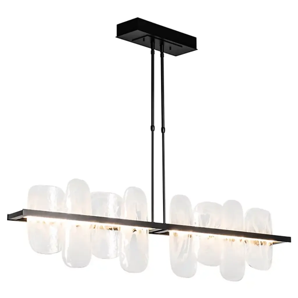 An alluring fixture to enhance the modern home. The Vitre LED Linear Suspension by Hubbardton Forge is a striking piece that brings together warm light and robust glass. A rectangular canopy sends two downrods down to a linear frame containing the fixture’s LEDs. Thick handmade glass panels of varying shapes and sizes are painted with elegant white swirls to bring a dimensional, marbled effect. Light fills the glass to create a brilliant display and illuminate its surroundings.