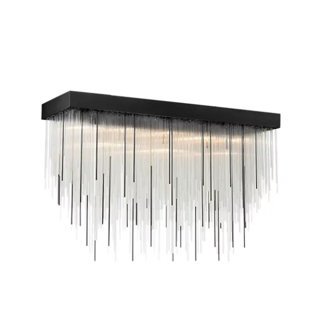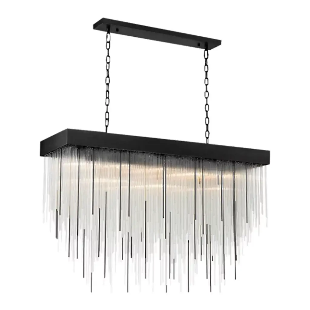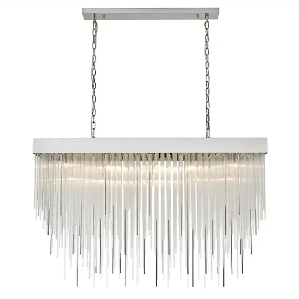 An outstanding mix of smooth refinement and retro style, the Waterfall Chandelier from Zeev Lighting descends from a rectangle-shaped ceiling mount via slim strands of chain, setting strong lamping inside a rectangular upper housing. A downward-pouring wash of clear, slender rods of varying heights falls around the lamping, mellowing it as its smooth surfaces and the occasional metal accent rods add a tasteful twinkle.