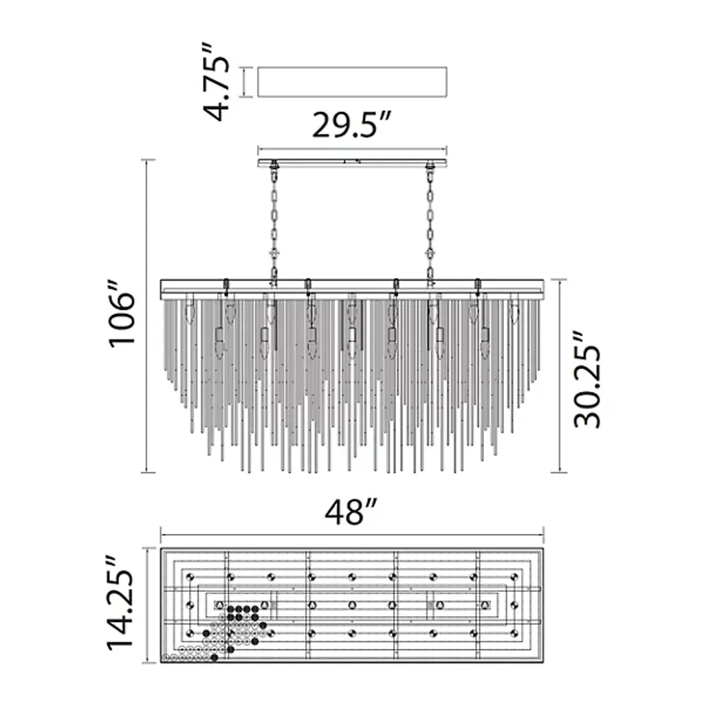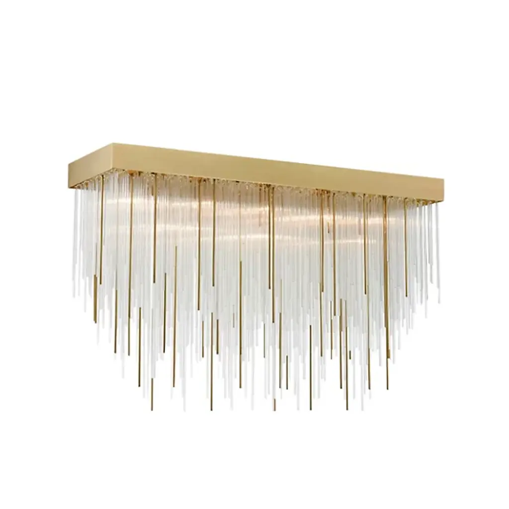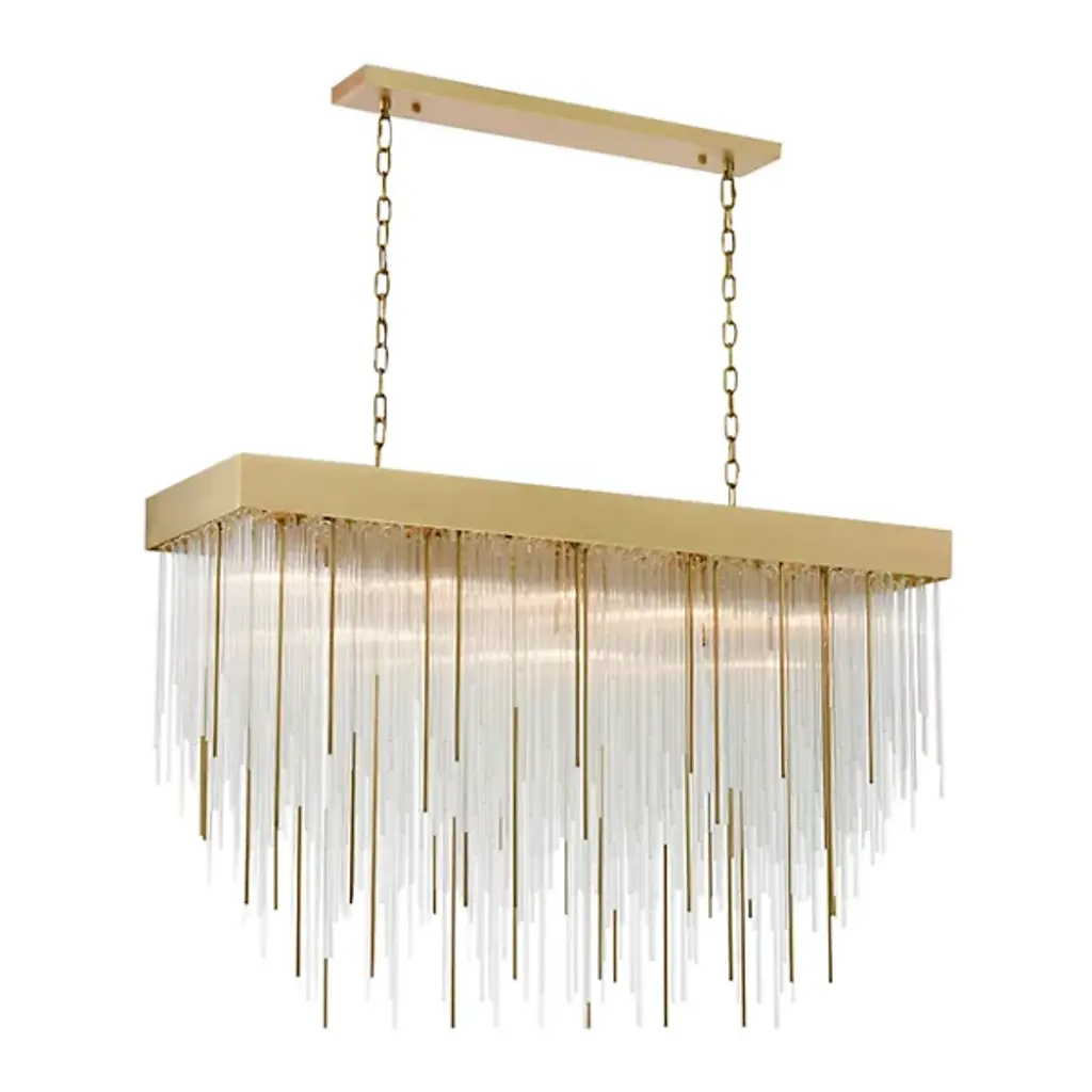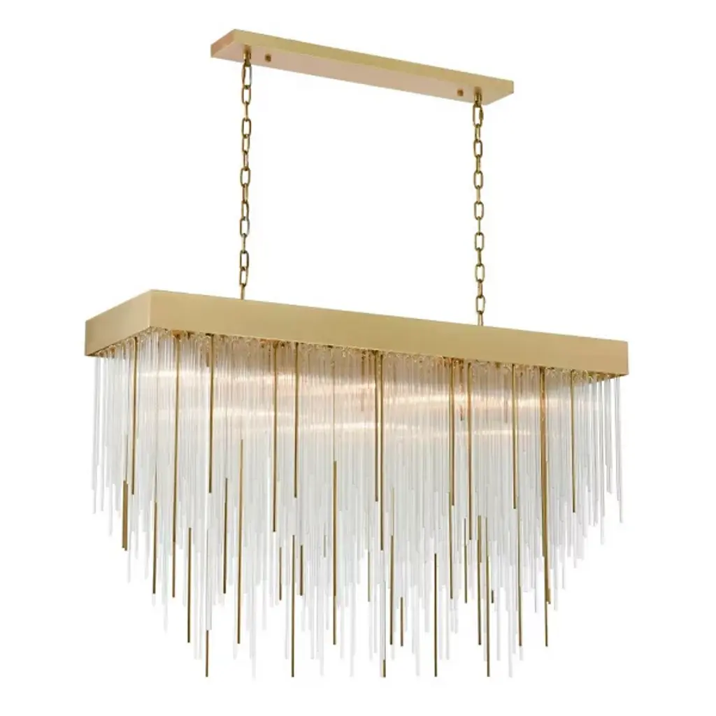 An outstanding mix of smooth refinement and retro style, the Waterfall Chandelier from Zeev Lighting descends from a rectangle-shaped ceiling mount via slim strands of chain, setting strong lamping inside a rectangular upper housing. A downward-pouring wash of clear, slender rods of varying heights falls around the lamping, mellowing it as its smooth surfaces and the occasional metal accent rods add a tasteful twinkle.