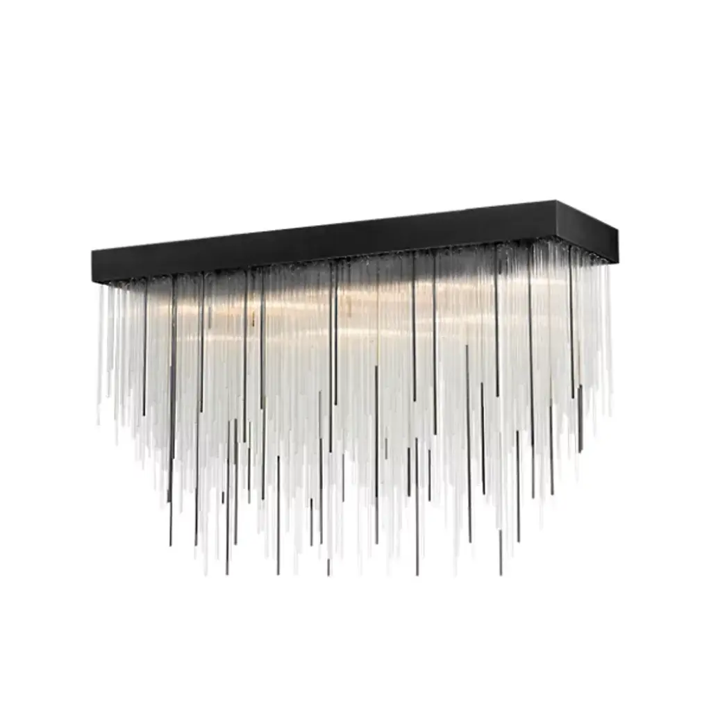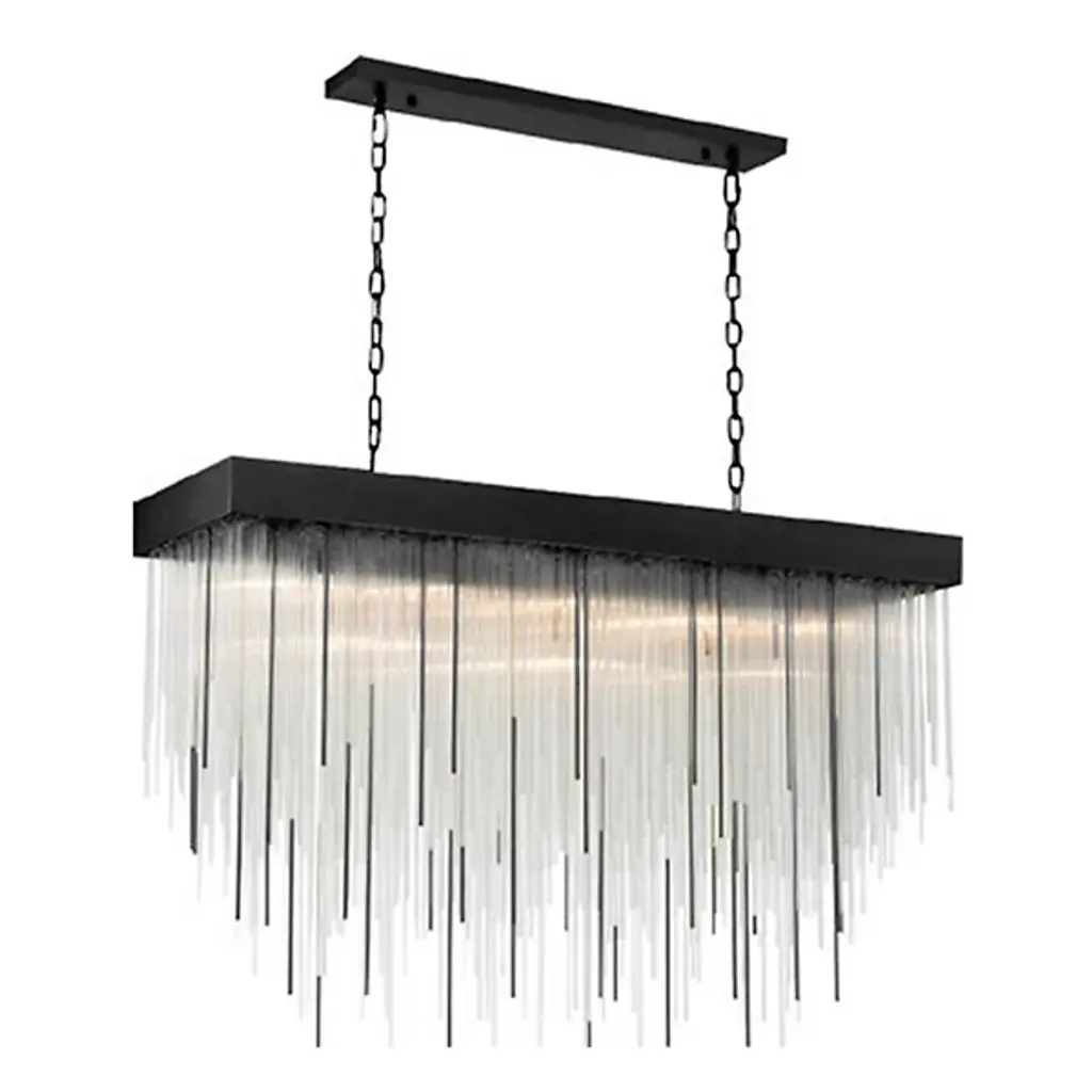 An outstanding mix of smooth refinement and retro style, the Waterfall Chandelier from Zeev Lighting descends from a rectangle-shaped ceiling mount via slim strands of chain, setting strong lamping inside a rectangular upper housing. A downward-pouring wash of clear, slender rods of varying heights falls around the lamping, mellowing it as its smooth surfaces and the occasional metal accent rods add a tasteful twinkle.
