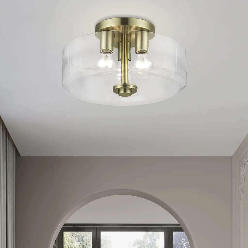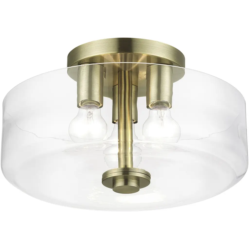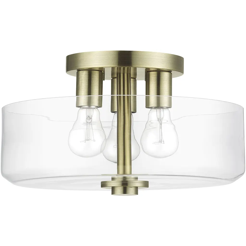 This large antique brass finish three light semi flush fixture from the Whitworth collection features a mouth blown clear glass shade. Practical illumination, timeless charm and versatility make this ceiling mount the right choice for any room of your hou