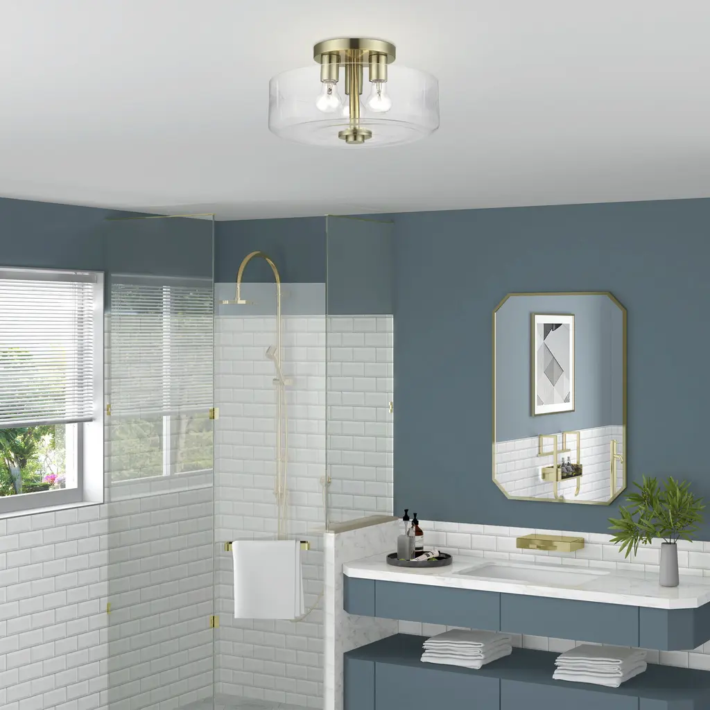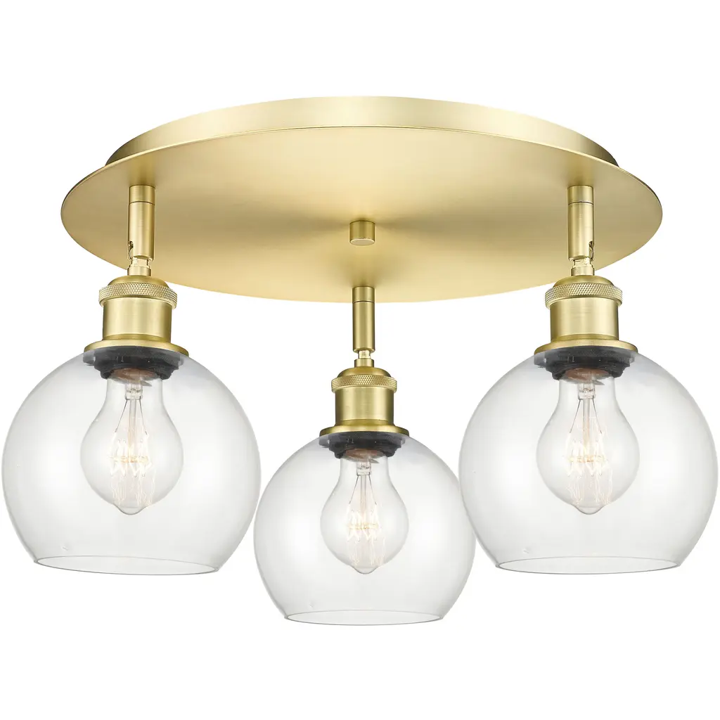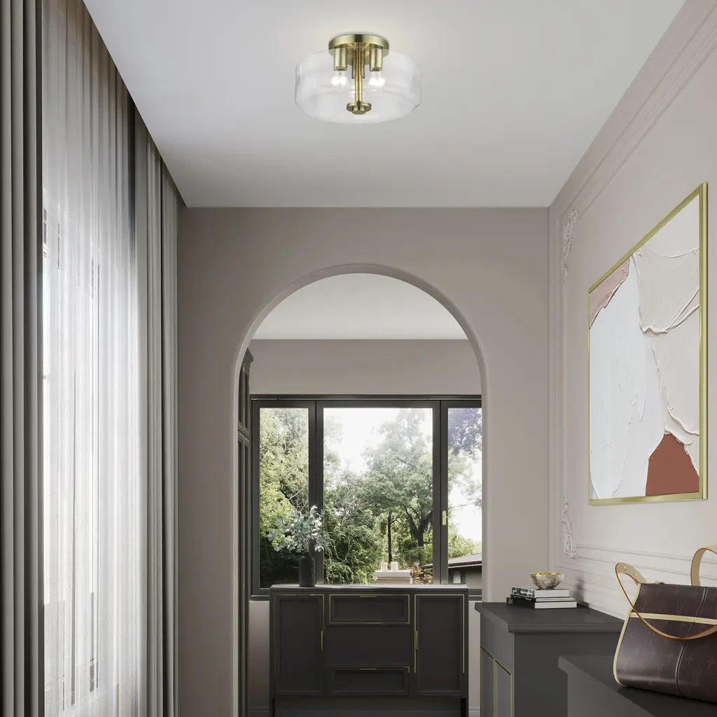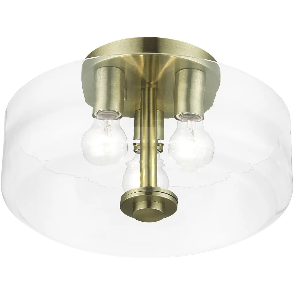 This large antique brass finish three light semi flush fixture from the Whitworth collection features a mouth blown clear glass shade. Practical illumination, timeless charm and versatility make this ceiling mount the right choice for any room of your hou