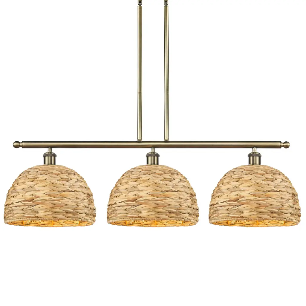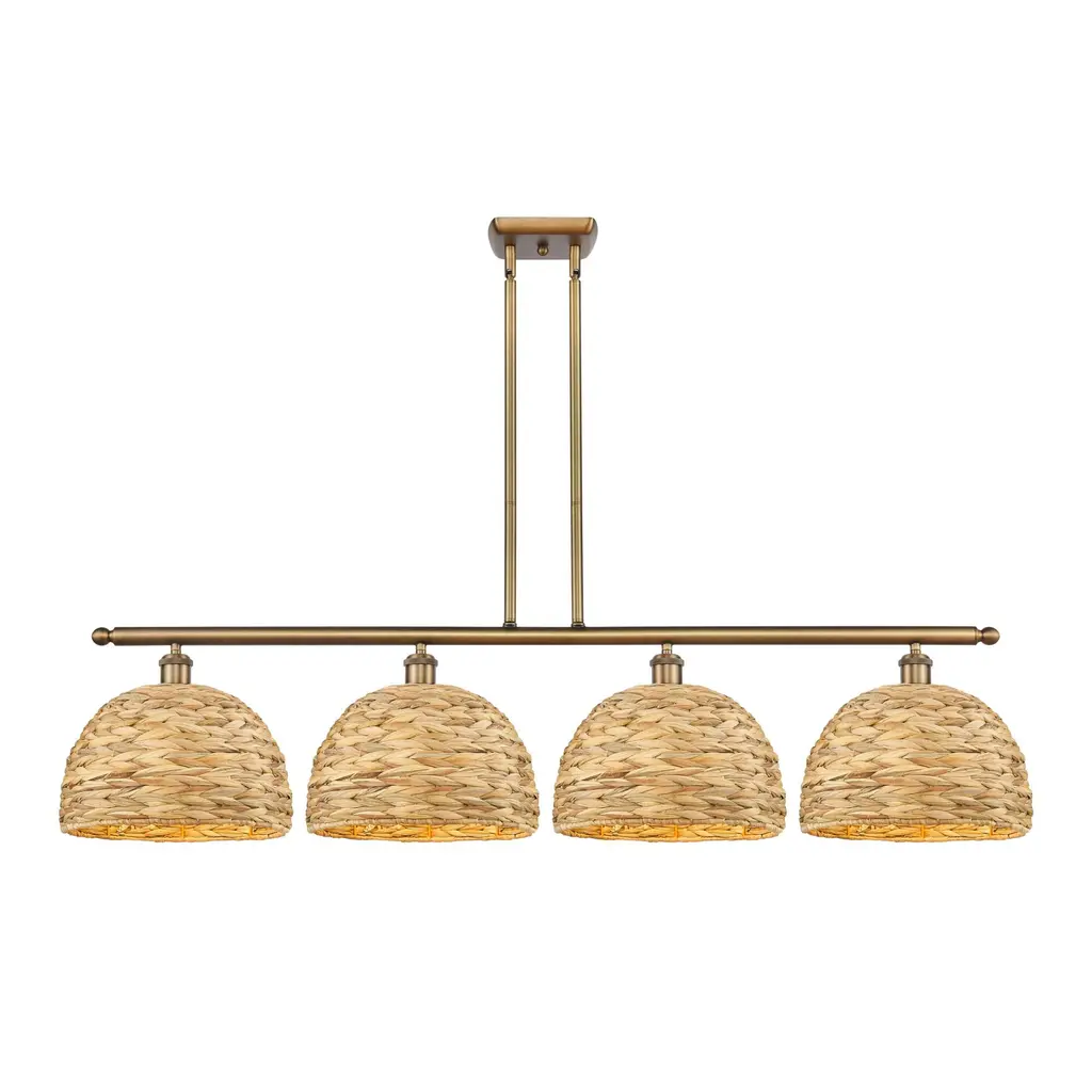 Woven Rattan - 4 Light 48" Stem Hung Island Light - Antique Brass Finish - Natural Shade