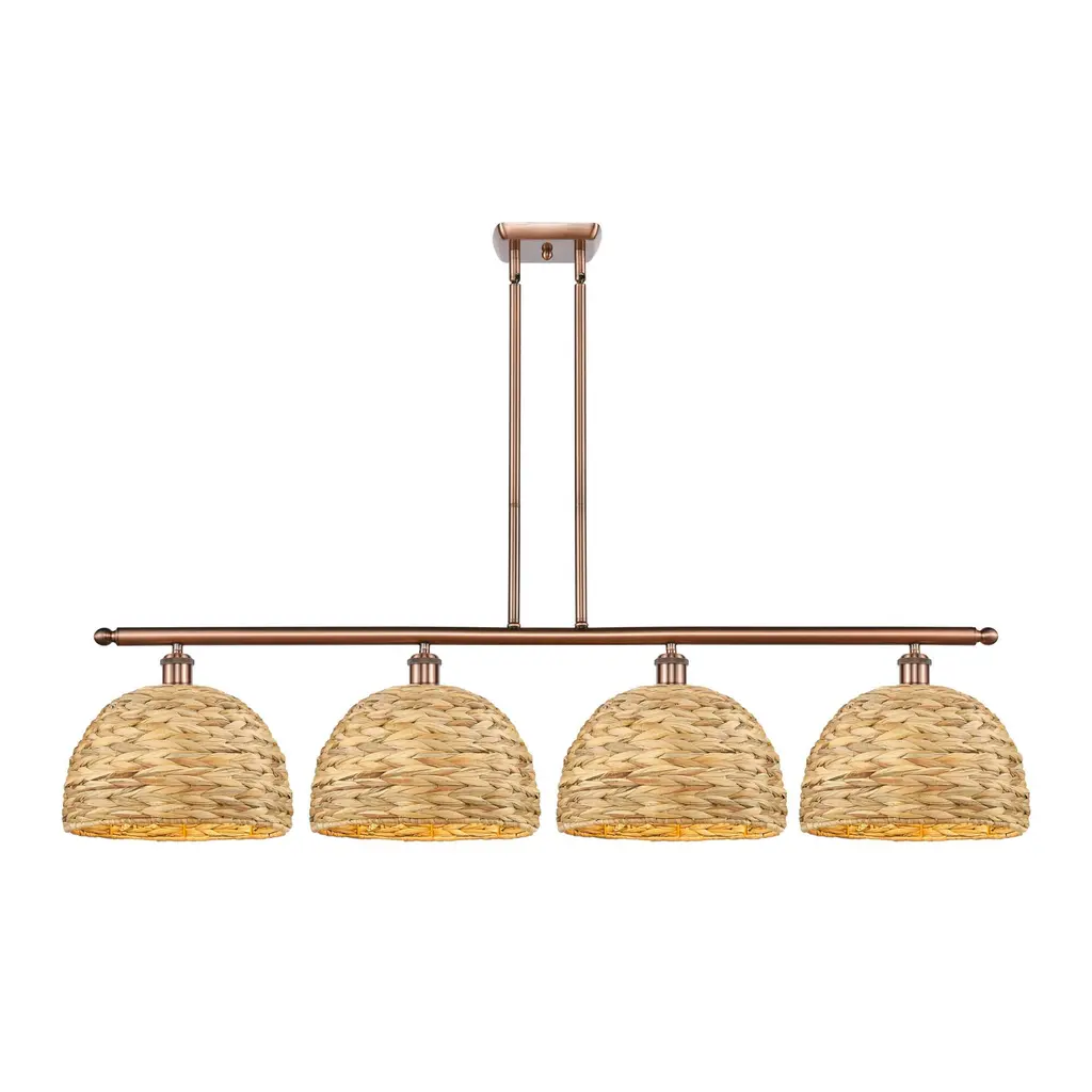 Woven Rattan - 4 Light 48" Stem Hung Island Light - Brushed Brass Finish - Natural Shade