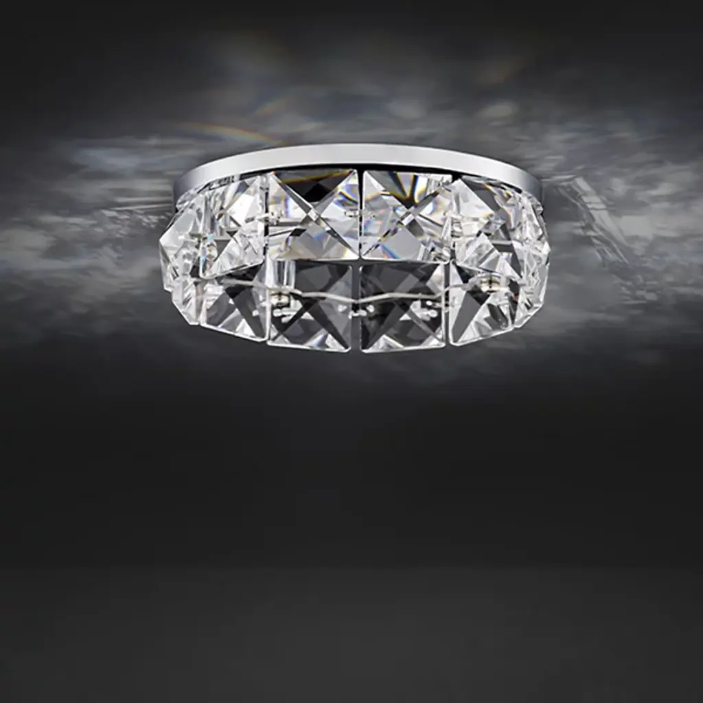 Crown your ceilings with a contemporary crystal using the Xeo LED Recessed Trim from Schonbek Beyond. The circular aluminum structure frames efficient integrated LED lamping, suspending a geometric faceted crystal below. When switched on, light scatters through the crystalline squares arrayed in a brilliant display and washes out in a tight focus below. ADA-compliant and damp-listed, this fixture embeds an energy-friendly sparkle that spreads across ceilings, transforming its environment with an enduring and glamorous presence.