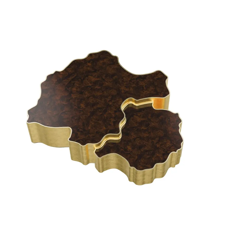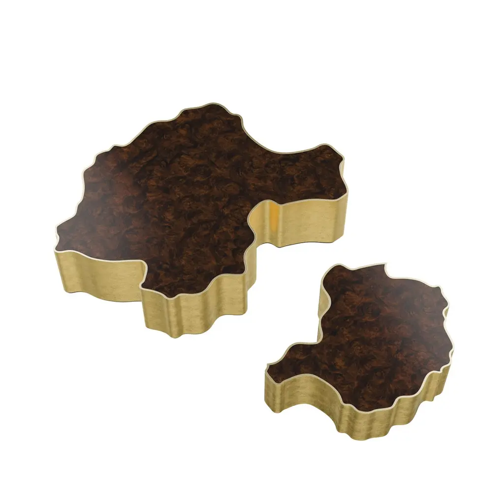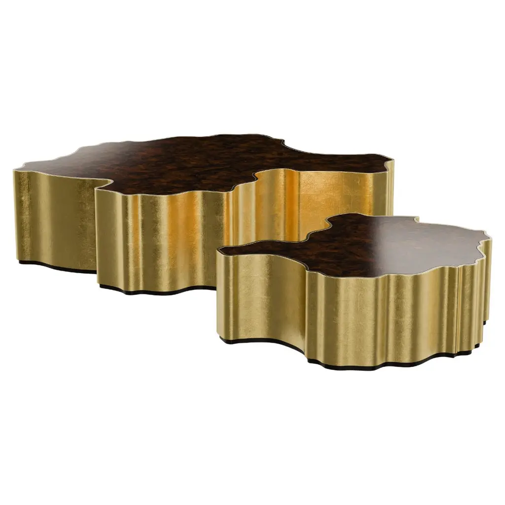 Malabar designed the Horizon center table to honor the discovery times and to remember the Portuguese maritime navigators that discovered unknown lands. These were Portugal's glorious times. Inspired by the divine vision of a New Land sighted from distant waters, this contemporary center table was designed with the organic contours of a coastline in mind. It honors the discoveries and evokes that the horizon is not a limit, combining walnut wood root with black lacquered wood. The gold leaf on the inner surface, more than an embellishment, indicates the area to be used as a module, with other complementary versions. This piece will give personality and a sense of adventure to any living room. Horizon set center table was designed by Malabar and is part of the Heritage collection.