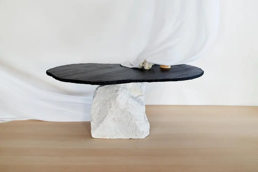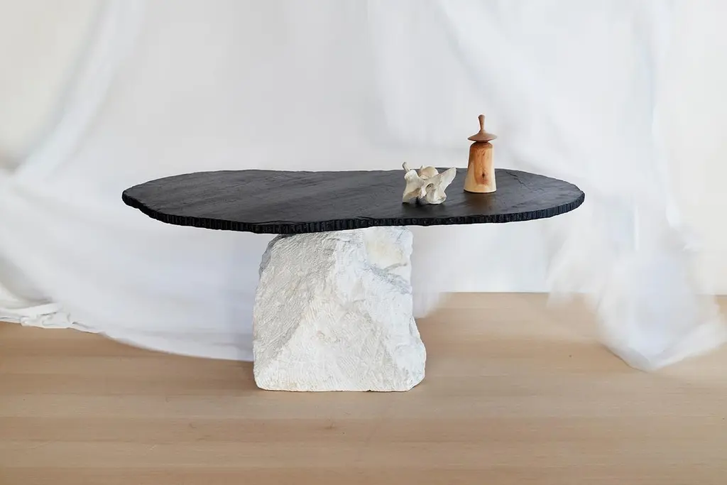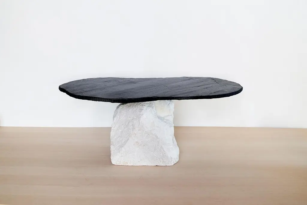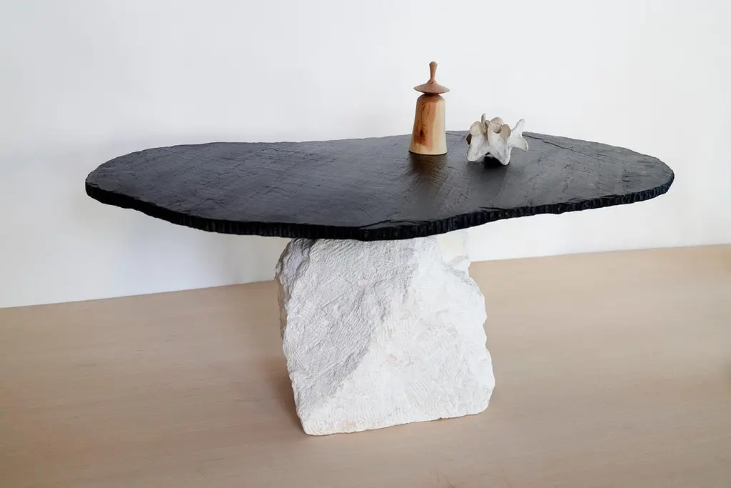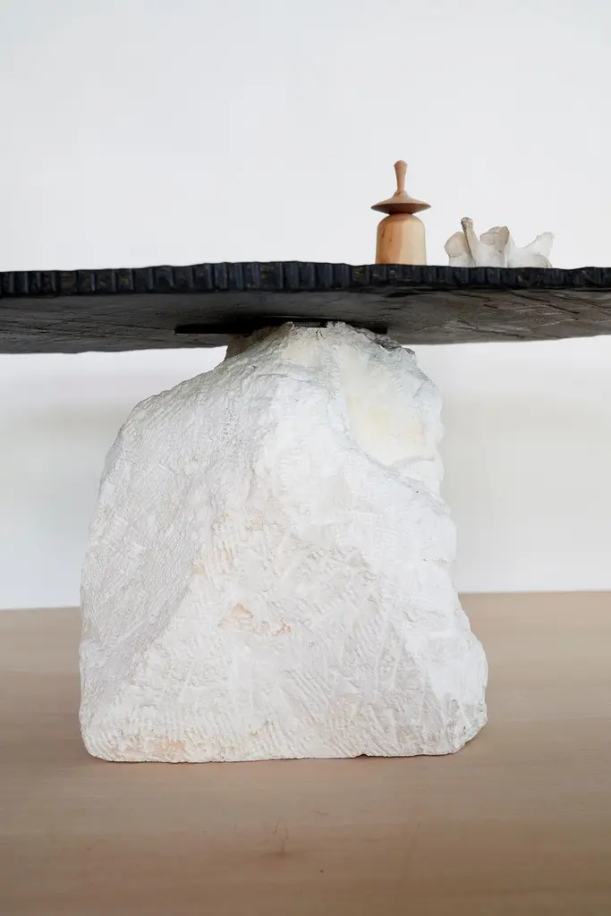 Art Brut Center Table by Jean-Baptiste Van Den HeedeUnique pieceDimensions: W 65 x L 95 x H 43 cmMaterials: Hand-Carved Stone, Natural Slate Top. Jean-Baptiste Van den Heede defines himself as a cabinetmaker-designer and an artist of academic training and family tradition. He has achieved unique designs of national and international prestige and has several awards in avant-garde furniture.Born in Argentina in 1966, from an Argentine mother and a Belgian father. At 5 years of age he and his family moved to Belgium.To train as a wood professional, he first studied 4 years of carpentry. Then he continued training in cabinetmaking and carving for 5 more years. Always in search of contributing something more to his trade, he studied furniture and antique design, culminating this with the study of Sculpture at the Royal Academies of Fine Arts in Liège (Belgium) and graduating with honors.Work the stone, the wood and experience the forge. From the beginning it is directed towards a search for signs, abstract writings and unrealistic figures in analogy with other “primitive” cultures. He taught drawing and sculpture in Brussels at the private school “la main et l´ esprit” As well as summer courses in Liege (Belgium) “les ateliers d´art contemporain”.In 1995 he went to Barcelona where he taught and investigated the reliefs of different supports such as trees, floors, and especially sewer covers.He searched again analogies between current art and prehistoric, African art, etc.Participated in several exhibitions both at the artistic level and avant-garde design.In 2002, he moved down to Albacete and then to a town in the province where he still works.It is defined as “a search engine without haste or guidelines.” He says: “I only work when I feel a strong and positive inspiration invade me, an energy that I capture from matter, from the air and that I return doing the work until I feel a connection with it.”Private workshop of contemporary art in Letur (Albacete) until 2009.He currently works in his workshop-studio in the Sierra de Madrid (Guadalix de la Sierra) following his career as a cabinetmaker-designer and artist while teaching his trade to students interested in wood.