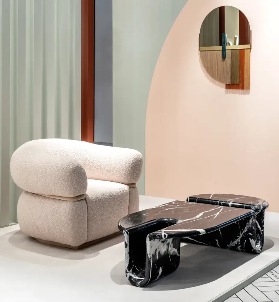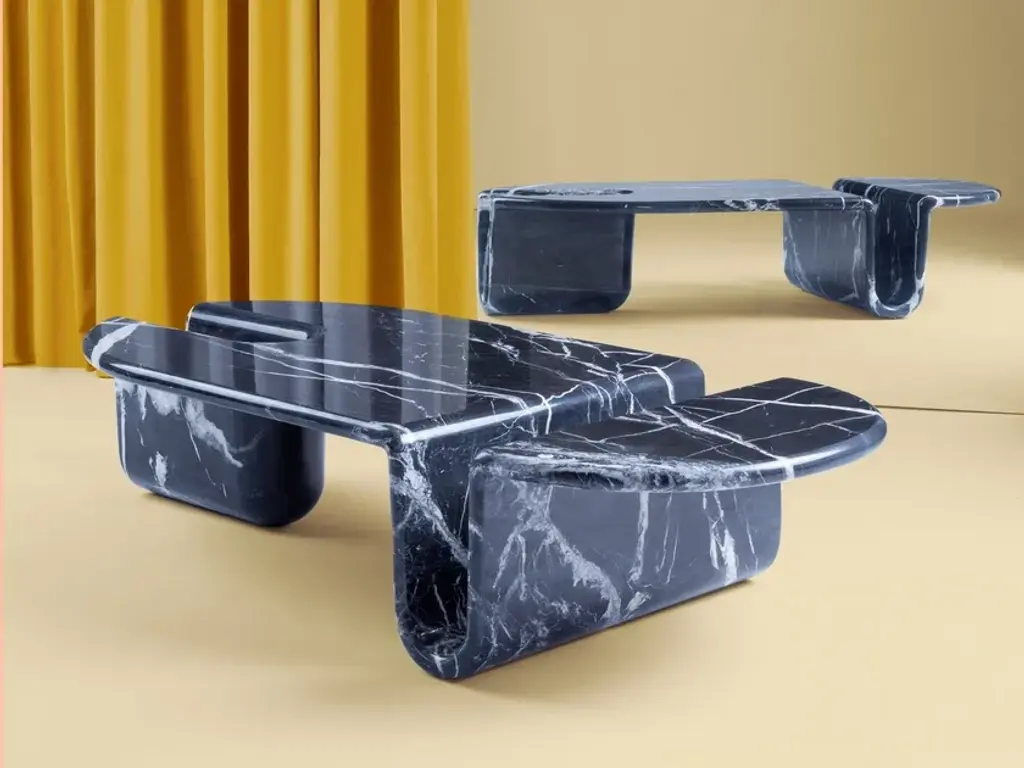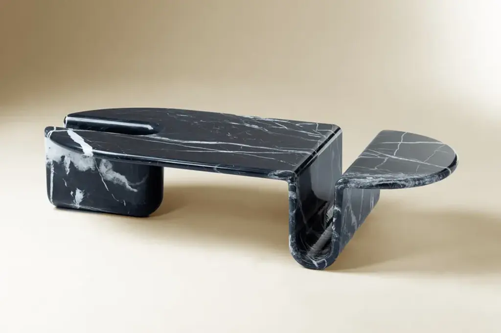 Sensual curves and straight lines embody the perfect combination of beauty and danger, much like the Hollywood legends Bonnie & Clyde. It is impossible to feel estranged with this piece which will attract you and never let go.Structure: Carved from one solid Marble piece: Estremoz White, Estremoz Rose and Nero Marquina