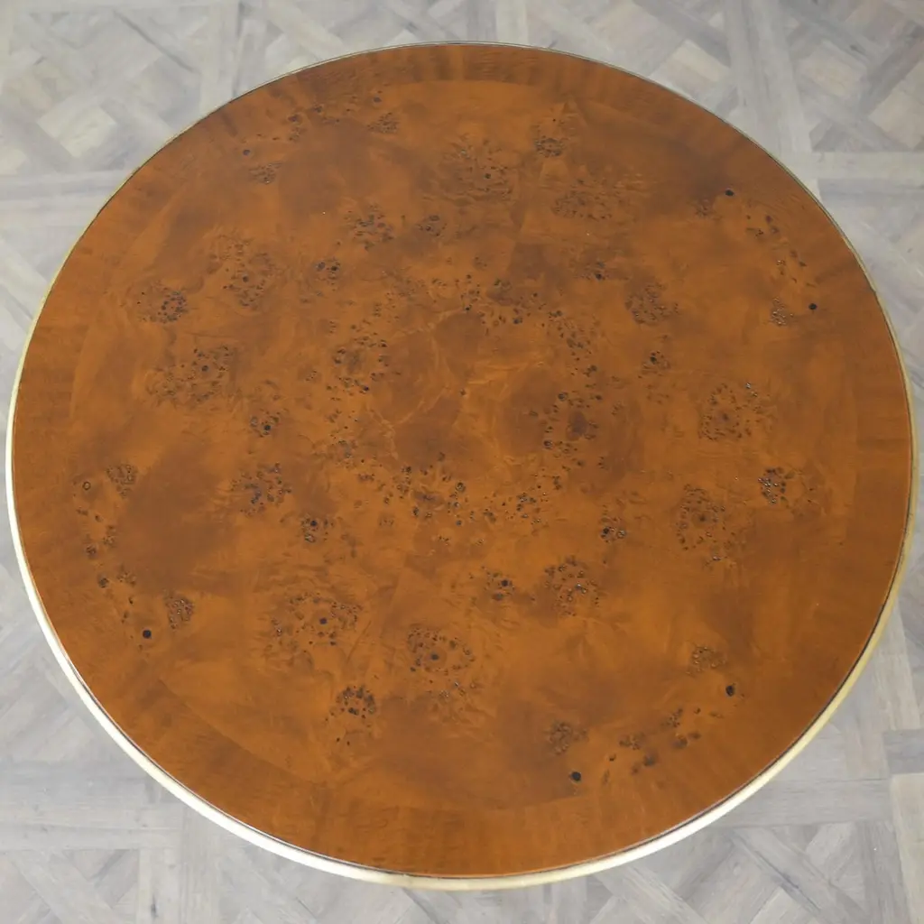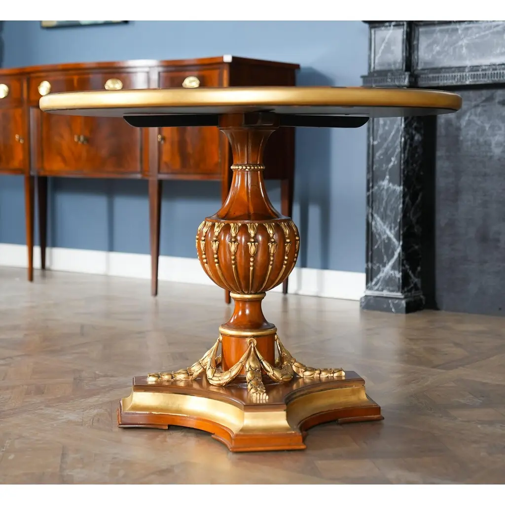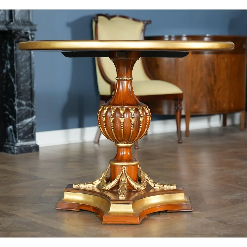 A gorgeous, high quality Burled Center Table from Niagara Furniture with plenty of presence to brighten up any room. Banded and burled top, hand carved solid mahogany base and real gold leaf accents all work together to create a table that could be the centerpiece of your front entry way.Measures 39″w x 31″h metric 99 79