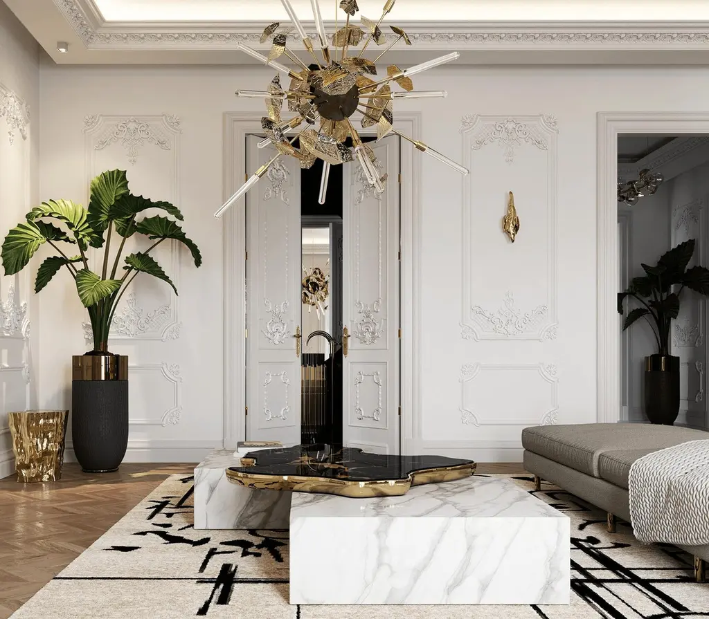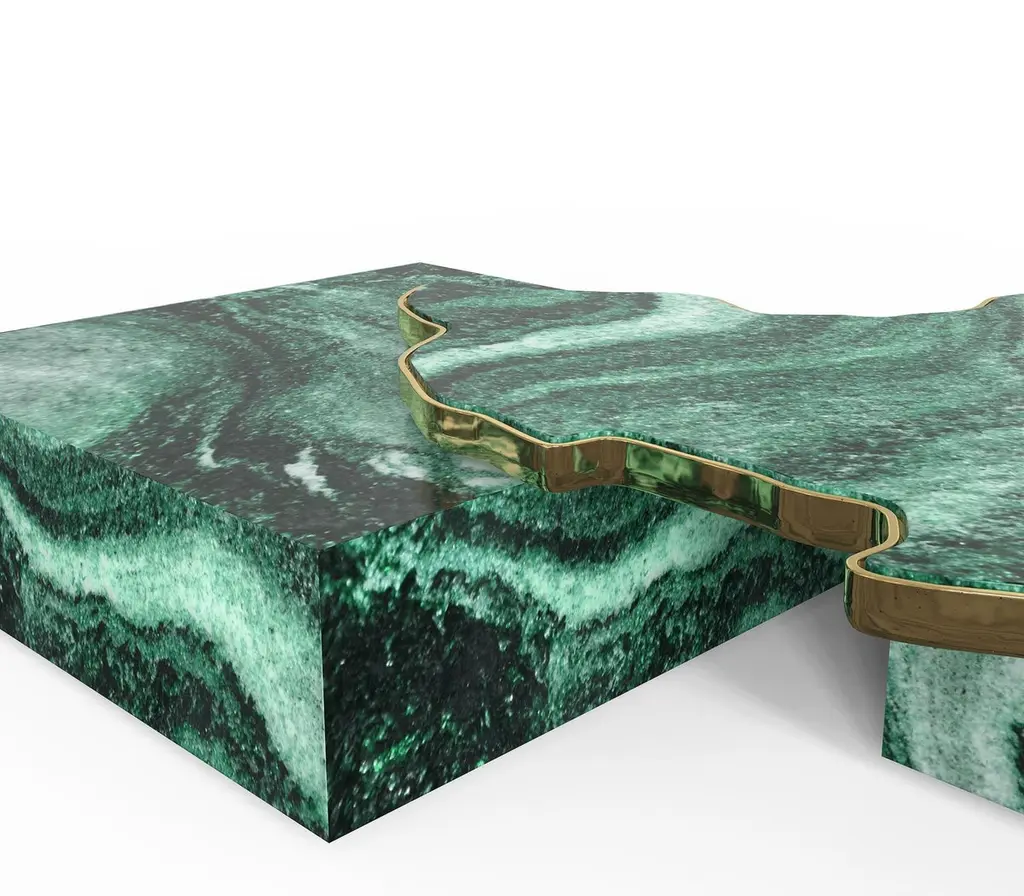 Centre table in green marble.A contemporary center table composed by two square marble modules, linked by an organic marble surface element on top enveloped by casted brass.Dimensions: H: 35 cm, l: 206 cm, d: 136 cmTime of production 12 weeksref: Boca Navarra.
