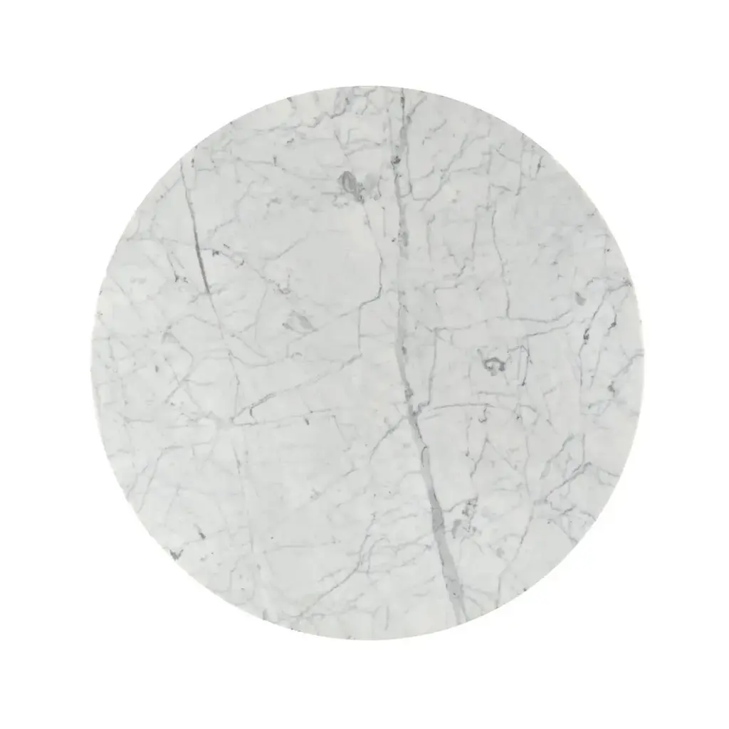 A carved oak round center table with an Italian Carrara marble top, carved Vitruvian scroll work frieze, and out flaring fluted pedestal base. Dimensions: 35.5" W x 35.5" D x 32.25" H