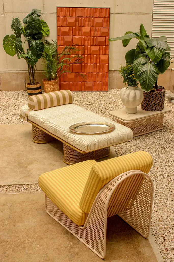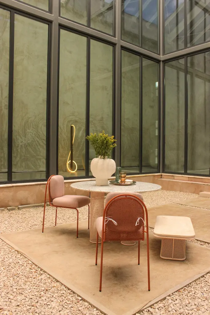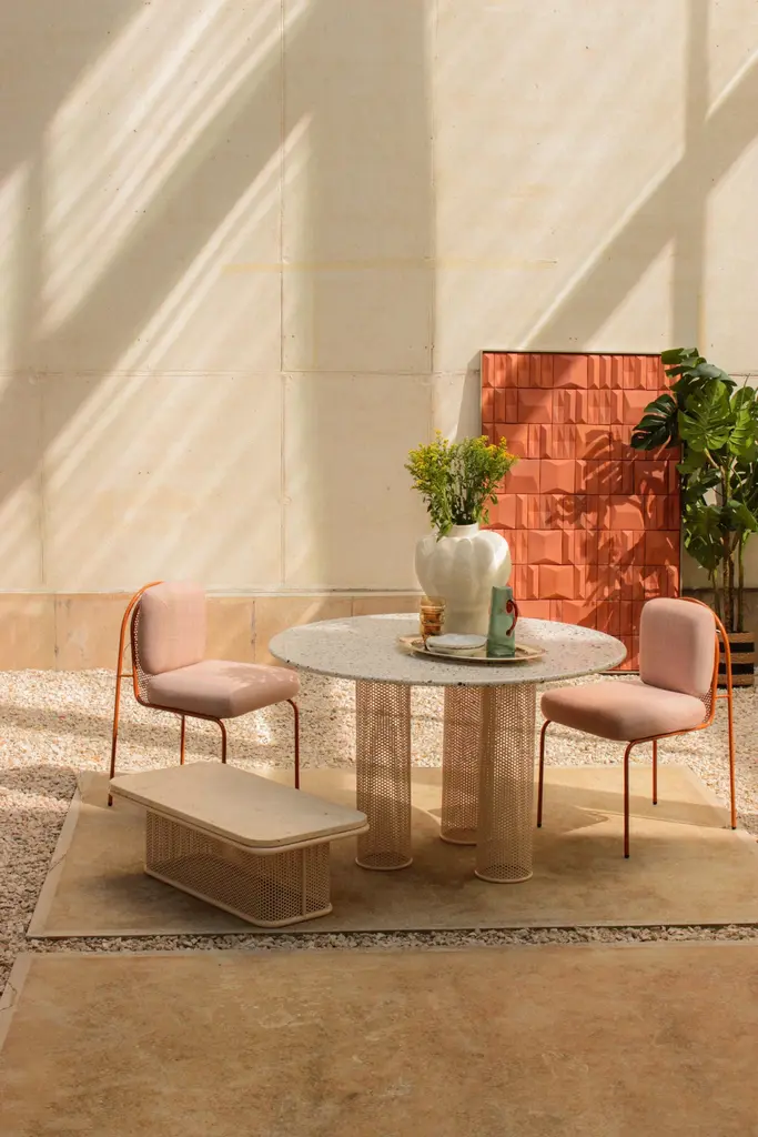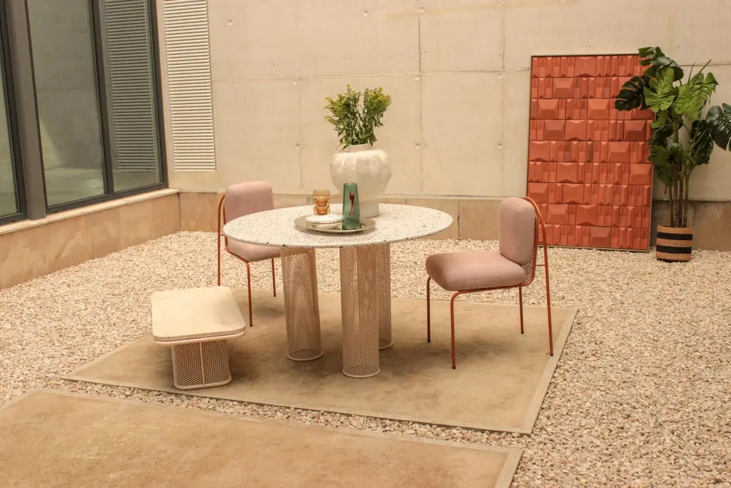 Our newly unveiled collection is meticulously handcrafted in Portugal. Departing from conventional norms, weembrace a palette of unconventional materials, including different marble stones, an array of Merrazzo tones,robust metals and enduring ceramics to create a thoughtfully curated collectionThis collection is a testament to versatility, seamlessly blending sophistication and comfort to elevate theoutdoor space.Designed to celebrate the outdoors, each piece in our collection embodies the symbiosis of elegance andfunctionality. Whether indulging in stylish dining or serenely lounging, this ensemble is a homage to the art ofoutdoor living.outdoor usage: outdoor lacquered Sage metal base and Terrazzo Sage top