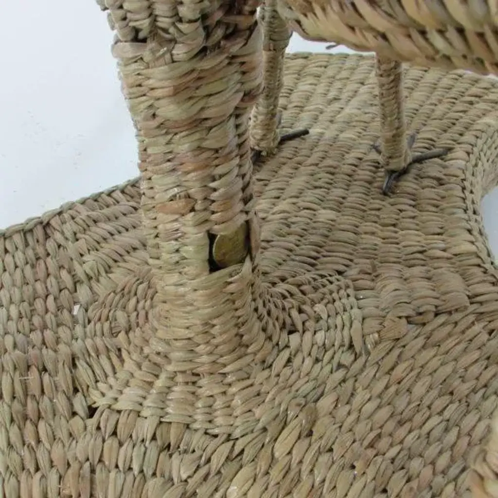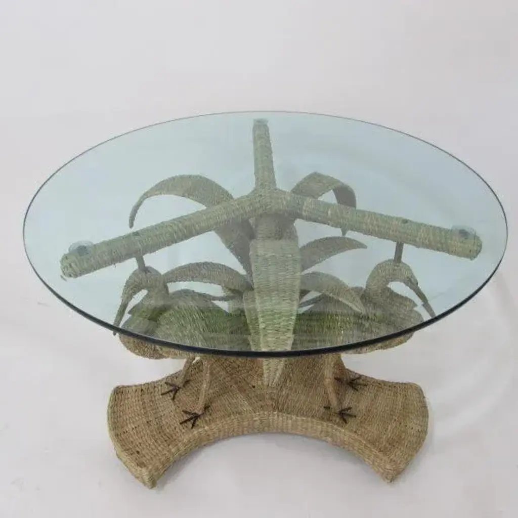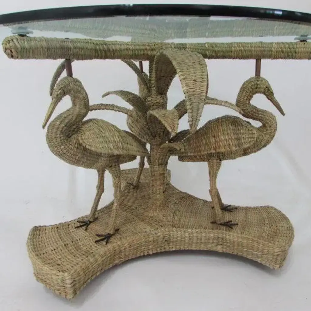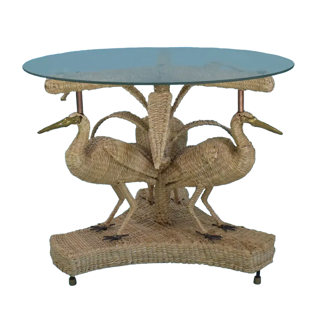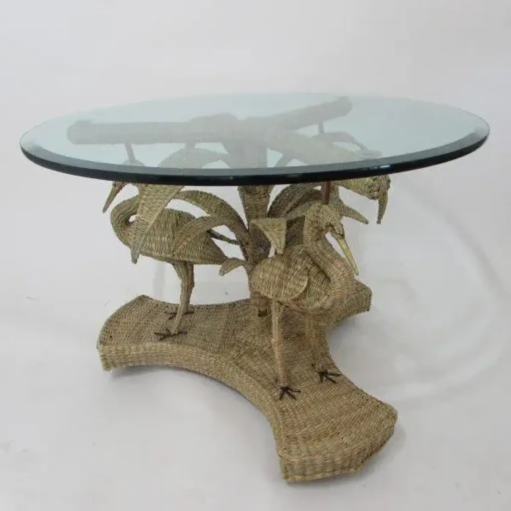 Mario Lopez Torres Crane Table w/Glass Top. There are minor imperfections to the hand-made woven rattan. Signed Mario Lopez Torres Est. 1974. Brass accents. (see photos)