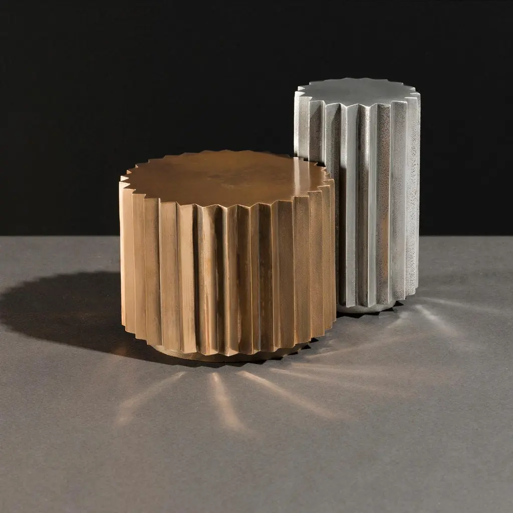 Doris Aluminum Side Table by Fred and JuulDimensions: Ø 36 x H 60 cm.Materials: Aluminum.Available in bronze and aluminum. Also available in different measurements. Custom sizes, materials or finishes are available. Please contact us.Side tables in cast bronze, blackened bronze, bronze with Tuscan green patina or aluminum of different diameters and heights that can be combined to create a coffee table. Inspired by Doric columns in archaic architecture, the extruded multi-point stars have a different finish on each vertical face: the cast metal is polished on one side but left raw on the other. The shading is amplified by the different finishes resulting in a dramatic effect. Similar to gears, the tables can be meshed together to form a center table set, possibly using tables of different heights and even materials. Crafted in Tuscany, Italy, in a foundry specialized in bronze sculptures, serving artists among the most renowned in the world.Fred&Juul, short for Federico Minarelli and Julie Janssen, are two architects who decided working as architects isn’t for them. It was when designing custom furniture for their clients and developing it with the amazingly skilled local artisans that they truly found joy in their work. So, in 2012 they decided to solely focus on that and launched their first lighting and furniture collection. With the exception of the renovation of the old Tuscan farmhouse that would become their home and studio, a labor of sorrow, but mostly love (see the result on the press page!).What sets them apart is how they see and use their materials of choice: bronze, brass, wood and stone. Their designs value the inherent nature of these materials and how they are meticulously crafted, like the grainy, clouded surface of their Raffaele light in sandcast brass or the juxtaposed Oak grains in the marquetry of their Maurits table. Starring all these aspects in the story of a piece, is what makes it unique and last.Over the years they have increasingly worked with interior designers on custom pieces for high end projects all over the world, thanks to their attention for detail, refined aesthetic sense and collaboration with the best highly specialized craftsmen Tuscany has to offer.
