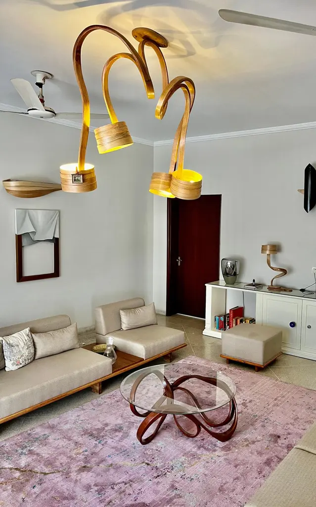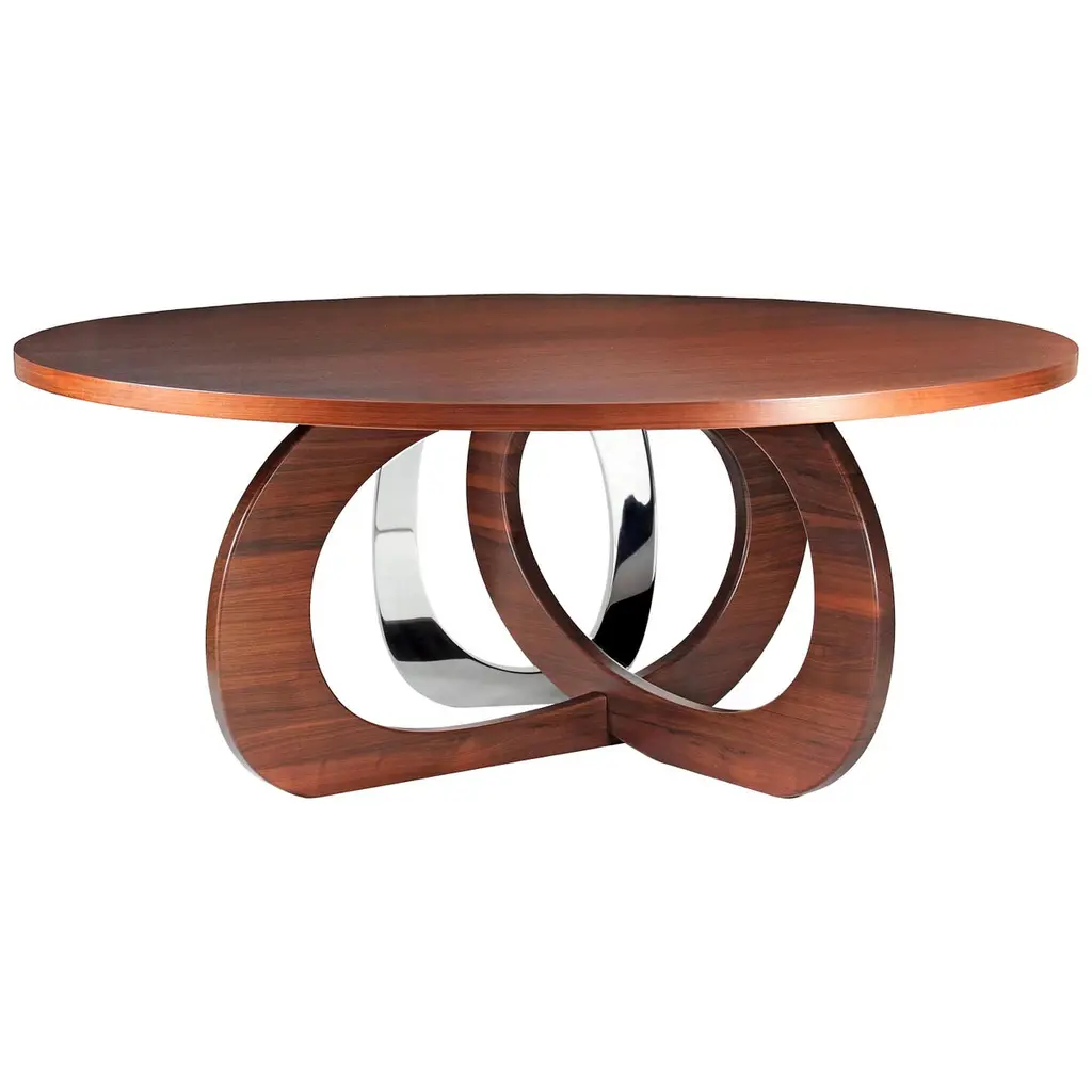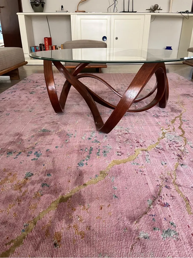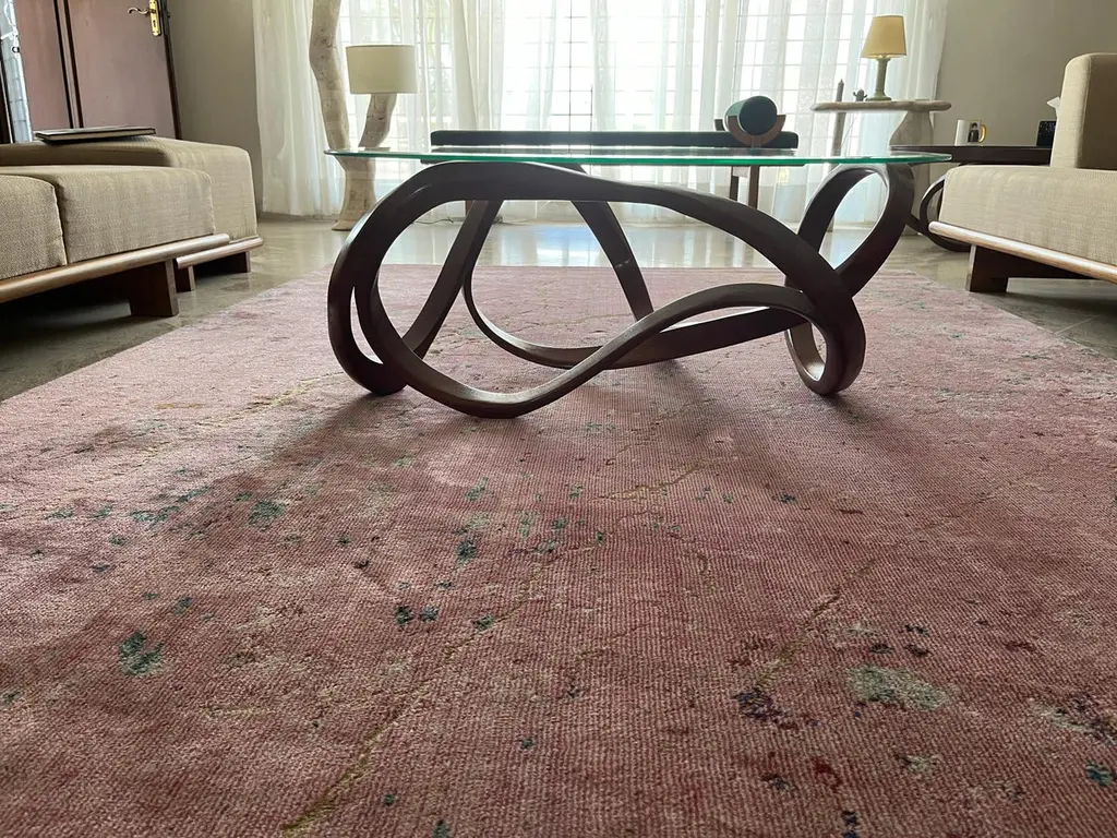 The center table has a free-form base to support the round glass top. The wood bends and curves with beautiful flows to create a design without a frame for the top. The handcrafted details on the piece such as the curves, varying thickness of the wood and twists give the piece its organic flows.Our pieces are based on bending solid wood to create the pieces, this has allowed us to design in a totally unique aesthetic in which the natural flow of the wood takes the reins of design. No two pieces are exactly the same because of the technique used, making each piece unique.Other points worth knowing:- The design may vary slightly from the piece in the pictures since each piece is handmade.- You can choose from an array of finishes.