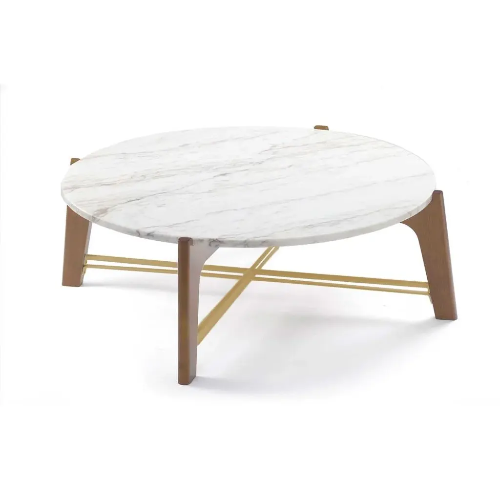 Top: Estremoz marble, plywood veneer or lacquered MDF - choose from multiple kinds of wood Feet: beech solid wood - choose from solid wood colors Fittings: brass or lacquer metal - choose from multiple metals This Flex center table is available in multiple configurations and finishes. The pictured configurations are: - Marble top with a natural Oak base and lipstick-red lacquered metal fittings - Marble top with a solid Ash base and white lacquered metal fittings