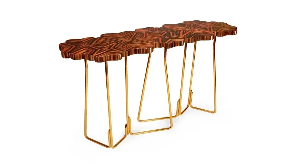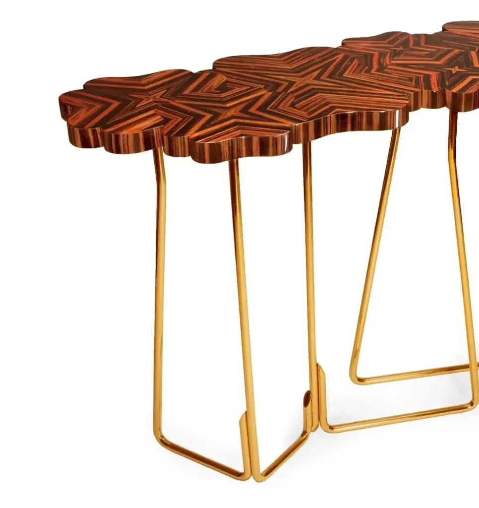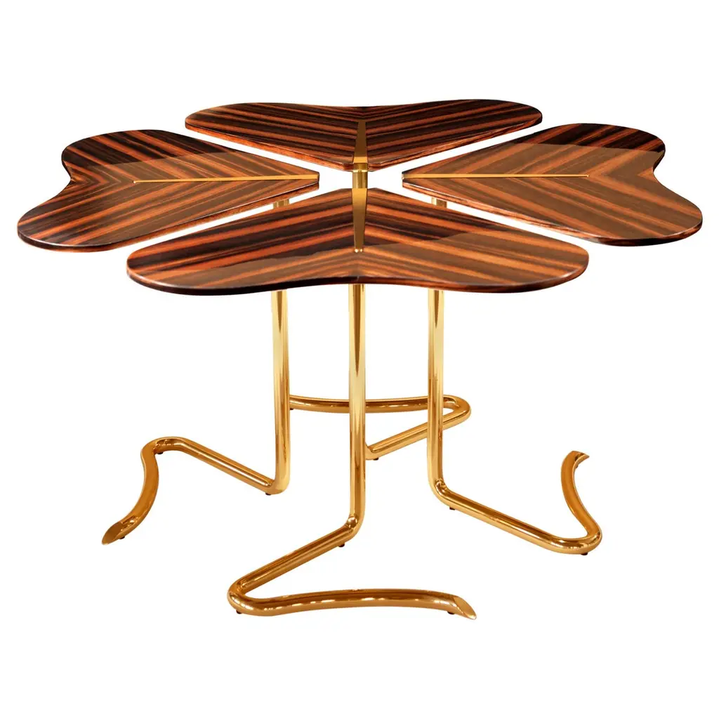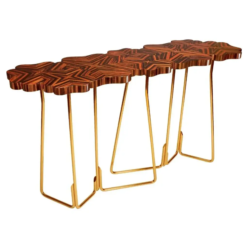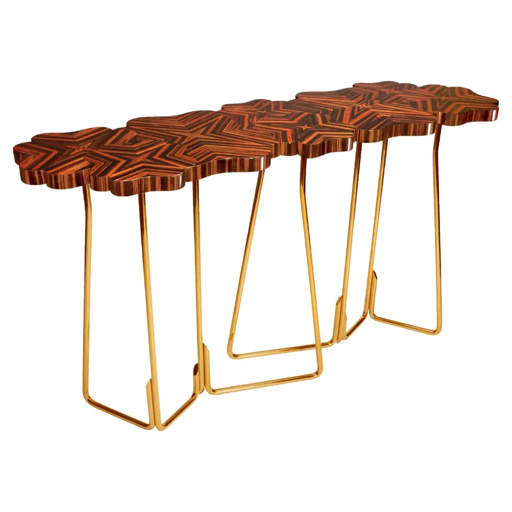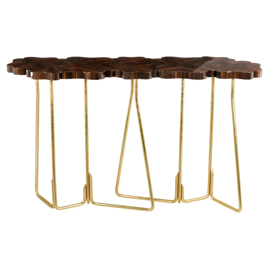 Four\. For Luck Ebony Console by InsidherLand Dimensions: D 45 x W 150 x H 90 cm. Materials: marquetry work in ebony veneer, solid polished brass. 50 kg. Also available in rosewood. Continuing the interpretation of the Legend of the four leaf clover materialized in the Four\. for Luck center table, this console with the same name explores the meaning of Luck in these peculiar plants. On the top made with exquisite ebony marquetry work, it is drawn an intentional chaos under which each four leaf clover is only revealed only with a careful look. The clovers seem to strive for a major role, overlapping imaginarily on a common plan. Purposely, none clover stands out and we find the beauty in this organic and anonymous set. Starting with the elegance of these plants removed from the land, their original proportion is emphasized with total freedom. The long stems in polished brass acquire enormous proportions that appear to invent a wavy dance that unites them, making them stronger parts of a whole. Unlike the lack of four-leaf clovers, this delicate console offers the viewer the experience of a reflection on the power of the meaning of the fourth leaf which is so abundant here. If one day we found a garden populated by such mystical amulets, the power of the fourth leaf would never again be a prize offered by chance and Luck would become an element of personal achievement obtained through the watchful eye of each one of us. Created by Architect Joana Santos Barbosa in 2012, InsidherLand is a Portuguese brand of exclusive design. Drawn with the signature of the creator, the impressive range of contemporary luxury furniture, lighting, upholstery and accessories are connected to her personal memories and have been highlighted for their innovative and soulful designs. Joana explores several influences from travels around the world to define her own Land as a place that allows her to translate her perceptions into objects of art. The essence of InsidherLand is presented by two inspiring collections. Beyond Memory Collection is deeply influenced by organic forms of nature, legends and traditional cultures, as for the Identity Collection is molded by forms of Architecture and Art. Both collections are designed as a dialog in which nature meets strong architectural lines to create relaxed and sophisticated interiors surrounded by natural materials and meaningful art pieces. Being positioned in strategic markets of high-end luxury decoration, InsidherLand team is proud of working with the best architects and interior design studios from all over the world who seek for handmade exclusive objects that arouse emotions and stand out in exquisite spaces. We are dedicated with love and enthusiasm into every creation to surprise a sensitive but demanding public. Using the expertise of traditional craft techniques, all creations are made by the hands of Portuguese master craftsmen and jewelers who wisely sculpt them in noble materials, finalizing every detail with elegance and perfection.