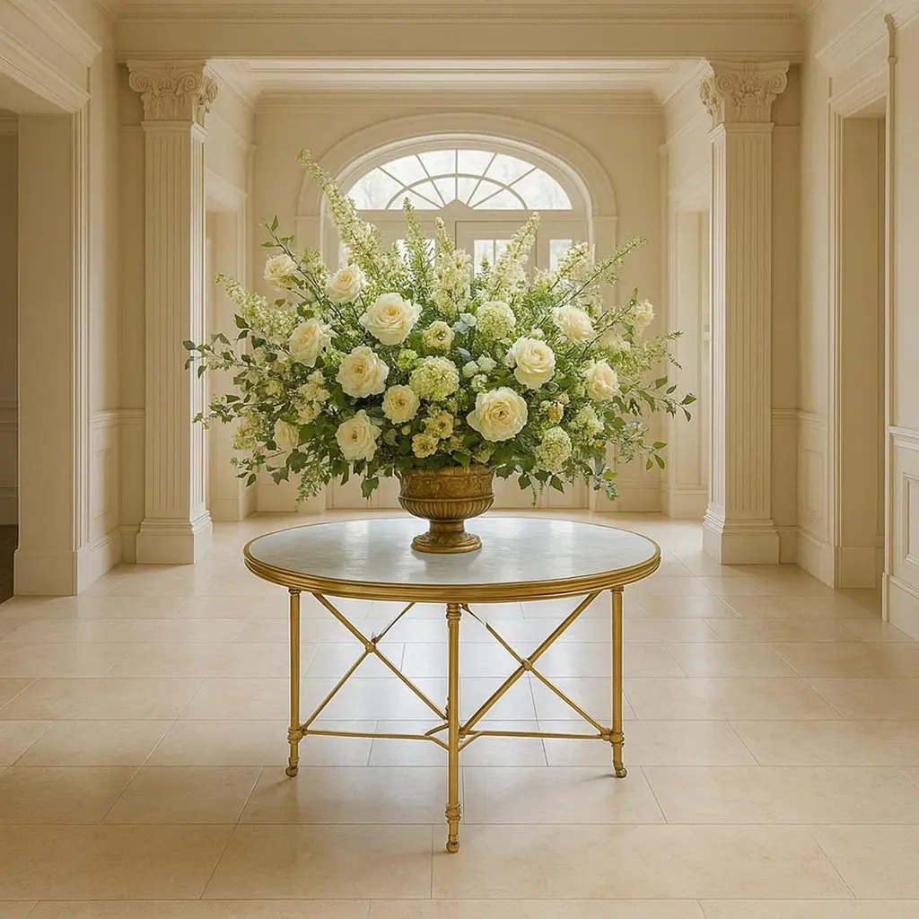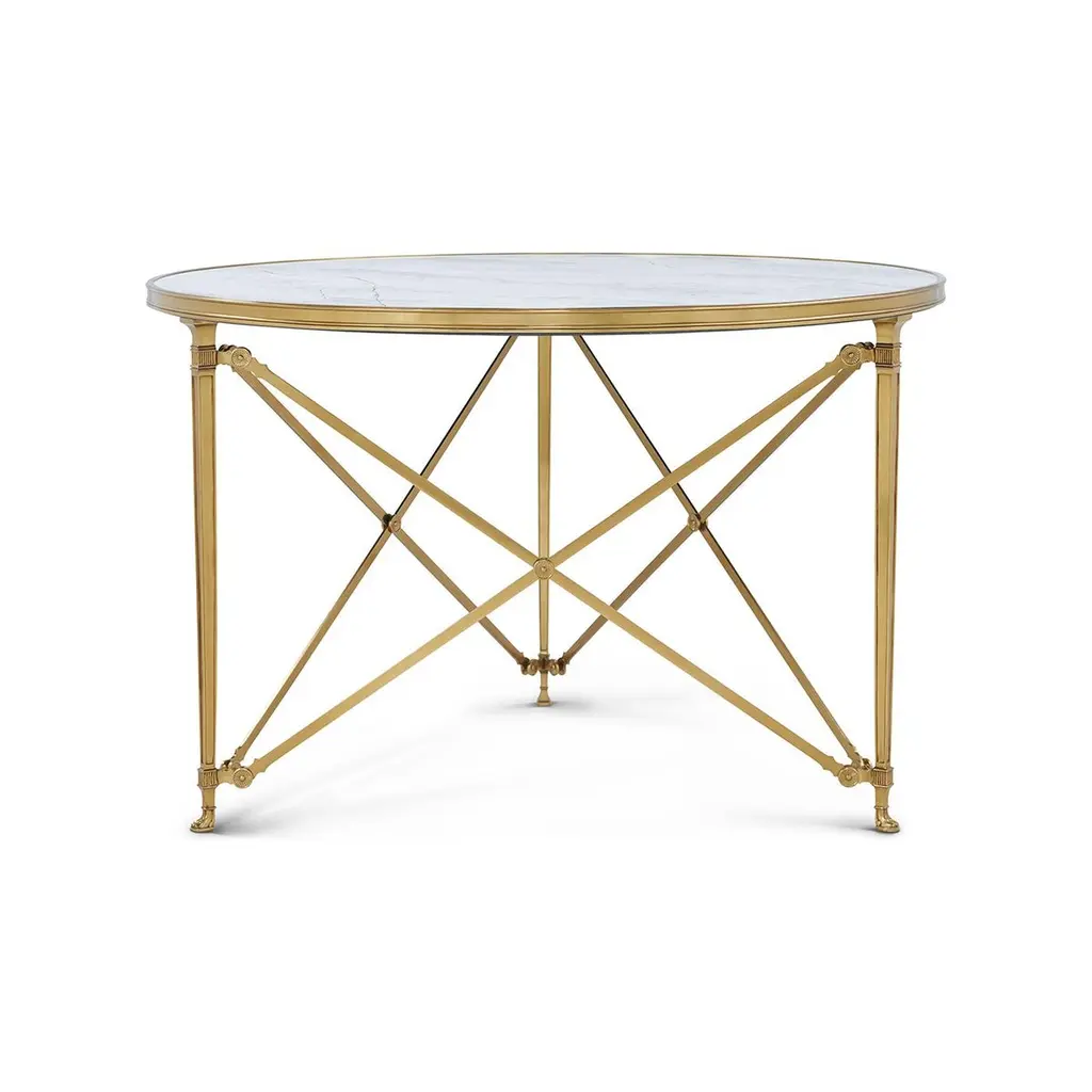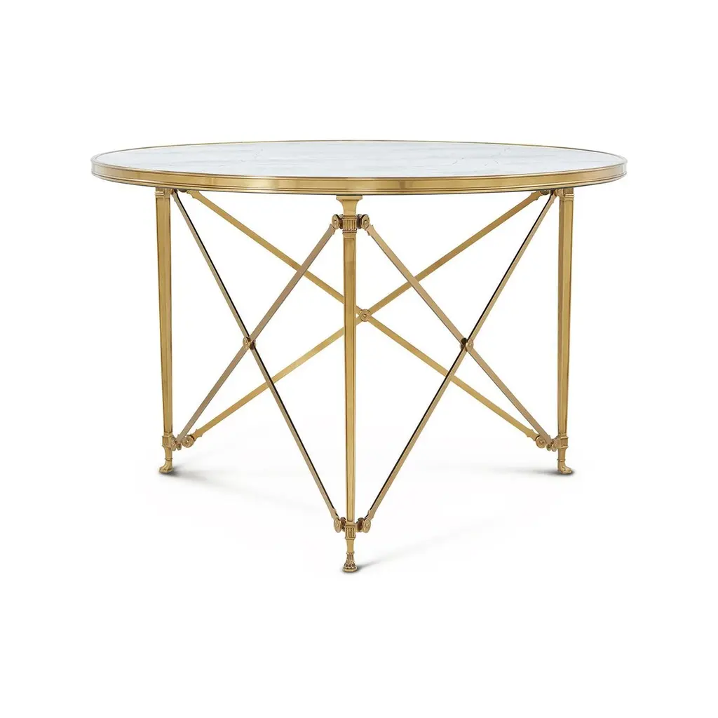 Early 19th-century French design anchored by a sleek quartz top with a refined moulded surround and elegant canted corners, this table blends architectural grace with timeless luxury. The cast brass frame features tapering legs ending in stylized paw feet—a definitive mark of Empire aesthetics—creating a commanding silhouette that elevates any hallway, entry way or living space.An X-frame stretcher system unites the base in perfect symmetry, adorned with roundel medallions for a classical flourish. Decorative yet highly functional, the table balances ornamental restraint and structural clarity. Ideal for traditional interiors with a taste for grandeur, this piece offers heirloom-quality craftsmanship with a regal sensibility.Dimensions: 45" W x 45" D x 29.5" H