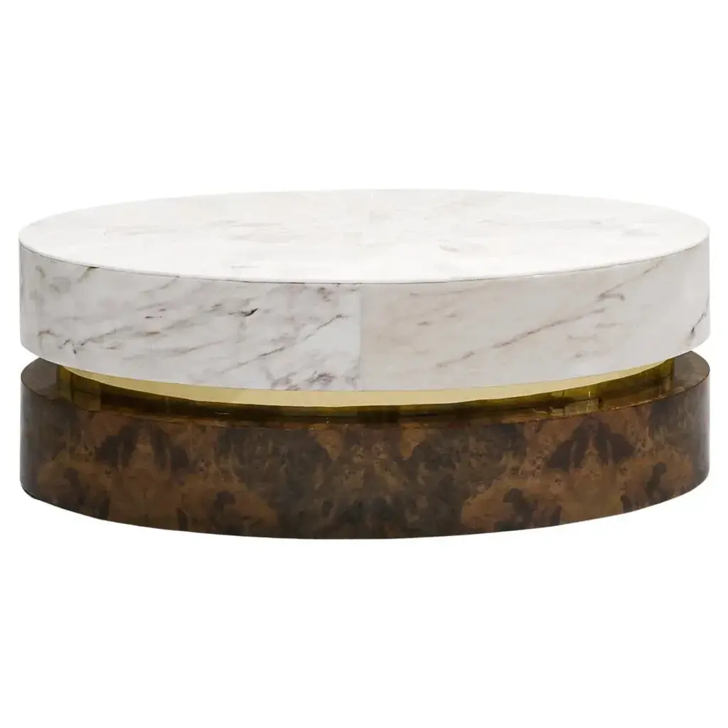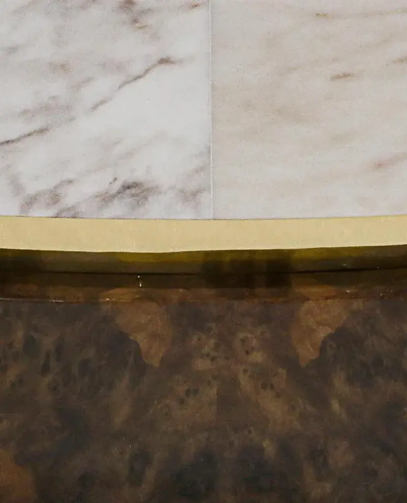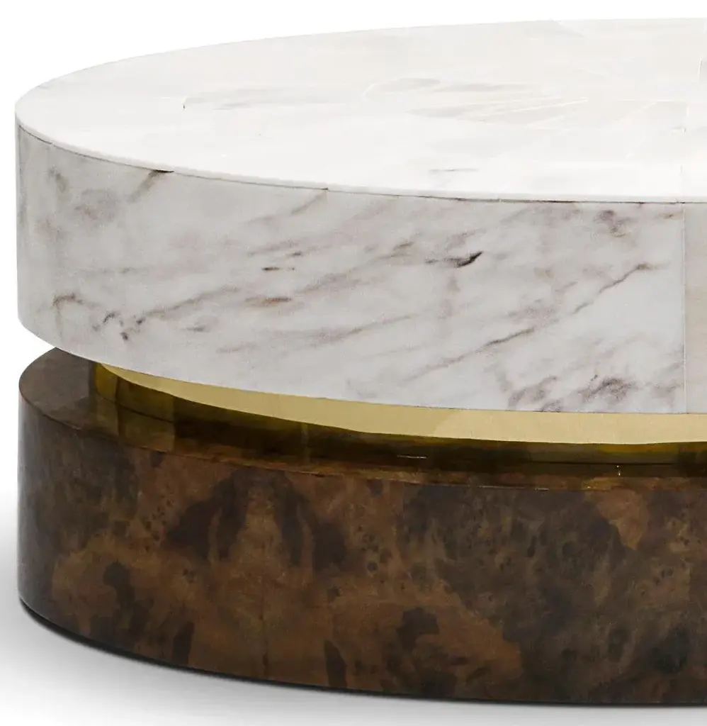 Infinity Center Table by Memoir Essence Dimensions: D 53 x W 100 x H 35 cm. Materials: Polished brass, walnut root and white marble. Also available in brushed brass. This center table presents an exquisite material selection that makes it unique for the wood texture and marble imponent look. Infinity center table is perfect for your living or bedroom. Memoir Essence Interiors has been writing its memoirs day by day, inspired in every detail lived through a feminine world, this world brings the most delicate imaginary. Jewelry, fashion, architecture, music, art and materials are Memoir’s inspirations to materialize a collection of design pieces of furniture, upholstery, lighting and accessories.