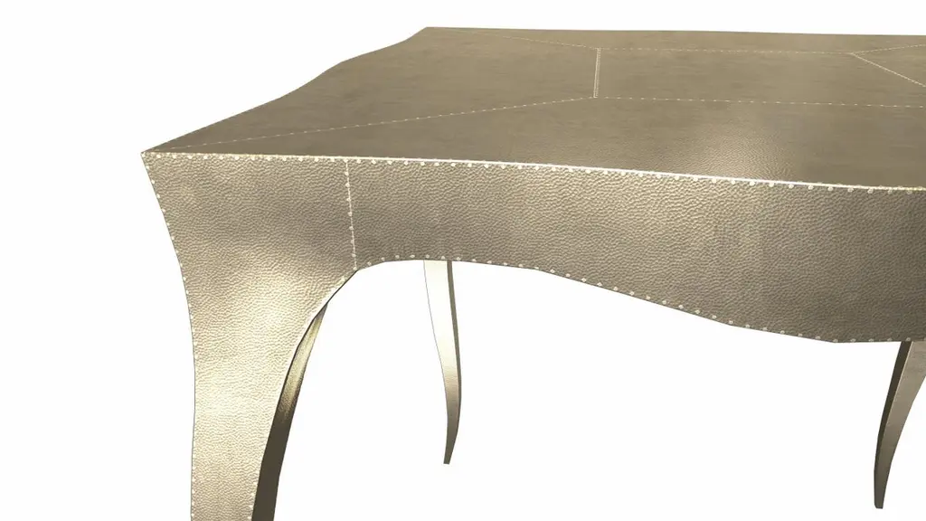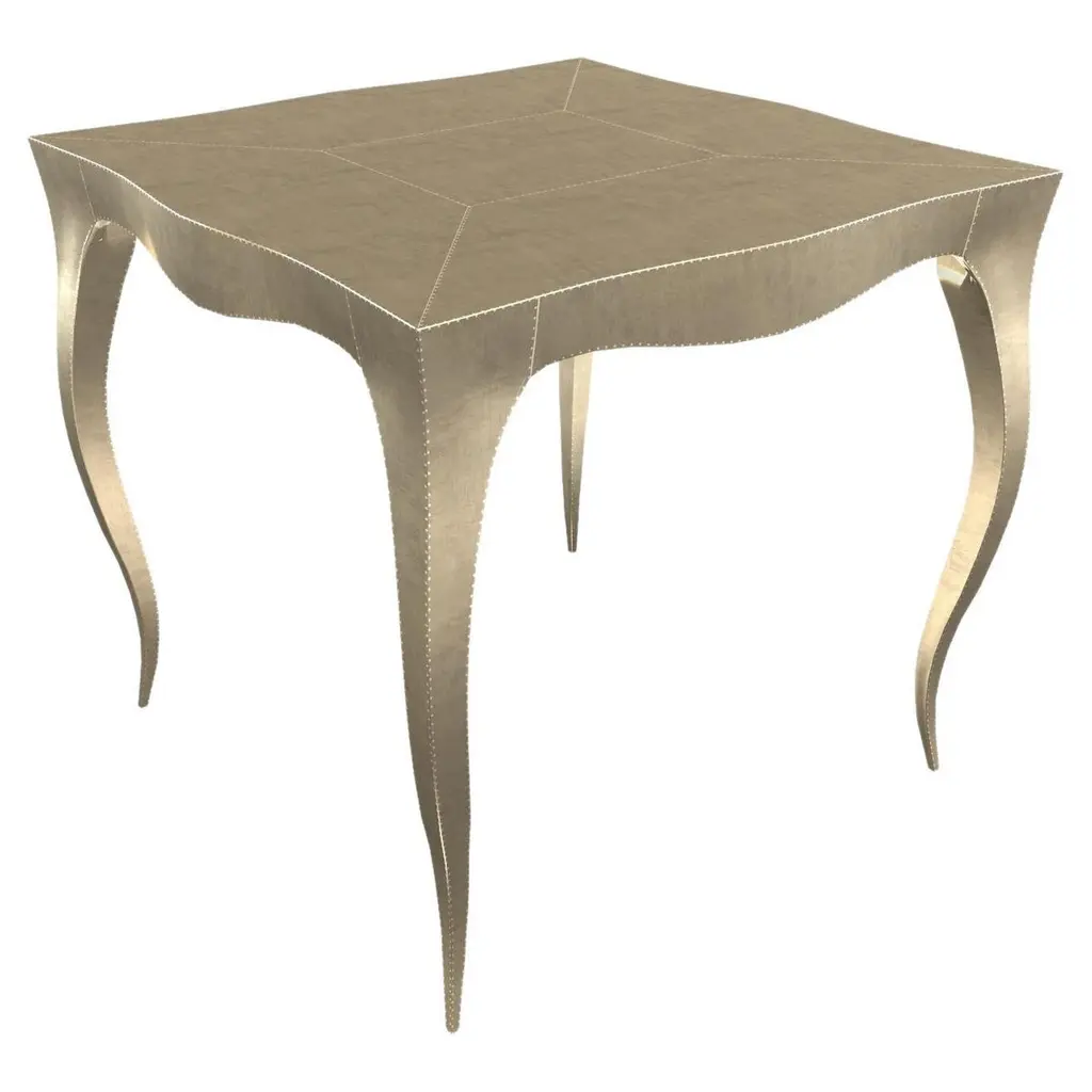 Louis Card Tables from our Louise Collection. The renowned designer Paul Mathieu chose the name “Louise” when he created his more feminine version of Louis XV (1730-1760) furniture. The characteristic cabriole leg, curving outward at the knee and inward towards the foot in an "S" shape was born during this period. It is during the same era that English furniture makers produced the Queen Anne and Chippendale styles.Crafted with utmost care and attention to detail, these Louis Card Tables are made to order and are available in twelve metal clad finishes, ensuring that you can choose the perfect one to match your individual style and taste. The use of high-quality materials and expert craftsmanship ensure that each Art Deco Louis Card Tables is not only beautiful but also a true piece of art.The curved legs and side arms of this Art Deco Louis Card Tables are hand carved from solid pieces of teak. Pattern makers trace and cut complex forms that will cover the chair in a skin of copper, white bronze, brass or antiqued white bronze The metal finishes will tarnish over time. Regular non-abrasive household metal polishes can be used to restore the original luster.Overall, if you're looking for a piece of furniture that combines luxury, comfort, and style, then the Art Deco Card Tables is an excellent choice. With its distinctive curved profile and multiple finish options, this Chair set is sure to elevate the look of any room it is placed in, and be a beloved addition to your home for years to come.The images shown in this listing are shot in different lighting conditions and/or are 3D illustrations. We encourage our customers to please request a sample or a full sample set of 12 finishes so that they can experience the finish first hand. Louise Art Deco Center Tables Mid. Hammered Brass by Paul Mathieu for Stephanie OdegardSize- 32"x 32"x 30"HMaterials - White Bronze, Metal sheet, Teak, Wood, MetalTechniques: Hand-Crafted, Hand-Carved, Metal Work, Wood Work, Metal Wrapping, PolishedPlease note that moisture in air, sudden change in temperature and natural movement of wood over time causes the metal to wrinkle or bubble up. We use well seasoned, reclaimed teak and high quality marine grade MDF (wherever technically possible) to avoid and delay the mentioned changes. However a perfect stability of metal cannot be guaranteed. Please note that our smooth finish metal clad pieces will have some unavoidable tool marks. This is proof that everything is done by hand. The smooth finish will not come out like a machine made perfect surface and the master artisan will do their best to make it look as good/clean/stable/perfect as he possibly can.The antique white bronze finish is hand done by using an acidic chemical over the white bronze finish to recreate a natural patination. Like with the natural patination of silver, copper, or brass, the final result and color uniformity of the patina cannot be guaranteed. The goal of this finish is to achieve rainbow-like shades with dull, shiny, cloudy, and streaky patches to give an illusion of antiquing. Please note:None of our metal clad pieces are treated with a protective “finish” thus enabling the items to age naturally over time. We will of course polish them well before we pack them. a) Copper oxidizes faster than the other metals. In six to twelve months it will most likely lose its shine and will gradually turn to different shades of brown and/or green/blue. This aging process and its effect is referred to as verdigris. After a year the piece should not change much more. Copper does not rust, but does require periodic cleaning in order to retain its original shine if that the preferred option. ('BRASSO' or any known copper polish can be used to polish copper).b) Brass retains its shine for far longer than others, but will tarnish if not cleaned on occasion. ('BRASSO' is made to polish brass).c) White bronze, has the least tendency to show age or tarnish. If kept in a controlled climate, this metal will hold its shine for years. It can be cleaned with a cleanser and polished with a cloth. d) The antiqued white bronze finish will react with the natural elements the fastest in the beginning but it too will stop reacting and will settle down in a stable state like copper after 6-12 months. Since it is already antiqued and looked like it is tarnished, as described in an earlier message, this fast reaction will not change the over all look. In that way this surface is most forgiving. The images shown in this listing are shot in different lighting conditions and/or are 3D illustrations. We encourage our customers to please request a sample or a full sample set of 12 finishes so that they can experience the finish first hand.