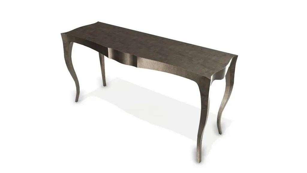 Louise Console Table from our Louise Collection. The renowned designer Paul Mathieu chose the name “Louise” when he created his more feminine version of Louis XV (1730-1760) furniture. The characteristic cabriole leg, curving outward at the knee and inward towards the foot in an "S" shape was born during this period. It is during the same era that English furniture makers produced the Queen Anne and Chippendale styles.Crafted with utmost care and attention to detail, these Louis Card Tables are made to order and are available in twelve metal clad finishes, ensuring that you can choose the perfect one to match your individual style and taste. The use of high-quality materials and expert craftsmanship ensure that each Art Deco Louis Card Tables is not only beautiful but also a true piece of Art.The curved legs and side arms of this Art Deco Louis Card Tables are hand carved from solid pieces of teak. Pattern makers trace and cut complex forms that will cover the chair in a skin of copper, white bronze, brass or antiqued white bronze The metal finishes will tarnish over time. Regular non-abrasive household metal polishes can be used to restore the original luster.Overall, if you're looking for a piece of furniture that combines luxury, comfort, and style, then the Art Deco Card Tables is an excellent choice. With its distinctive curved profile and multiple finish options, this Chair set is sure to elevate the look of any room it is placed in, and be a beloved addition to your home for years to come.The images shown in this listing are shot in different lighting conditions and/or are 3D illustrations. We encourage our customers to please request a sample or a full sample set of 12 finishes so that they can experience the finish first hand. Louise Console Art Deco Center Tables Fine Hammered Antique Bronze by Paul Mathieu for Stephanie OdegardSize- 60"x 18.5"x 30"HMaterials - Antique Bronze, Metal sheet, Teak, Wood, MetalTechniques: Hand-Crafted, Hand-Carved, Metal Work, Wood Work, Metal Wrapping, PolishedPlease note that moisture in air, sudden change in temperature and natural movement of wood over time causes the metal to wrinkle or bubble up. We use well seasoned, reclaimed teak and high quality marine grade MDF (wherever technically possible) to avoid and delay the mentioned changes. However a perfect stability of metal cannot be guaranteed. Please note that our smooth finish metal clad pieces will have some unavoidable tool marks. This is proof that everything is done by hand. The smooth finish will not come out like a machine made perfect surface and the master Artisan will do their best to make it look as good/clean/stable/perfect as he possibly can.The antique white bronze finish is hand done by using an acidic chemical over the white bronze finish to recreate a natural patination. Like with the natural patination of silver, copper, or brass, the final result and color uniformity of the patina cannot be guaranteed. The goal of this finish is to achieve rainbow-like shades with dull, shiny, cloudy, and streaky patches to give an illusion of antiquing. Please note:None of our metal clad pieces are treated with a protective “finish” thus enabling the items to age naturally over time. We will of course polish them well before we pack them. a) Copper oxidizes faster than the other metals. In six to twelve months it will most likely lose its shine and will gradually turn to different shades of brown and/or green/blue. This aging process and its effect is referred to as verdigris. After a year the piece should not change much more. Copper does not rust, but does require periodic cleaning in order to retain its original shine if that the preferred option. ('BRASSO' or any known copper polish can be used to polish copper).b) Brass retains its shine for far longer than others, but will tarnish if not cleaned on occasion. ('BRASSO' is made to polish brass).c) White bronze, has the least tendency to show age or tarnish. If kept in a controlled climate, this metal will hold its shine for years. It can be cleaned with a cleanser and polished with a cloth. d) The antiqued white bronze finish will react with the natural elements the fastest in the beginning but it too will stop reacting and will settle down in a stable state like copper after 6-12 months. Since it is already antiqued and looked like it is tarnished, as described in an earlier message, this fast reaction will not change the over all look. In that way this surface is most forgiving. The images shown in this listing are shot in different lighting conditions and/or are 3D illustrations. We encourage our customers to please request a sample or a full sample set of 12 finishes so that they can experience the finish first hand.