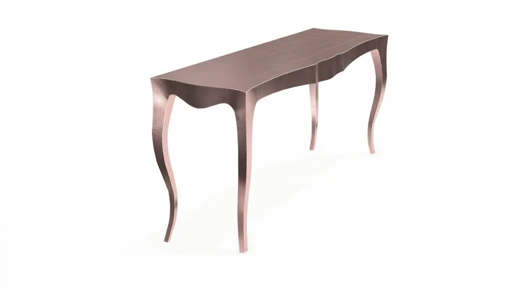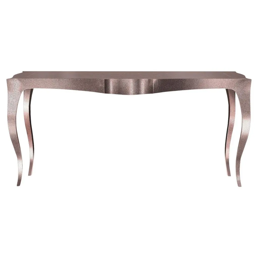 Louise Console Table from our Louise Collection. The renowned designer Paul Mathieu chose the name “Louise” when he created his more feminine version of Louis XV (1730-1760) furniture. The characteristic cabriole leg, curving outward at the knee and inward towards the foot in an "S" shape was born during this period. It is during the same era that English furniture makers produced the Queen Anne and Chippendale styles.Crafted with utmost care and attention to detail, these Louis Card Tables are made to order and are available in twelve metal clad finishes, ensuring that you can choose the perfect one to match your individual style and taste. The use of high-quality materials and expert craftsmanship ensure that each Art Deco Louis Card Tables is not only beautiful but also a true piece of Art.The curved legs and side arms of this Art Deco Louis Card Tables are hand carved from solid pieces of teak. Pattern makers trace and cut complex forms that will cover the chair in a skin of copper, white bronze, brass or antiqued white bronze The metal finishes will tarnish over time. Regular non-abrasive household metal polishes can be used to restore the original luster.Overall, if you're looking for a piece of furniture that combines luxury, comfort, and style, then the Art Deco Card Tables is an excellent choice. With its distinctive curved profile and multiple finish options, this Chair set is sure to elevate the look of any room it is placed in, and be a beloved addition to your home for years to come.The images shown in this listing are shot in different lighting conditions and/or are 3D illustrations. We encourage our customers to please request a sample or a full sample set of 12 finishes so that they can experience the finish first hand. Louise Console Art Deco Center Tables Fine Hammered Copper by Paul Mathieu for Stephanie OdegardSize- 60"x 18.5"x 30"HMaterials - Copper, Metal sheet, Teak, Wood, MetalTechniques: Hand-Crafted, Hand-Carved, Metal Work, Wood Work, Metal Wrapping, PolishedPlease note that moisture in air, sudden change in temperature and natural movement of wood over time causes the metal to wrinkle or bubble up. We use well seasoned, reclaimed teak and high quality marine grade MDF (wherever technically possible) to avoid and delay the mentioned changes. However a perfect stability of metal cannot be guaranteed. Please note that our smooth finish metal clad pieces will have some unavoidable tool marks. This is proof that everything is done by hand. The smooth finish will not come out like a machine made perfect surface and the master Artisan will do their best to make it look as good/clean/stable/perfect as he possibly can.The antique white bronze finish is hand done by using an acidic chemical over the white bronze finish to recreate a natural patination. Like with the natural patination of silver, copper, or brass, the final result and color uniformity of the patina cannot be guaranteed. The goal of this finish is to achieve rainbow-like shades with dull, shiny, cloudy, and streaky patches to give an illusion of antiquing. Please note:None of our metal clad pieces are treated with a protective “finish” thus enabling the items to age naturally over time. We will of course polish them well before we pack them. a) Copper oxidizes faster than the other metals. In six to twelve months it will most likely lose its shine and will gradually turn to different shades of brown and/or green/blue. This aging process and its effect is referred to as verdigris. After a year the piece should not change much more. Copper does not rust, but does require periodic cleaning in order to retain its original shine if that the preferred option. ('BRASSO' or any known copper polish can be used to polish copper).b) Brass retains its shine for far longer than others, but will tarnish if not cleaned on occasion. ('BRASSO' is made to polish brass).c) White bronze, has the least tendency to show age or tarnish. If kept in a controlled climate, this metal will hold its shine for years. It can be cleaned with a cleanser and polished with a cloth. d) The antiqued white bronze finish will react with the natural elements the fastest in the beginning but it too will stop reacting and will settle down in a stable state like copper after 6-12 months. Since it is already antiqued and looked like it is tarnished, as described in an earlier message, this fast reaction will not change the over all look. In that way this surface is most forgiving. The images shown in this listing are shot in different lighting conditions and/or are 3D illustrations. We encourage our customers to please request a sample or a full sample set of 12 finishes so that they can experience the finish first hand.