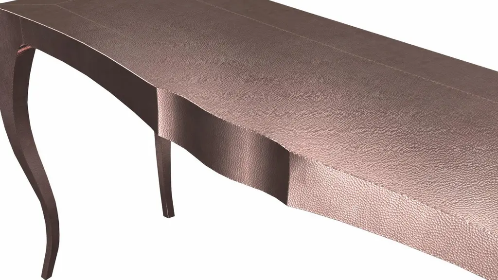 Louise Console Table from our Louise Collection. The renowned designer Paul Mathieu chose the name “Louise” when he created his more feminine version of Louis XV (1730-1760) furniture. The characteristic cabriole leg, curving outward at the knee and inward towards the foot in an "S" shape was born during this period. It is during the same era that English furniture makers produced the Queen Anne and Chippendale styles.Crafted with utmost care and attention to detail, these Louis Card Tables are made to order and are available in twelve metal clad finishes, ensuring that you can choose the perfect one to match your individual style and taste. The use of high-quality materials and expert craftsmanship ensure that each Art Deco Louis Card Tables is not only beautiful but also a true piece of Art.The curved legs and side arms of this Art Deco Louis Card Tables are hand carved from solid pieces of teak. Pattern makers trace and cut complex forms that will cover the chair in a skin of copper, white bronze, brass or antiqued white bronze The metal finishes will tarnish over time. Regular non-abrasive household metal polishes can be used to restore the original luster.Overall, if you're looking for a piece of furniture that combines luxury, comfort, and style, then the Art Deco Card Tables is an excellent choice. With its distinctive curved profile and multiple finish options, this Chair set is sure to elevate the look of any room it is placed in, and be a beloved addition to your home for years to come.The images shown in this listing are shot in different lighting conditions and/or are 3D illustrations. We encourage our customers to please request a sample or a full sample set of 12 finishes so that they can experience the finish first hand. Louise Console Art Deco Center Tables Mid. Hammered Copper by Paul Mathieu for Stephanie OdegardSize- 60"x 18.5"x 30"HMaterials - Copper, Metal sheet, Teak, Wood, MetalTechniques: Hand-Crafted, Hand-Carved, Metal Work, Wood Work, Metal Wrapping, PolishedPlease note that moisture in air, sudden change in temperature and natural movement of wood over time causes the metal to wrinkle or bubble up. We use well seasoned, reclaimed teak and high quality marine grade MDF (wherever technically possible) to avoid and delay the mentioned changes. However a perfect stability of metal cannot be guaranteed. Please note that our smooth finish metal clad pieces will have some unavoidable tool marks. This is proof that everything is done by hand. The smooth finish will not come out like a machine made perfect surface and the master Artisan will do their best to make it look as good/clean/stable/perfect as he possibly can.The antique white bronze finish is hand done by using an acidic chemical over the white bronze finish to recreate a natural patination. Like with the natural patination of silver, copper, or brass, the final result and color uniformity of the patina cannot be guaranteed. The goal of this finish is to achieve rainbow-like shades with dull, shiny, cloudy, and streaky patches to give an illusion of antiquing. Please note:None of our metal clad pieces are treated with a protective “finish” thus enabling the items to age naturally over time. We will of course polish them well before we pack them. a) Copper oxidizes faster than the other metals. In six to twelve months it will most likely lose its shine and will gradually turn to different shades of brown and/or green/blue. This aging process and its effect is referred to as verdigris. After a year the piece should not change much more. Copper does not rust, but does require periodic cleaning in order to retain its original shine if that the preferred option. ('BRASSO' or any known copper polish can be used to polish copper).b) Brass retains its shine for far longer than others, but will tarnish if not cleaned on occasion. ('BRASSO' is made to polish brass).c) White bronze, has the least tendency to show age or tarnish. If kept in a controlled climate, this metal will hold its shine for years. It can be cleaned with a cleanser and polished with a cloth. d) The antiqued white bronze finish will react with the natural elements the fastest in the beginning but it too will stop reacting and will settle down in a stable state like copper after 6-12 months. Since it is already antiqued and looked like it is tarnished, as described in an earlier message, this fast reaction will not change the over all look. In that way this surface is most forgiving. The images shown in this listing are shot in different lighting conditions and/or are 3D illustrations. We encourage our customers to please request a sample or a full sample set of 12 finishes so that they can experience the finish first hand.