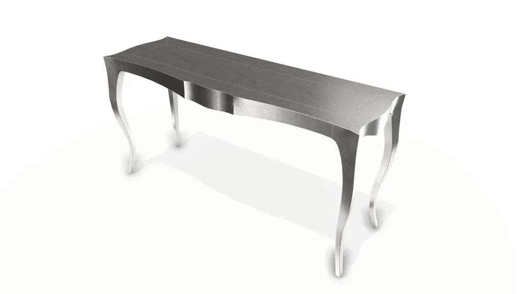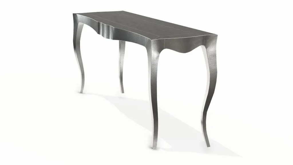 Louise Console Table from our Louise Collection. The renowned designer Paul Mathieu chose the name “Louise” when he created his more feminine version of Louis XV (1730-1760) furniture. The characteristic cabriole leg, curving outward at the knee and inward towards the foot in an "S" shape was born during this period. It is during the same era that English furniture makers produced the Queen Anne and Chippendale styles.Crafted with utmost care and attention to detail, these Louis Card Tables are made to order and are available in twelve metal clad finishes, ensuring that you can choose the perfect one to match your individual style and taste. The use of high-quality materials and expert craftsmanship ensure that each Art Deco Louis Card Tables is not only beautiful but also a true piece of Art.The curved legs and side arms of this Art Deco Louis Card Tables are hand carved from solid pieces of teak. Pattern makers trace and cut complex forms that will cover the chair in a skin of copper, white bronze, brass or antiqued white bronze The metal finishes will tarnish over time. Regular non-abrasive household metal polishes can be used to restore the original luster.Overall, if you're looking for a piece of furniture that combines luxury, comfort, and style, then the Art Deco Card Tables is an excellent choice. With its distinctive curved profile and multiple finish options, this Chair set is sure to elevate the look of any room it is placed in, and be a beloved addition to your home for years to come.The images shown in this listing are shot in different lighting conditions and/or are 3D illustrations. We encourage our customers to please request a sample or a full sample set of 12 finishes so that they can experience the finish first hand. Louise Console Art Deco Center Tables Mid. Hammered White Bronze by Paul Mathieu for Stephanie OdegardSize- 60"x 18.5"x 30"HMaterials - White Bronze, Metal sheet, Teak, Wood, MetalTechniques: Hand-Crafted, Hand-Carved, Metal Work, Wood Work, Metal Wrapping, PolishedPlease note that moisture in air, sudden change in temperature and natural movement of wood over time causes the metal to wrinkle or bubble up. We use well seasoned, reclaimed teak and high quality marine grade MDF (wherever technically possible) to avoid and delay the mentioned changes. However a perfect stability of metal cannot be guaranteed. Please note that our smooth finish metal clad pieces will have some unavoidable tool marks. This is proof that everything is done by hand. The smooth finish will not come out like a machine made perfect surface and the master Artisan will do their best to make it look as good/clean/stable/perfect as he possibly can.The antique white bronze finish is hand done by using an acidic chemical over the white bronze finish to recreate a natural patination. Like with the natural patination of silver, copper, or brass, the final result and color uniformity of the patina cannot be guaranteed. The goal of this finish is to achieve rainbow-like shades with dull, shiny, cloudy, and streaky patches to give an illusion of antiquing. Please note:None of our metal clad pieces are treated with a protective “finish” thus enabling the items to age naturally over time. We will of course polish them well before we pack them. a) Copper oxidizes faster than the other metals. In six to twelve months it will most likely lose its shine and will gradually turn to different shades of brown and/or green/blue. This aging process and its effect is referred to as verdigris. After a year the piece should not change much more. Copper does not rust, but does require periodic cleaning in order to retain its original shine if that the preferred option. ('BRASSO' or any known copper polish can be used to polish copper).b) Brass retains its shine for far longer than others, but will tarnish if not cleaned on occasion. ('BRASSO' is made to polish brass).c) White bronze, has the least tendency to show age or tarnish. If kept in a controlled climate, this metal will hold its shine for years. It can be cleaned with a cleanser and polished with a cloth. d) The antiqued white bronze finish will react with the natural elements the fastest in the beginning but it too will stop reacting and will settle down in a stable state like copper after 6-12 months. Since it is already antiqued and looked like it is tarnished, as described in an earlier message, this fast reaction will not change the over all look. In that way this surface is most forgiving. The images shown in this listing are shot in different lighting conditions and/or are 3D illustrations. We encourage our customers to please request a sample or a full sample set of 12 finishes so that they can experience the finish first hand.