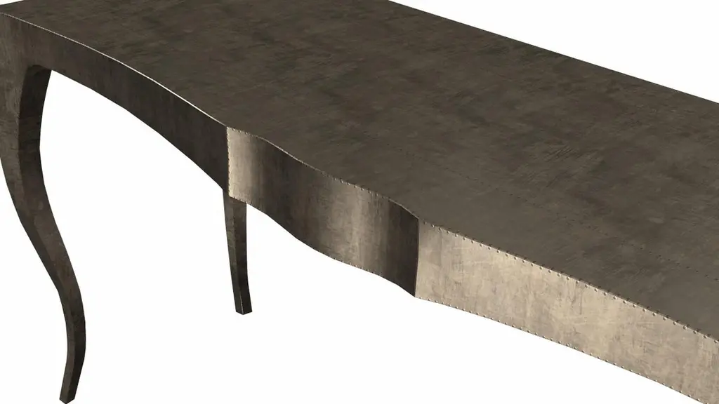 Louise Console Table from our Louise Collection. The renowned designer Paul Mathieu chose the name “Louise” when he created his more feminine version of Louis XV (1730-1760) furniture. The characteristic cabriole leg, curving outward at the knee and inward towards the foot in an "S" shape was born during this period. It is during the same era that English furniture makers produced the Queen Anne and Chippendale styles.Crafted with utmost care and attention to detail, these Louis Card Tables are made to order and are available in twelve metal clad finishes, ensuring that you can choose the perfect one to match your individual style and taste. The use of high-quality materials and expert craftsmanship ensure that each Art Deco Louis Card Tables is not only beautiful but also a true piece of Art.The curved legs and side arms of this Art Deco Louis Card Tables are hand carved from solid pieces of teak. Pattern makers trace and cut complex forms that will cover the chair in a skin of copper, white bronze, brass or antiqued white bronze The metal finishes will tarnish over time. Regular non-abrasive household metal polishes can be used to restore the original luster.Overall, if you're looking for a piece of furniture that combines luxury, comfort, and style, then the Art Deco Card Tables is an excellent choice. With its distinctive curved profile and multiple finish options, this Chair set is sure to elevate the look of any room it is placed in, and be a beloved addition to your home for years to come.The images shown in this listing are shot in different lighting conditions and/or are 3D illustrations. We encourage our customers to please request a sample or a full sample set of 12 finishes so that they can experience the finish first hand. Louise Console Art Deco Center Tables Smooth Antique Bronze by Paul Mathieu for Stephanie OdegardSize- 60"x 18.5"x 30"HMaterials - Antique Bronze, Metal sheet, Teak, Wood, MetalTechniques: Hand-Crafted, Hand-Carved, Metal Work, Wood Work, Metal Wrapping, PolishedPlease note that moisture in air, sudden change in temperature and natural movement of wood over time causes the metal to wrinkle or bubble up. We use well seasoned, reclaimed teak and high quality marine grade MDF (wherever technically possible) to avoid and delay the mentioned changes. However a perfect stability of metal cannot be guaranteed. Please note that our smooth finish metal clad pieces will have some unavoidable tool marks. This is proof that everything is done by hand. The smooth finish will not come out like a machine made perfect surface and the master Artisan will do their best to make it look as good/clean/stable/perfect as he possibly can.The antique white bronze finish is hand done by using an acidic chemical over the white bronze finish to recreate a natural patination. Like with the natural patination of silver, copper, or brass, the final result and color uniformity of the patina cannot be guaranteed. The goal of this finish is to achieve rainbow-like shades with dull, shiny, cloudy, and streaky patches to give an illusion of antiquing. Please note:None of our metal clad pieces are treated with a protective “finish” thus enabling the items to age naturally over time. We will of course polish them well before we pack them. a) Copper oxidizes faster than the other metals. In six to twelve months it will most likely lose its shine and will gradually turn to different shades of brown and/or green/blue. This aging process and its effect is referred to as verdigris. After a year the piece should not change much more. Copper does not rust, but does require periodic cleaning in order to retain its original shine if that the preferred option. ('BRASSO' or any known copper polish can be used to polish copper).b) Brass retains its shine for far longer than others, but will tarnish if not cleaned on occasion. ('BRASSO' is made to polish brass).c) White bronze, has the least tendency to show age or tarnish. If kept in a controlled climate, this metal will hold its shine for years. It can be cleaned with a cleanser and polished with a cloth. d) The antiqued white bronze finish will react with the natural elements the fastest in the beginning but it too will stop reacting and will settle down in a stable state like copper after 6-12 months. Since it is already antiqued and looked like it is tarnished, as described in an earlier message, this fast reaction will not change the over all look. In that way this surface is most forgiving. The images shown in this listing are shot in different lighting conditions and/or are 3D illustrations. We encourage our customers to please request a sample or a full sample set of 12 finishes so that they can experience the finish first hand.
